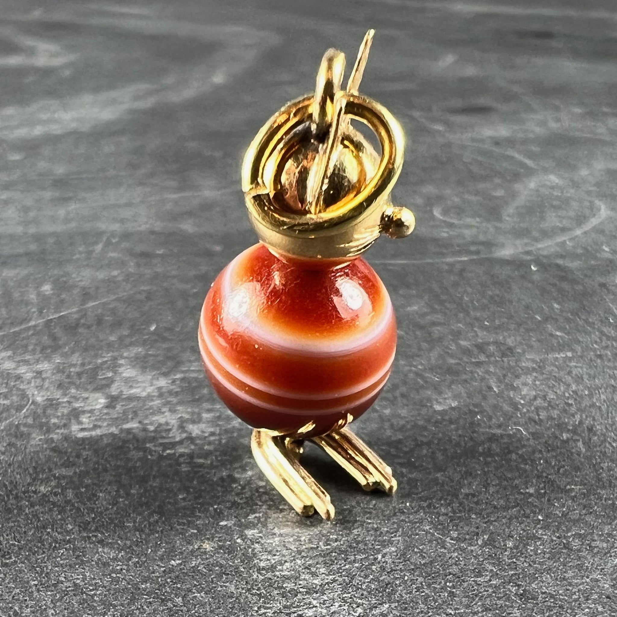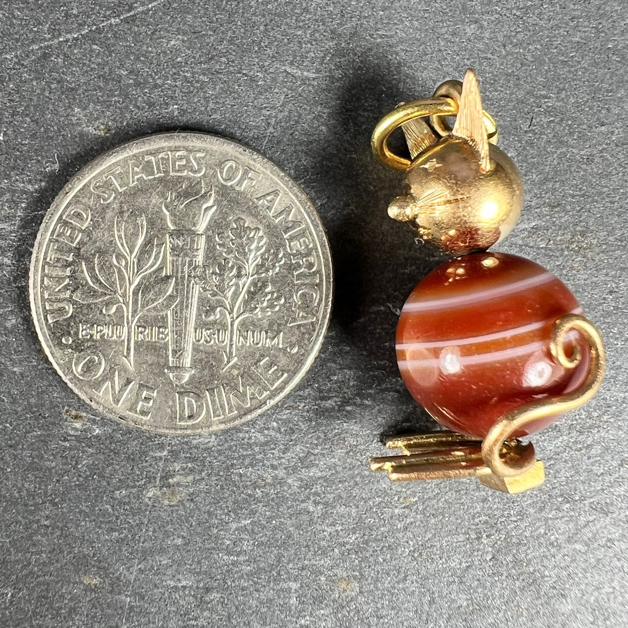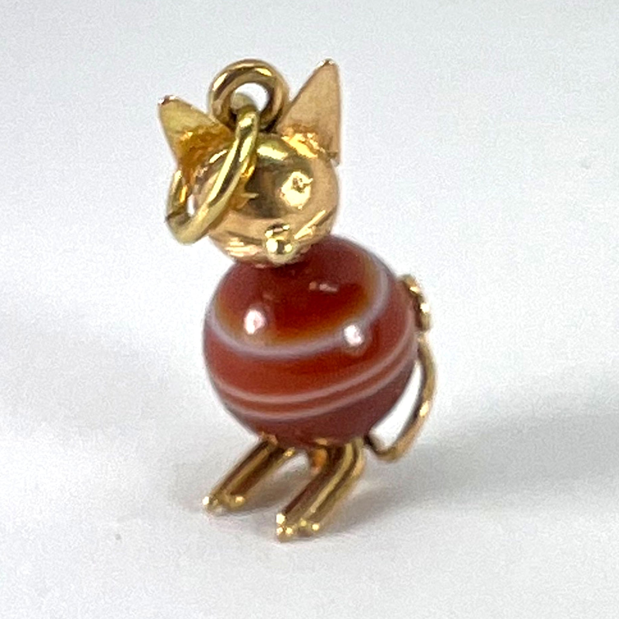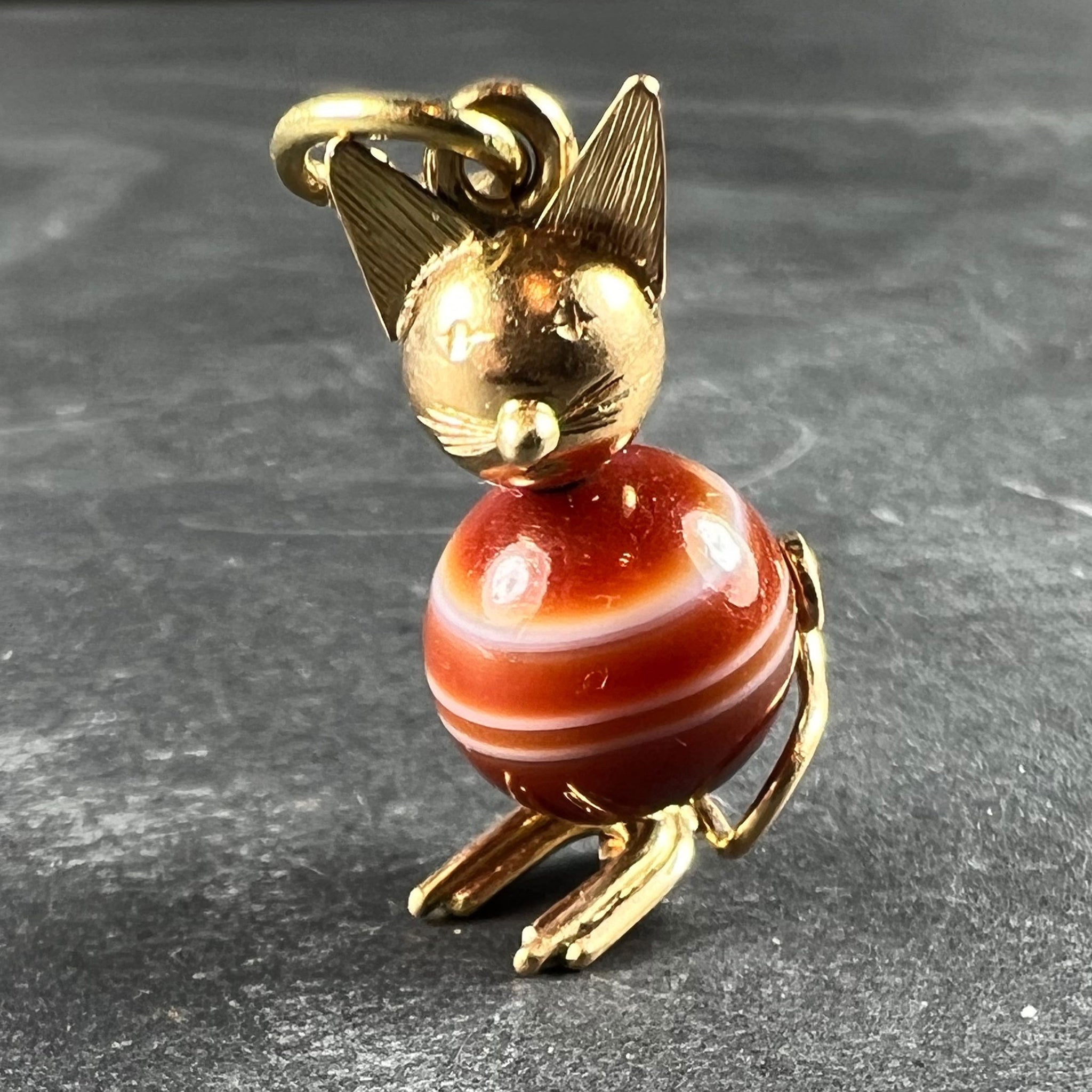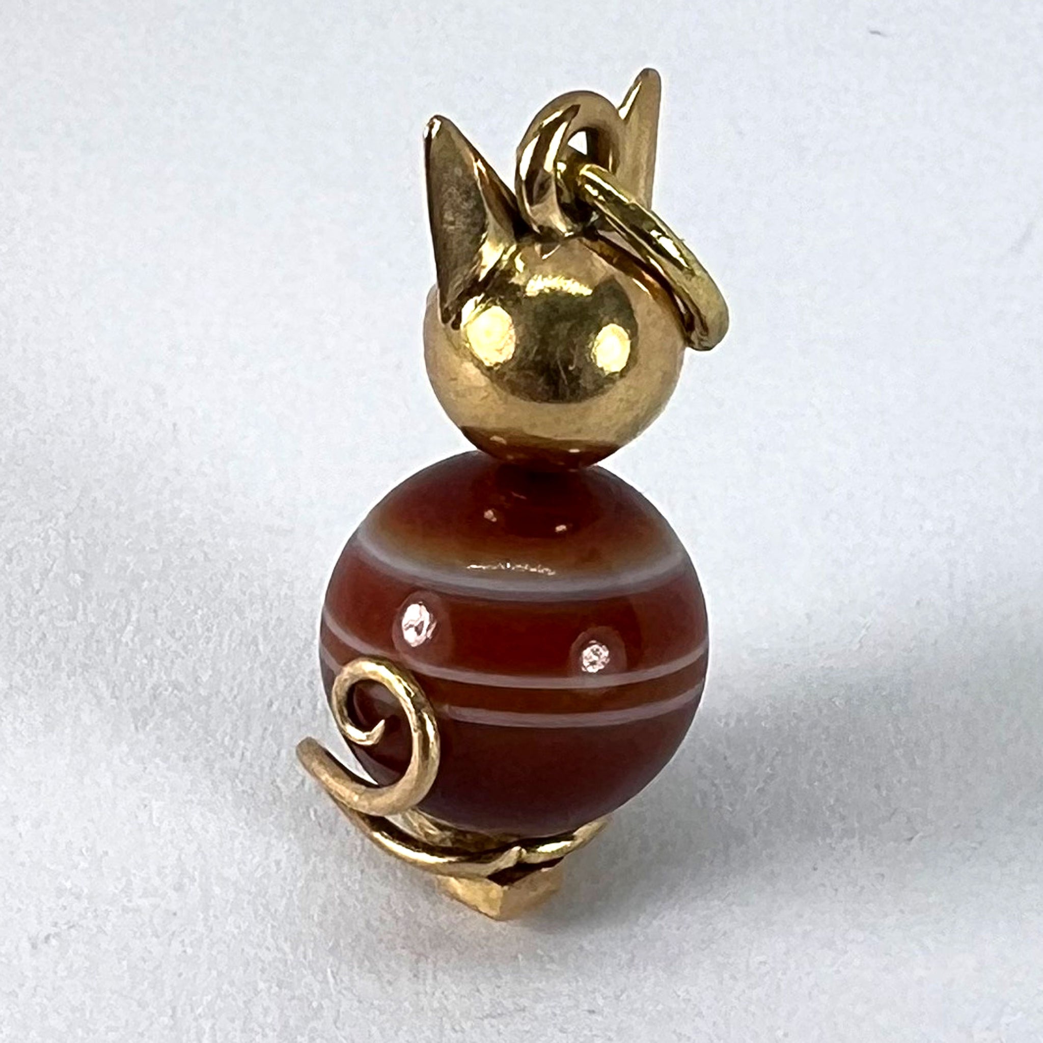 A vintage 18 karat (18K) and banded agate charm pendant designed as a sitting cat. The body is fashioned from a spherical bead of banded brown and white agate, with the head, paws and tail in 18 karat yellow gold. Unmarked but tested as 18 karat.
