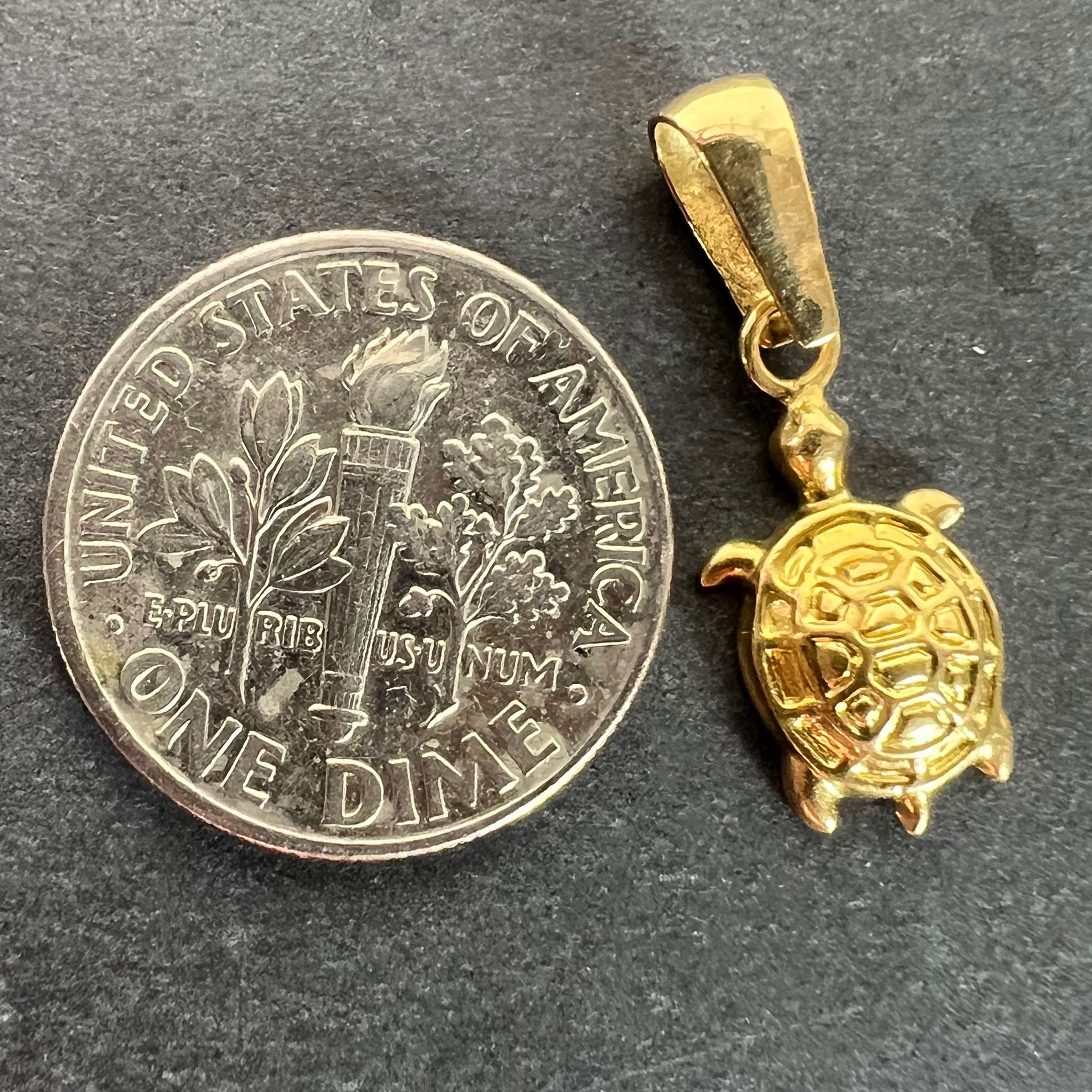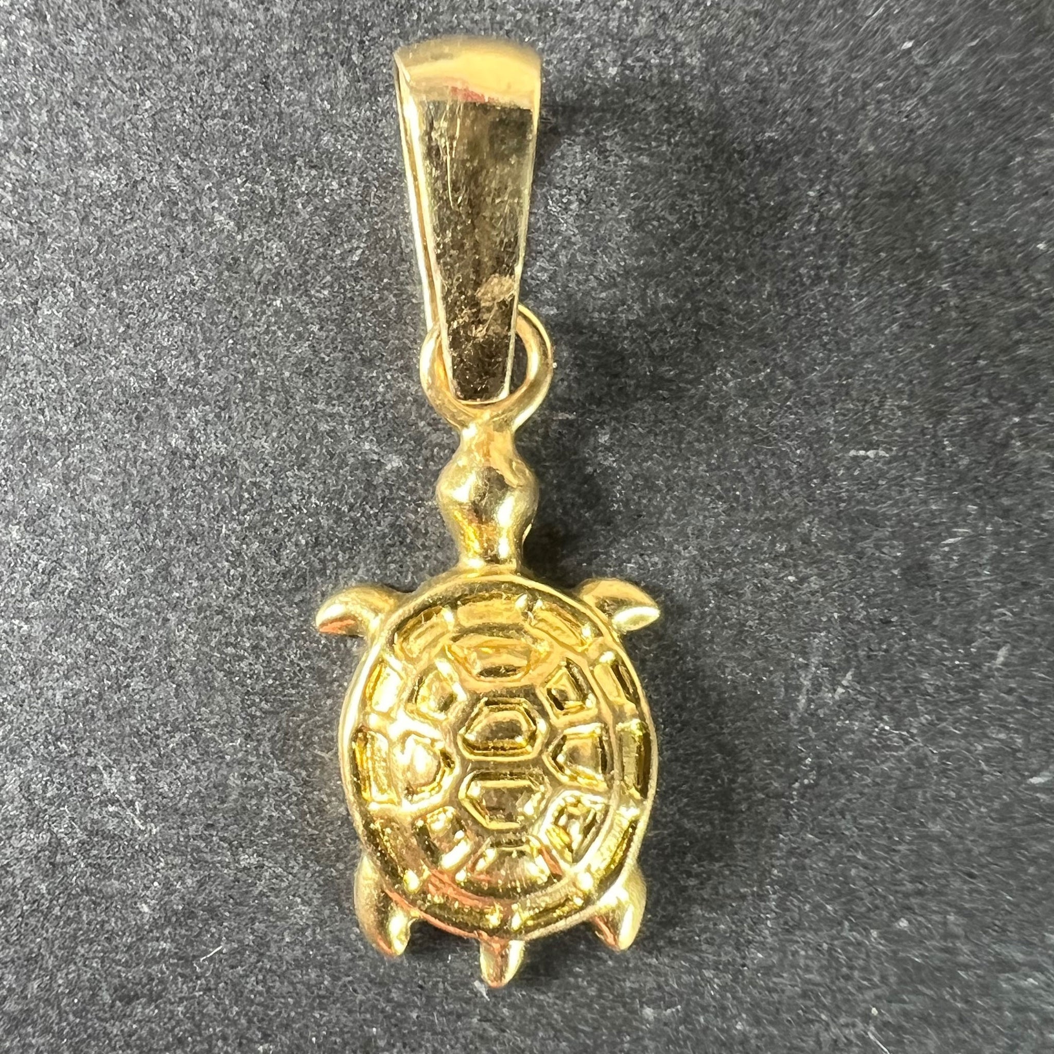 A vintage 18 karat (18K) yellow gold charm pendant designed as a tortoise or turtle. Marked 750 for 18 karat gold and numbered CO.077.
