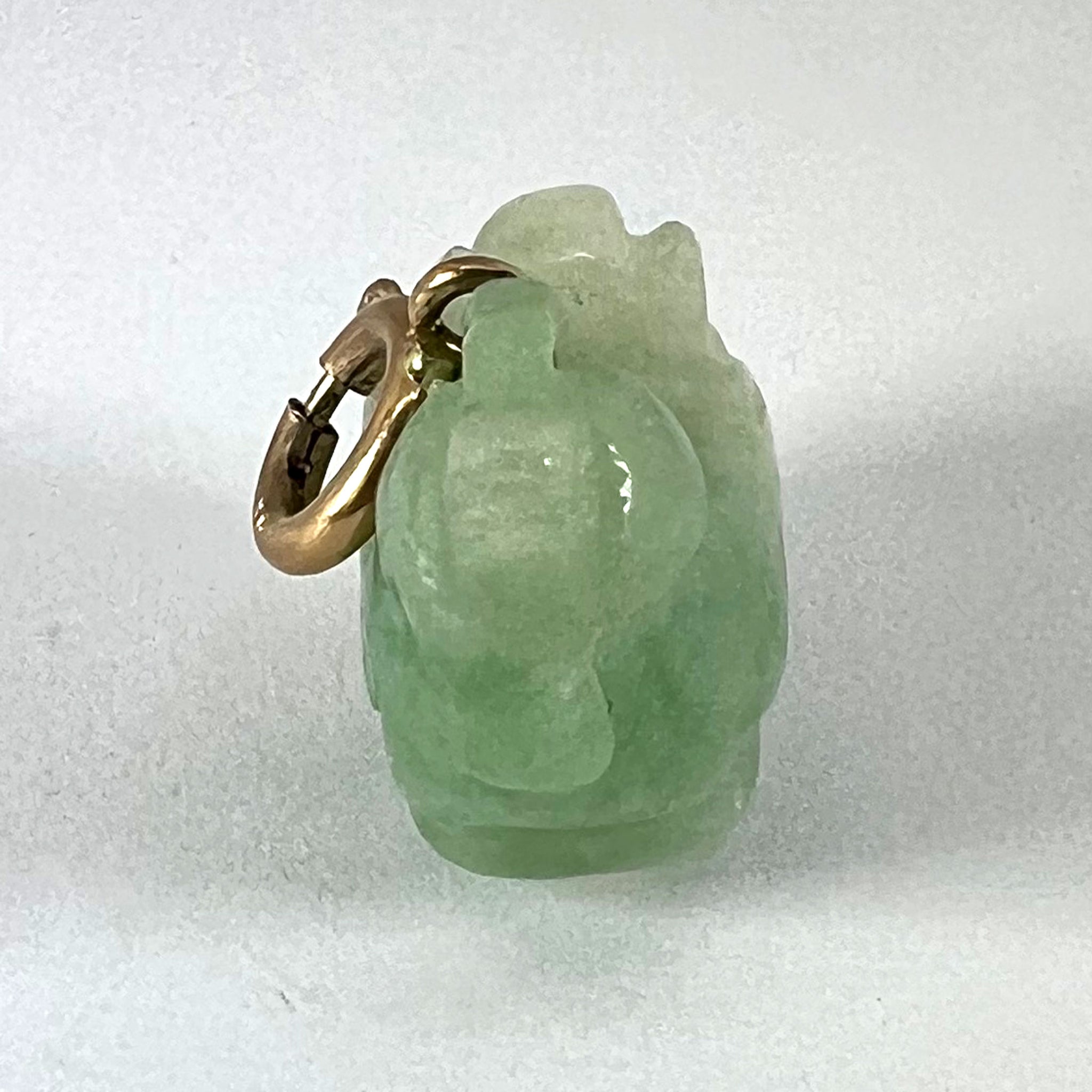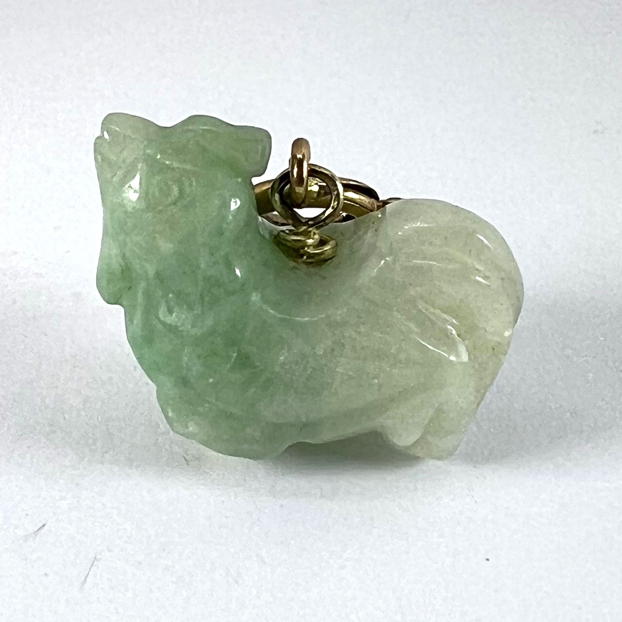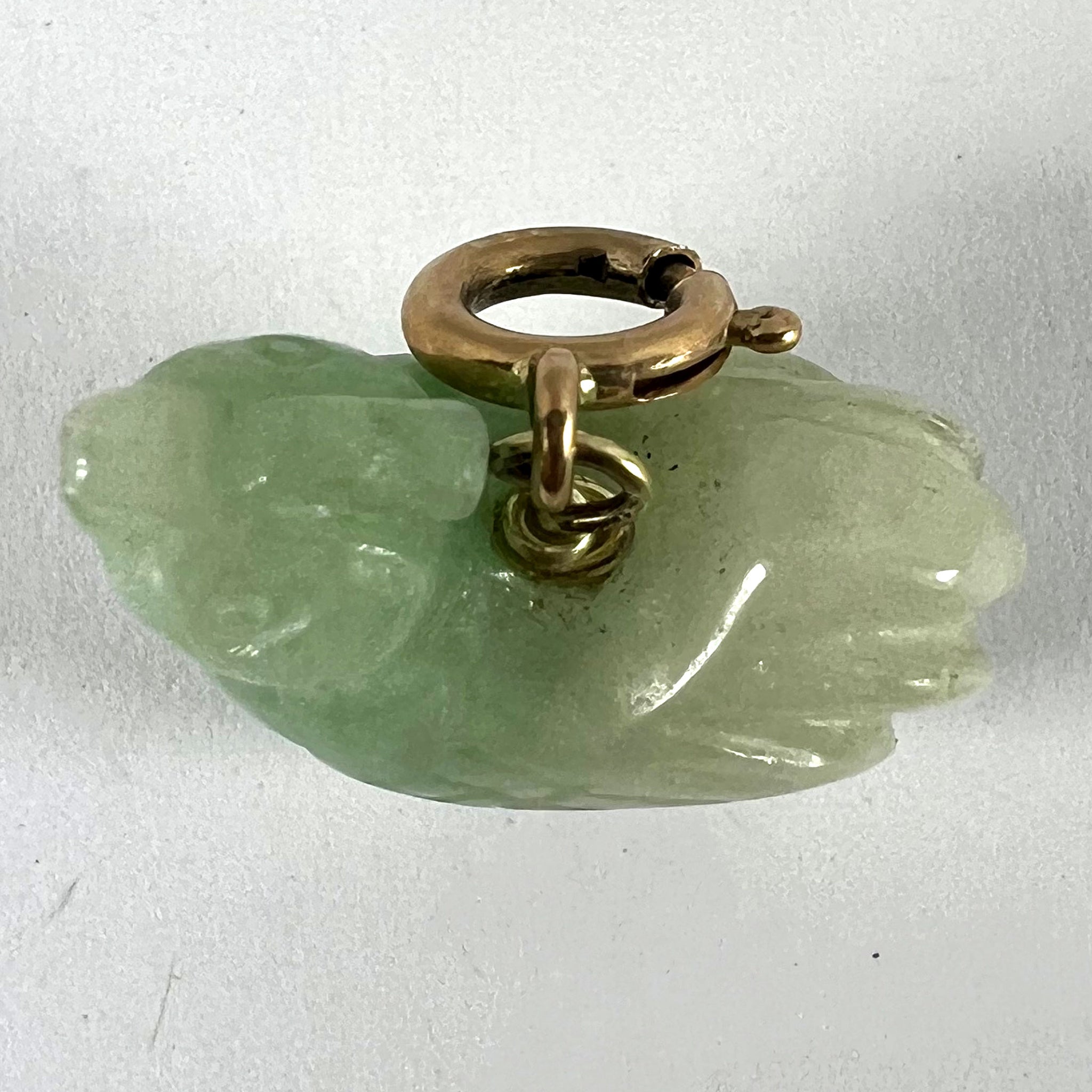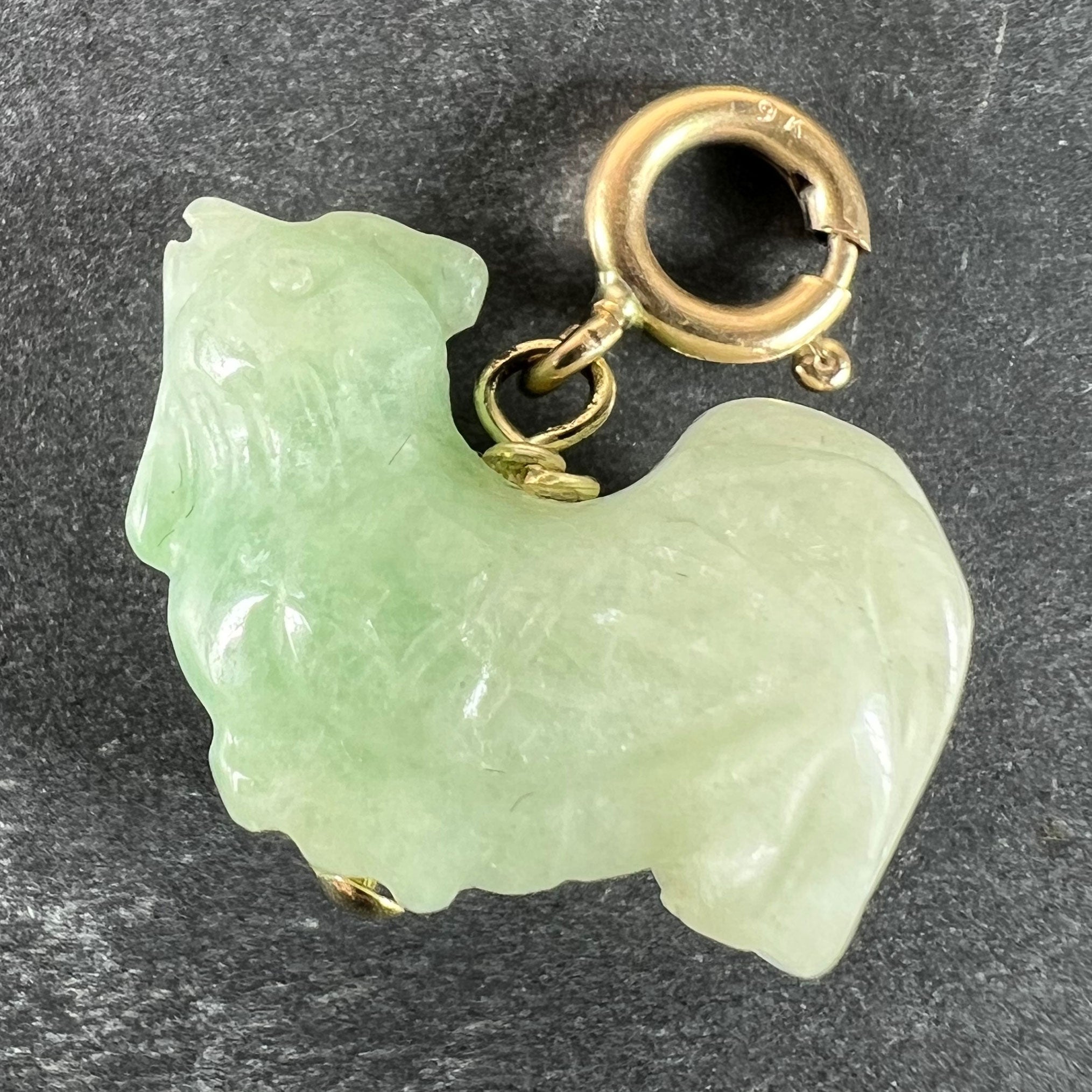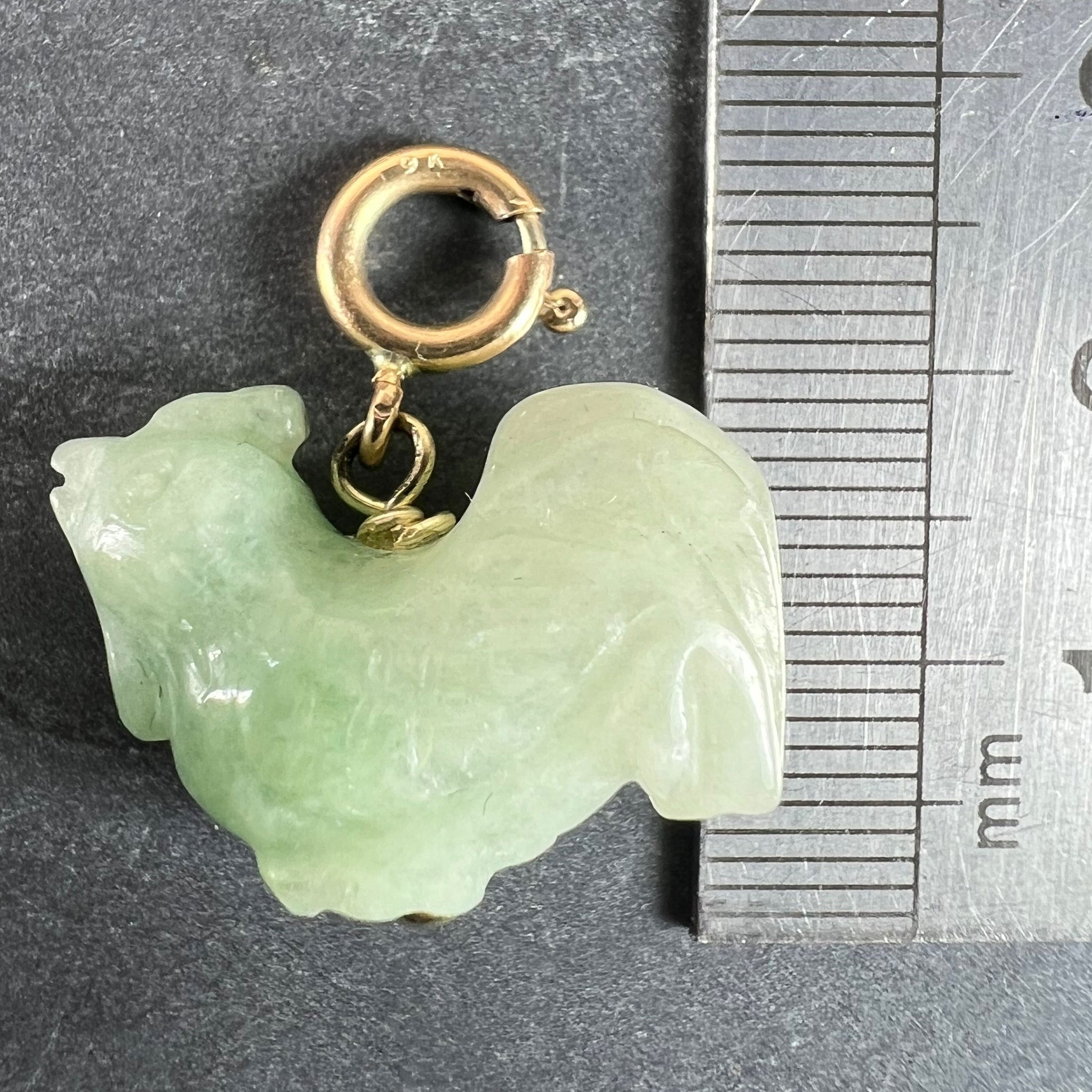 A vintage 9 karat (9K) yellow gold charm pendant designed as a carved green jadeite jade rooster. Stamped 9K for 9 karat gold to the spring ring.