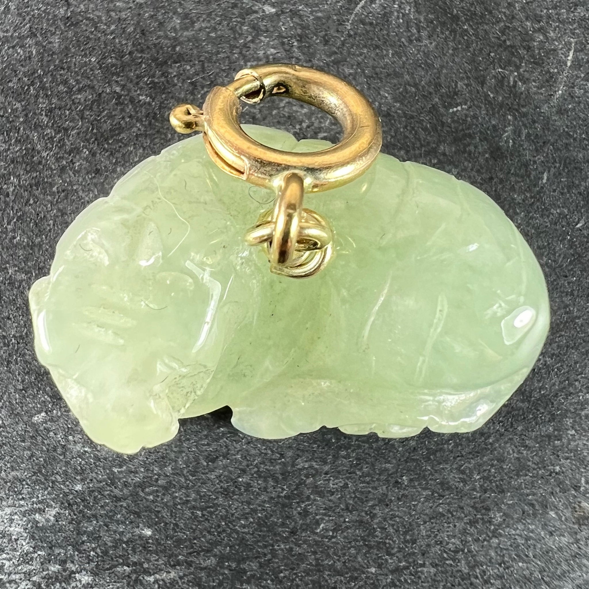 A vintage 9 karat (9K) yellow gold charm pendant designed as a carved green jade tiger. Stamped 375 for 9 karat gold to the spring ring.