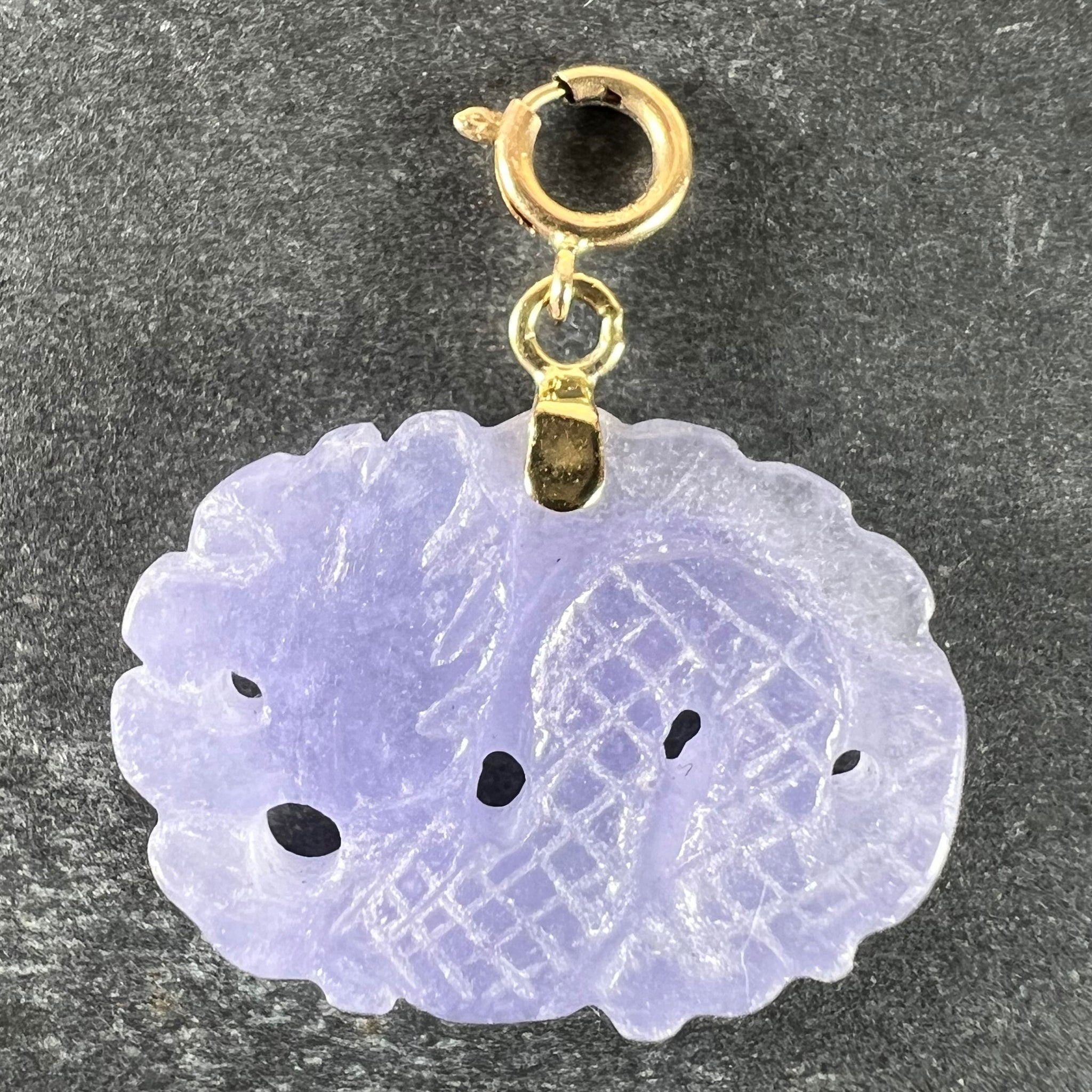 A vintage 14 karat (14K) yellow gold charm pendant designed as a carved lavender jade dragon. Stamped 585 for 14 karat gold to the spring ring.