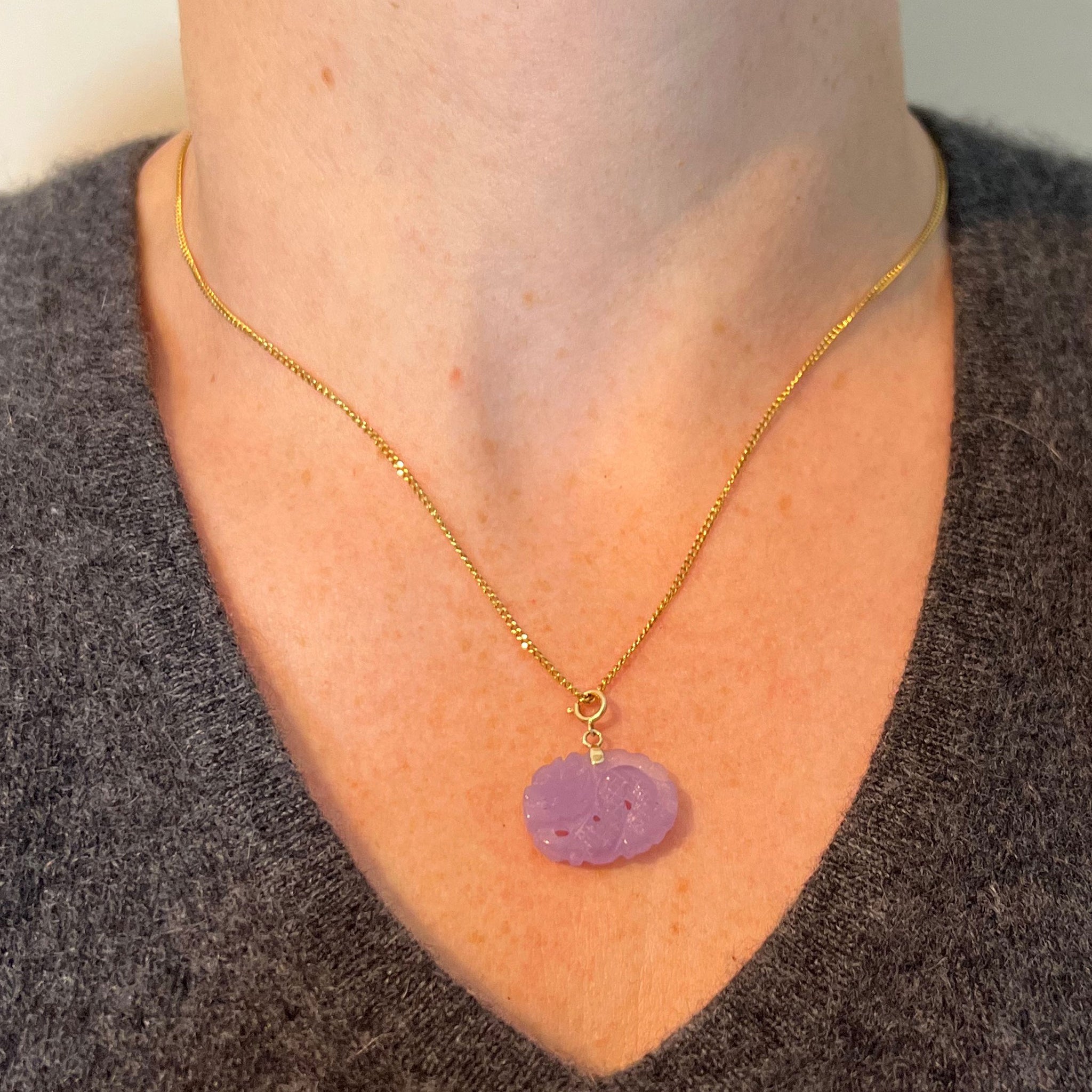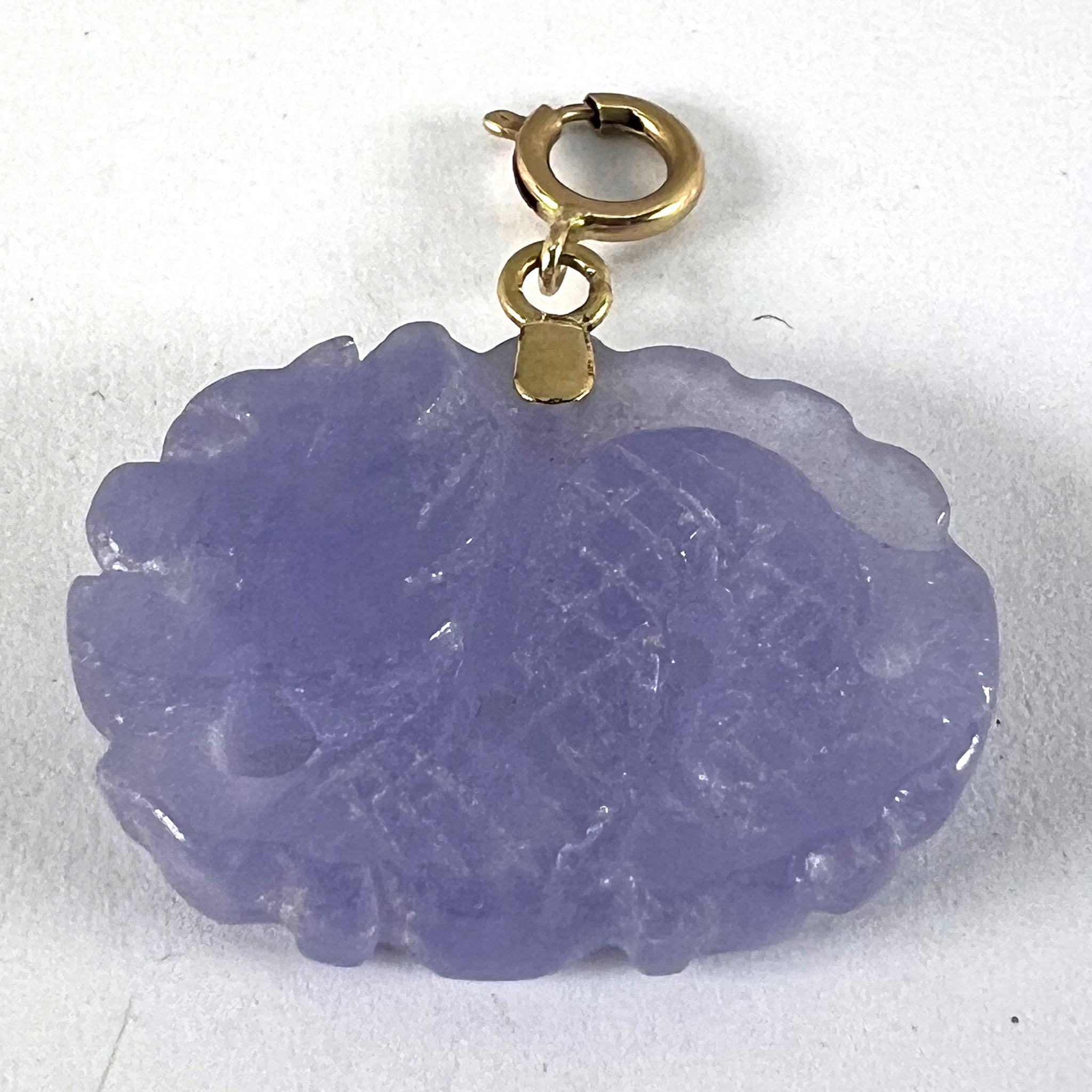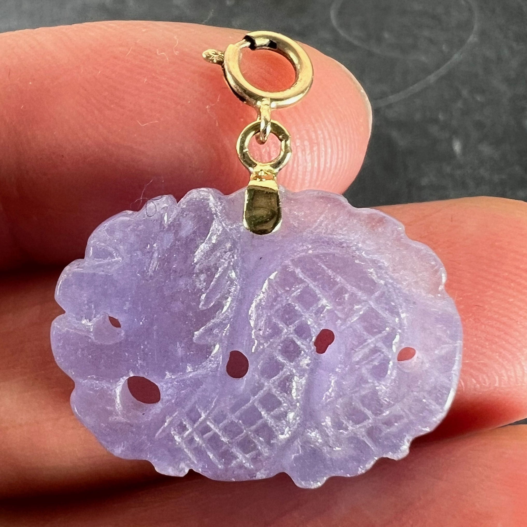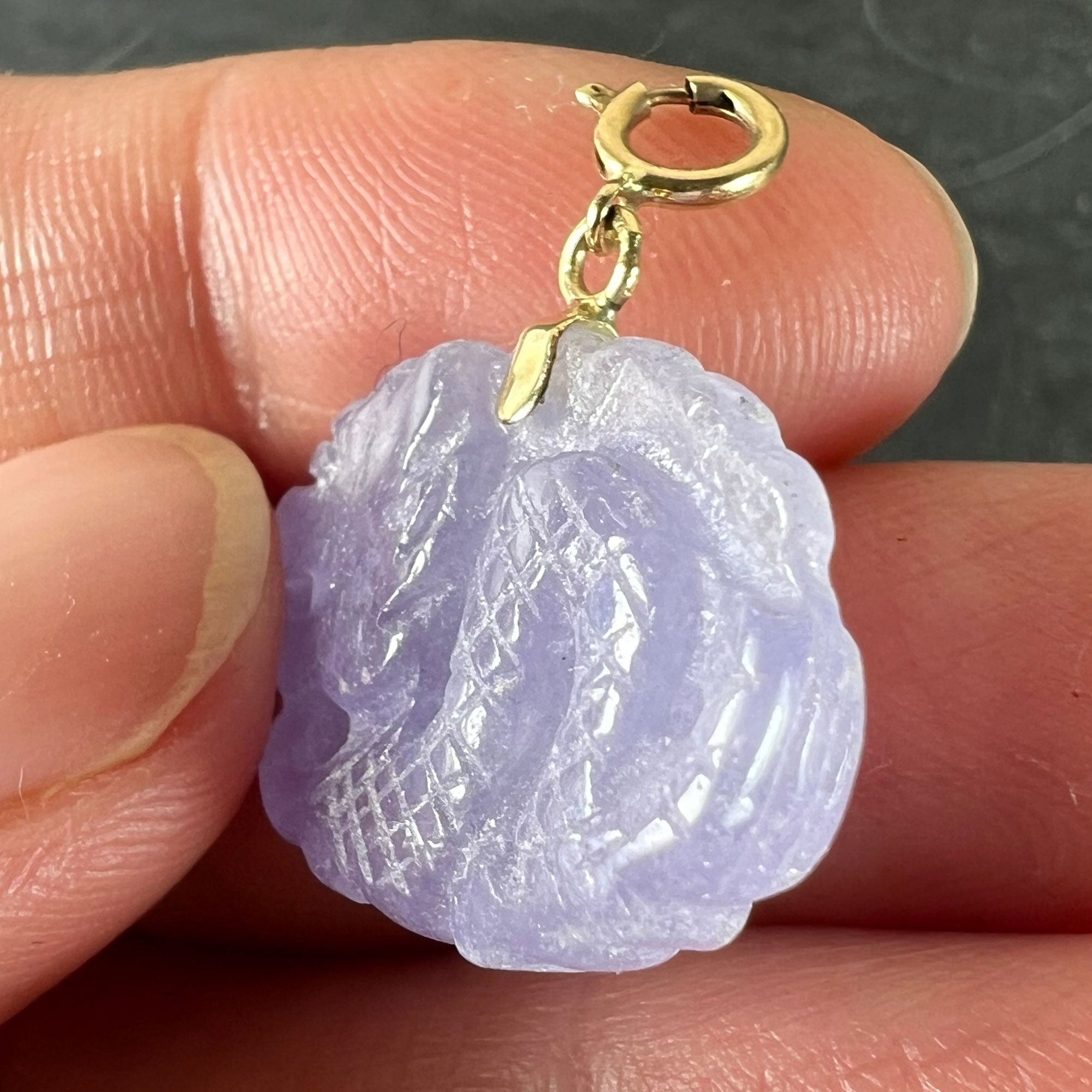 Vintage Carved Lavender Jade Dragon 14K Yellow Gold Charm Pendant