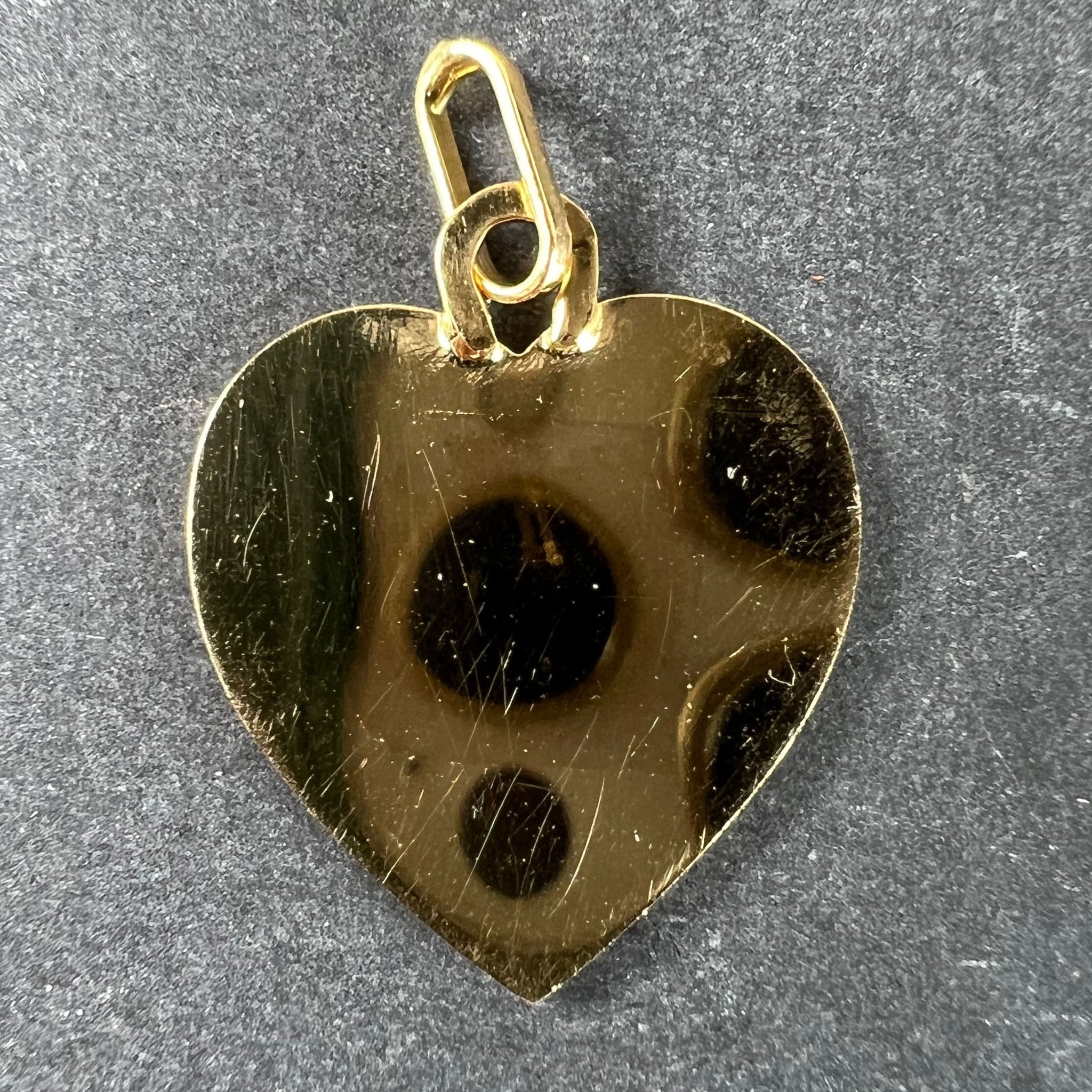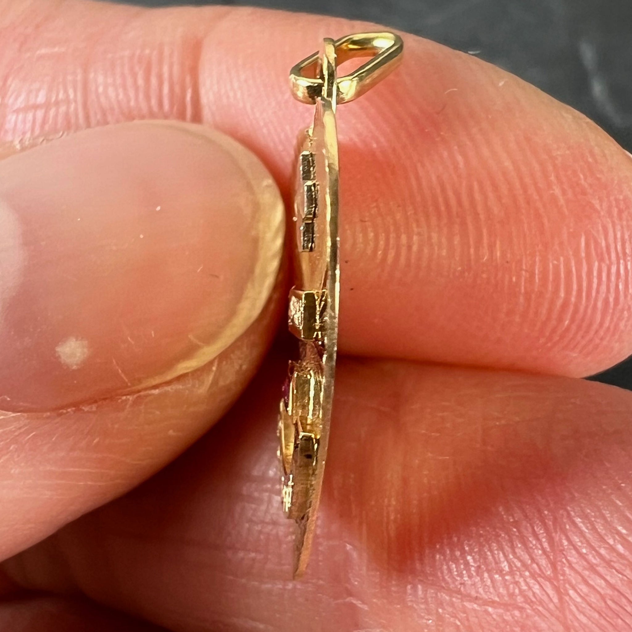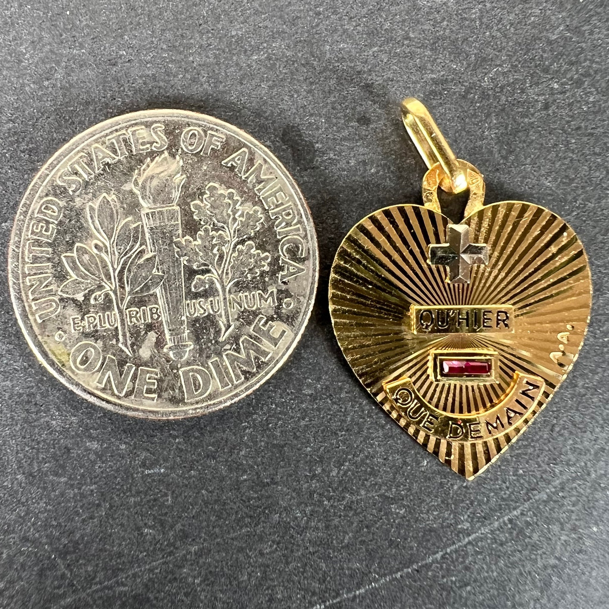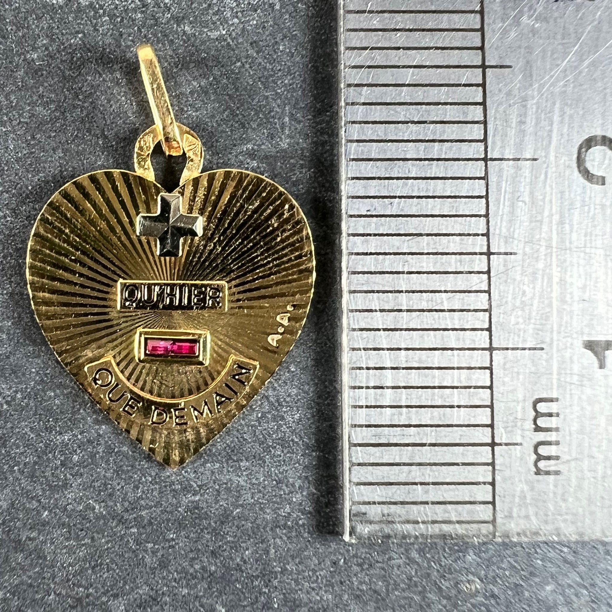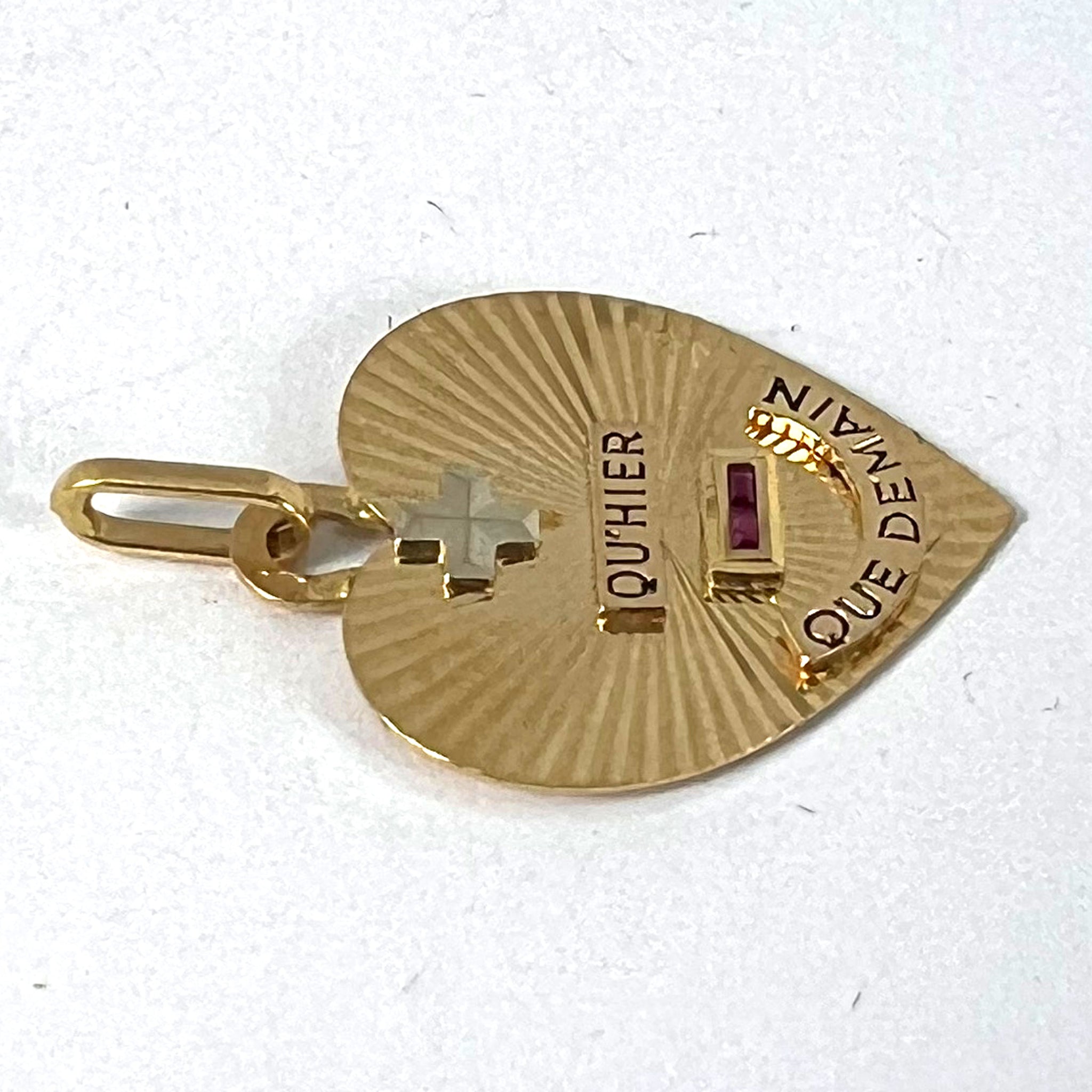 A French 18 karat (18K) yellow gold, enamel and ruby love charm pendant with a rebus spelling out "Plus qu'hier, moins que demain" ("More than yesterday, less than tomorrow") - a line taken from the love poem written by Rosemonde Gerard to her husband (the author of Cyrano) in 1889.