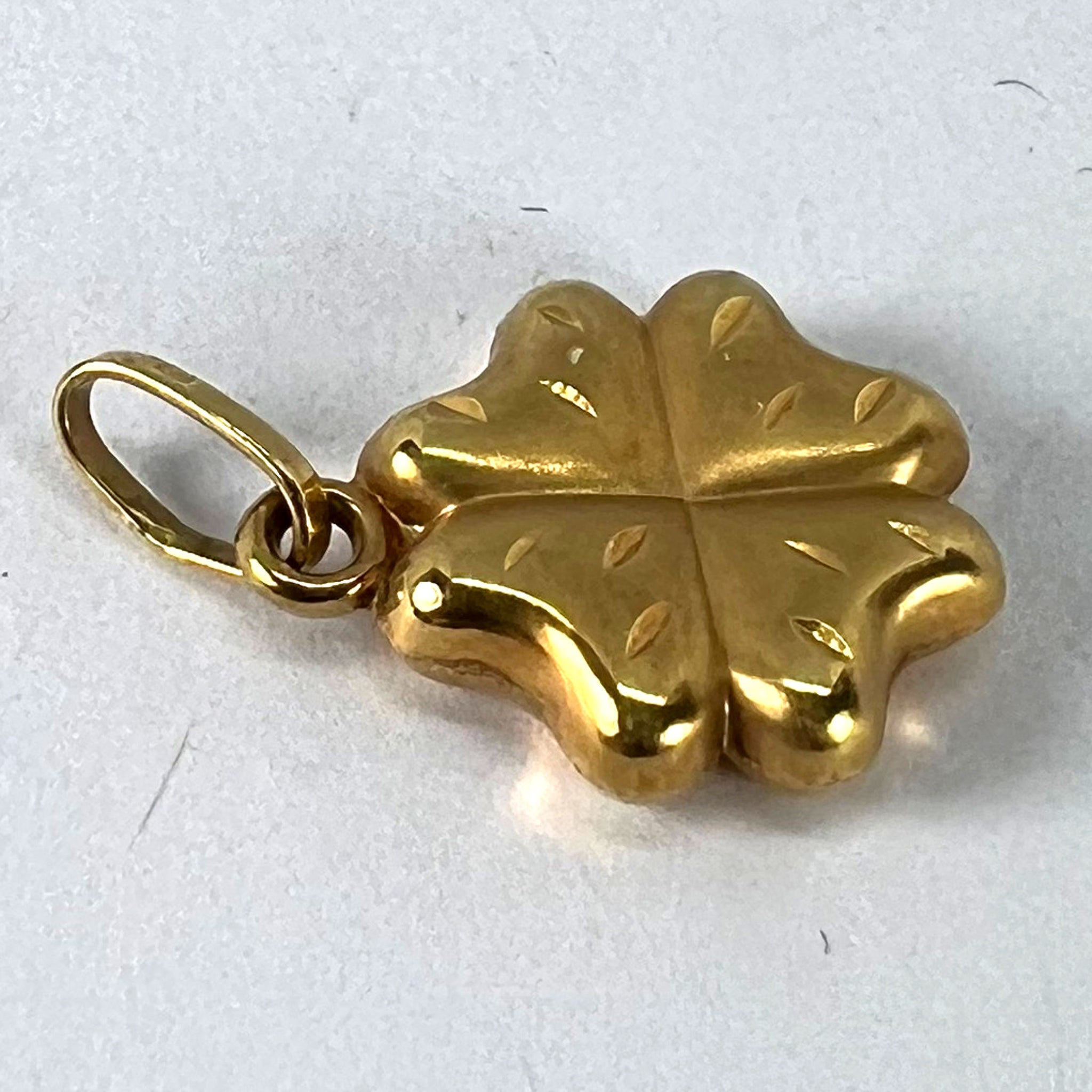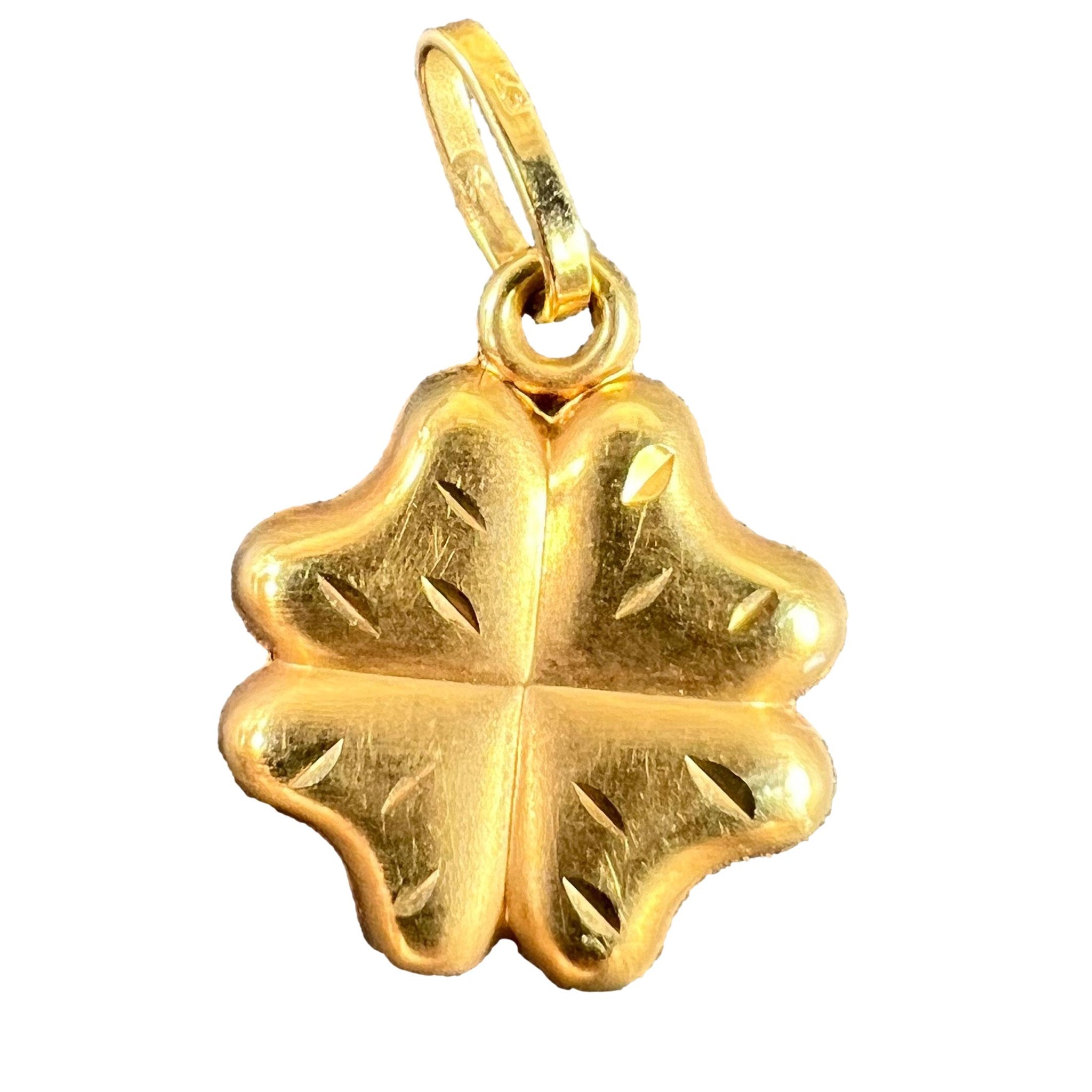 A vintage 18 karat (18K) yellow gold charm pendant depicting a puffy shamrock or four-leaved clover with engraved leaves. Stamped 750 to the jump ring for 18 karat gold.