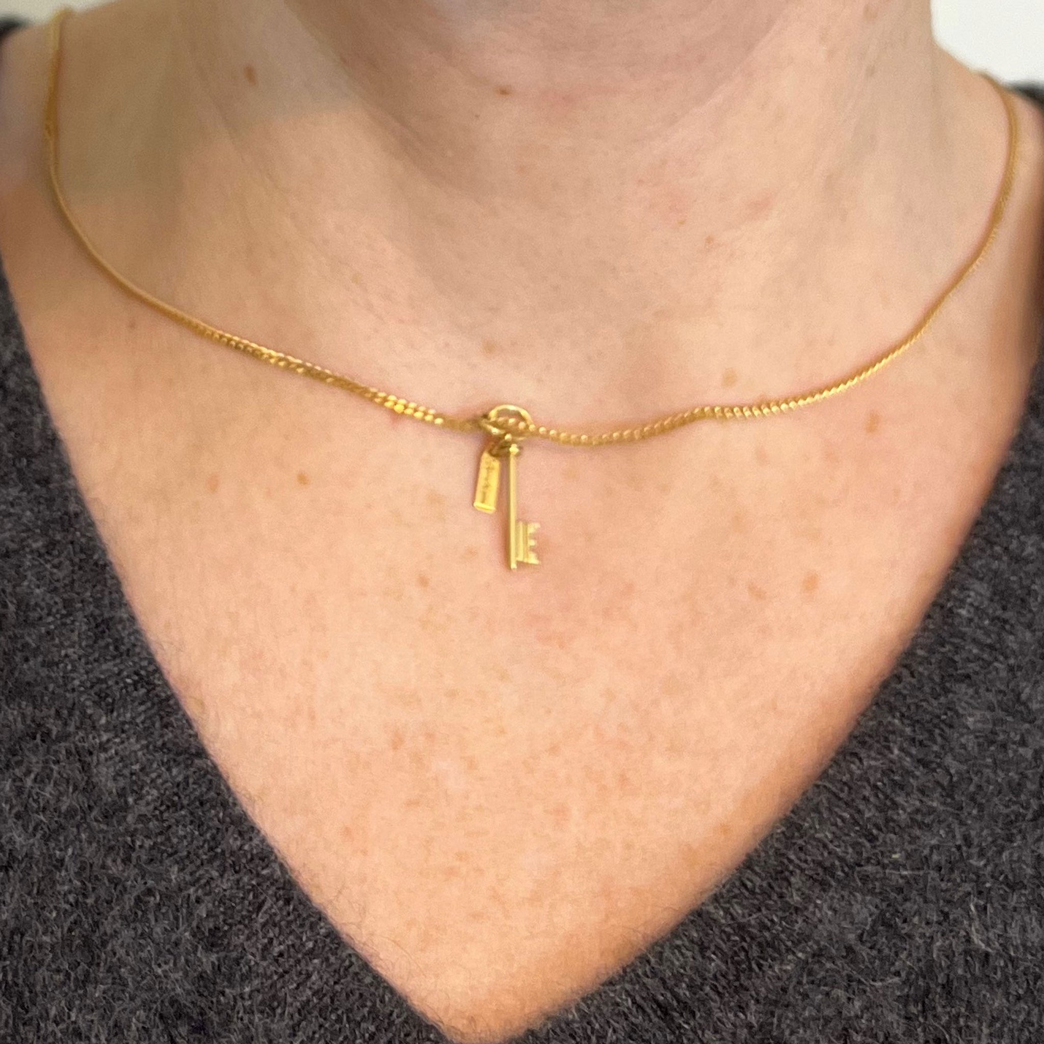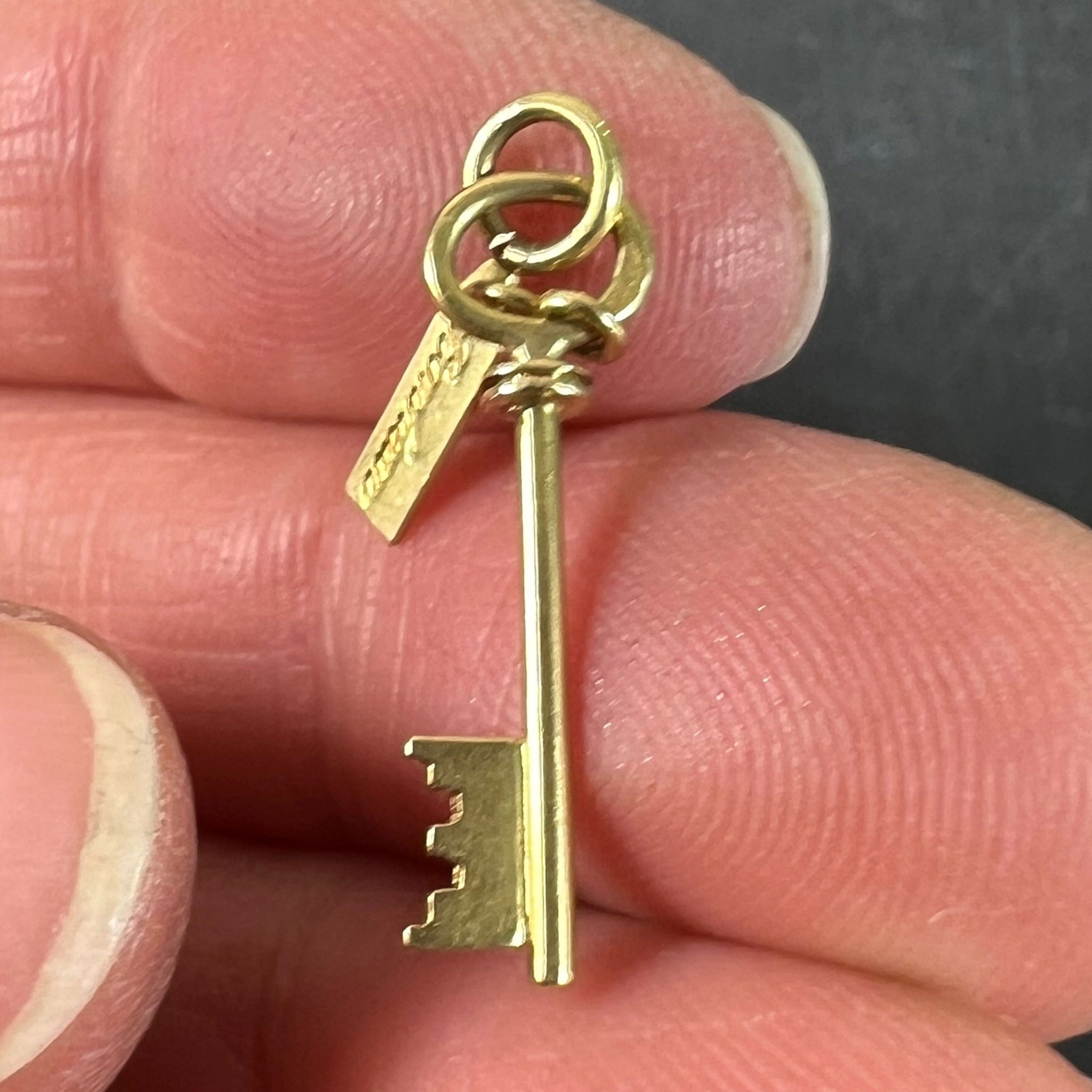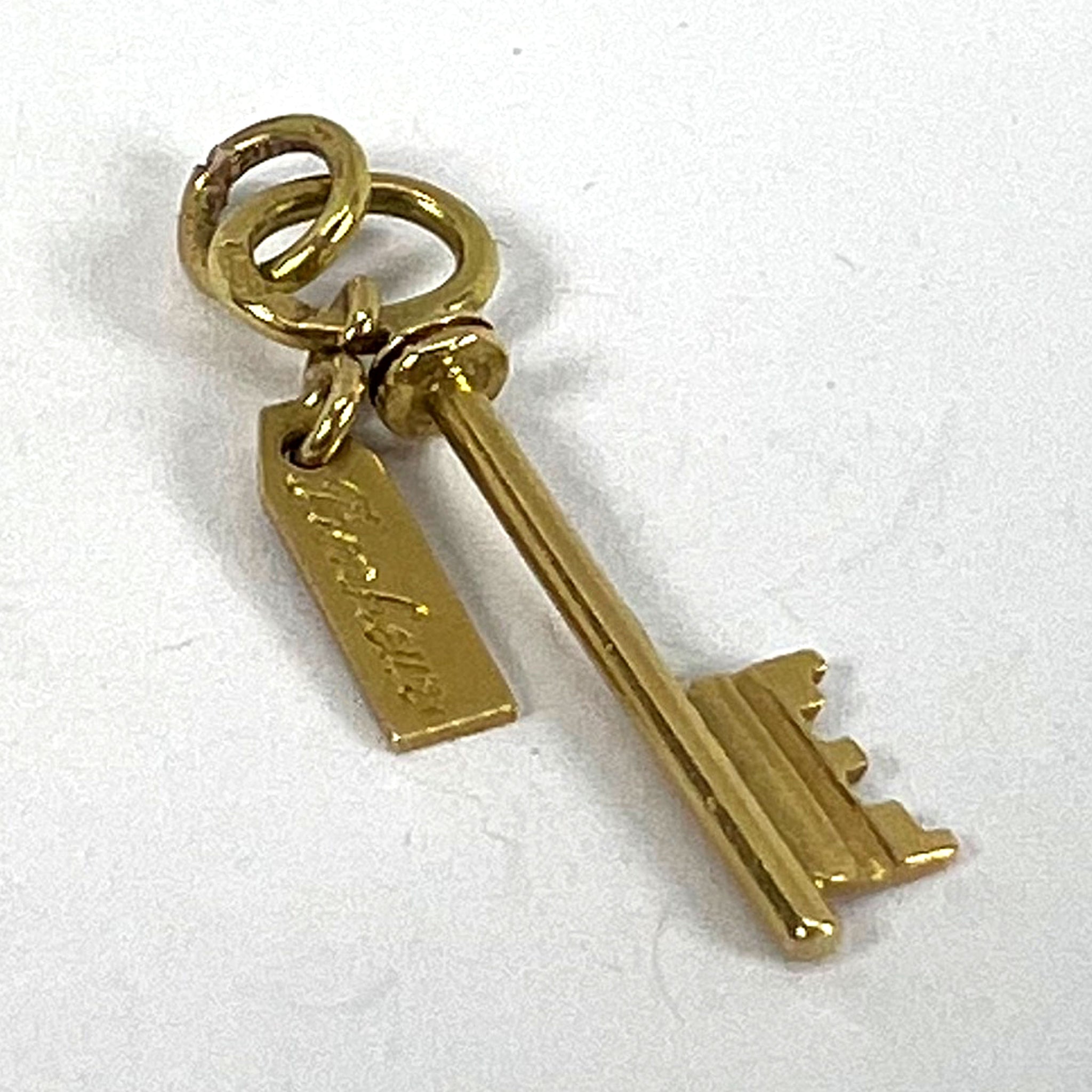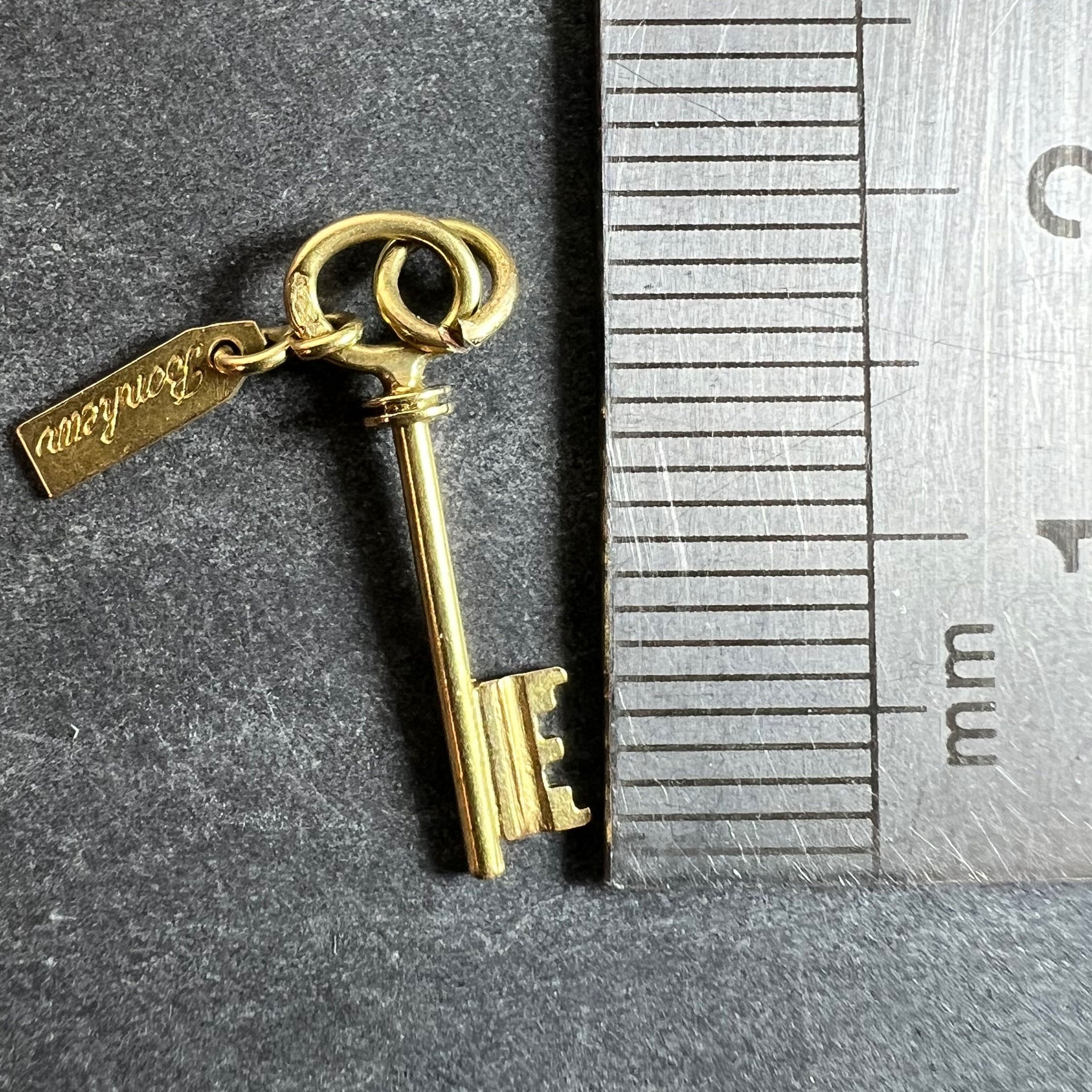 A French 18K (18 karat) yellow gold charm pendant designed as a lucky key with a tag inscribed 'Bonheur' (Good Luck) in cursive script. Stamped with the eagle's head mark for French manufacture and 18 karat gold.