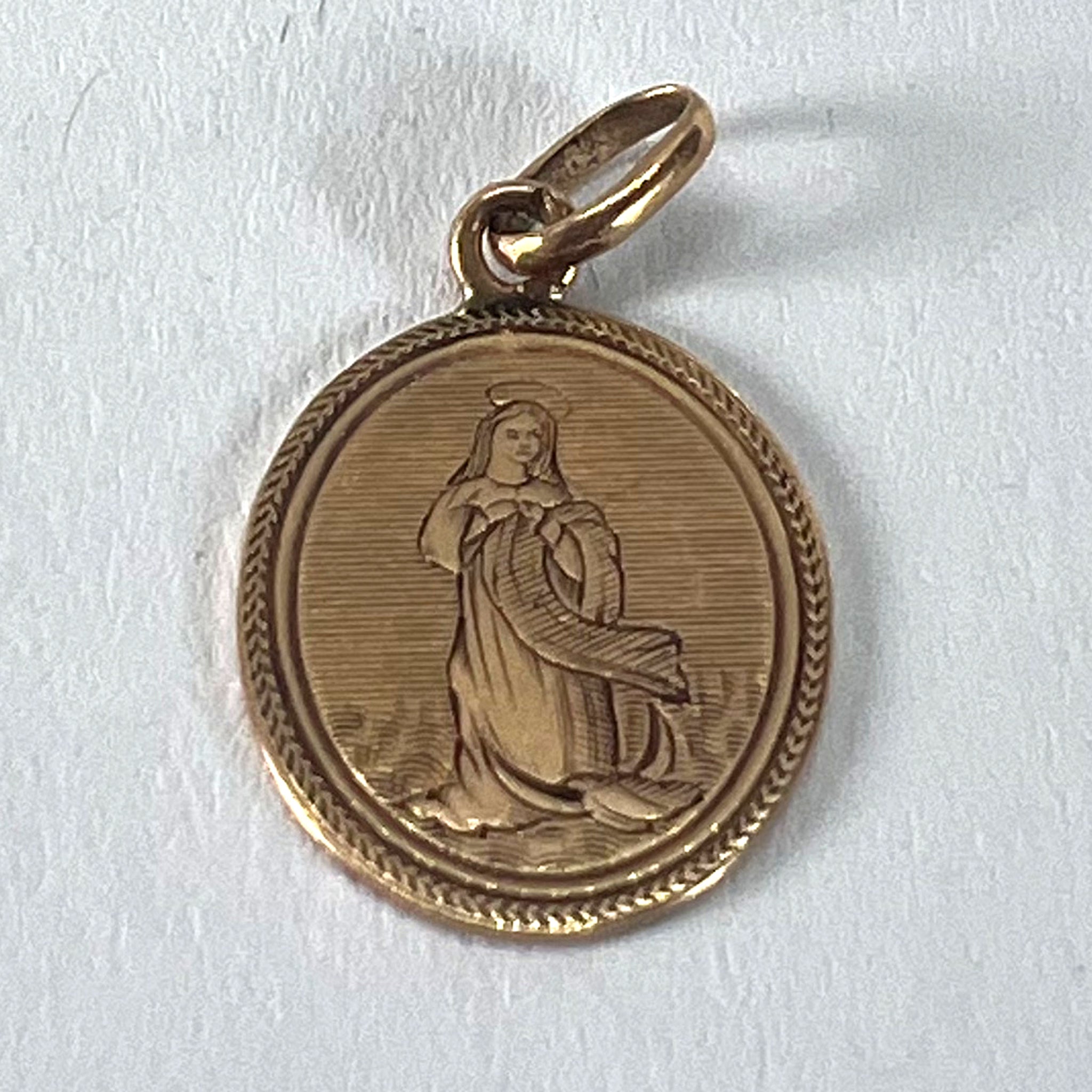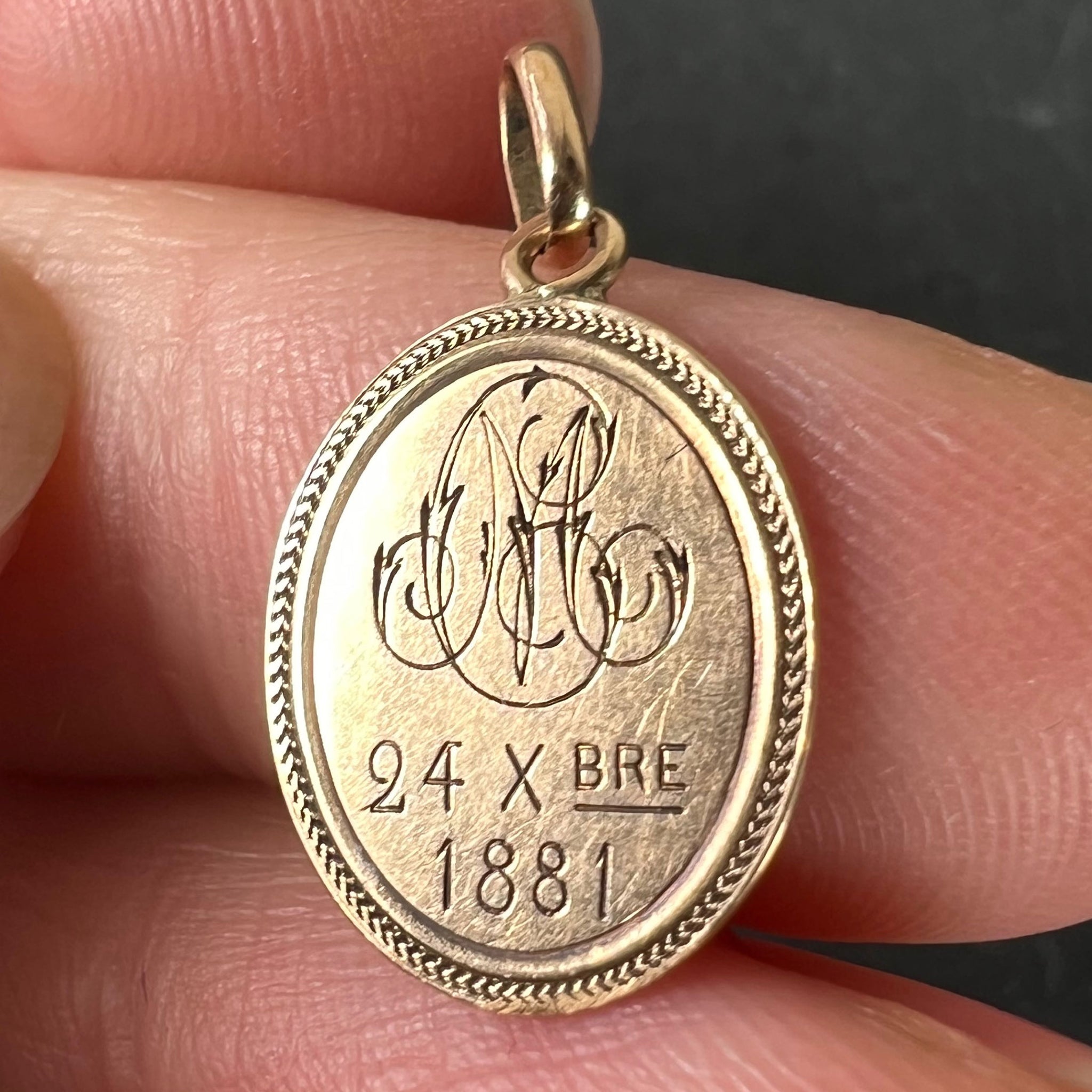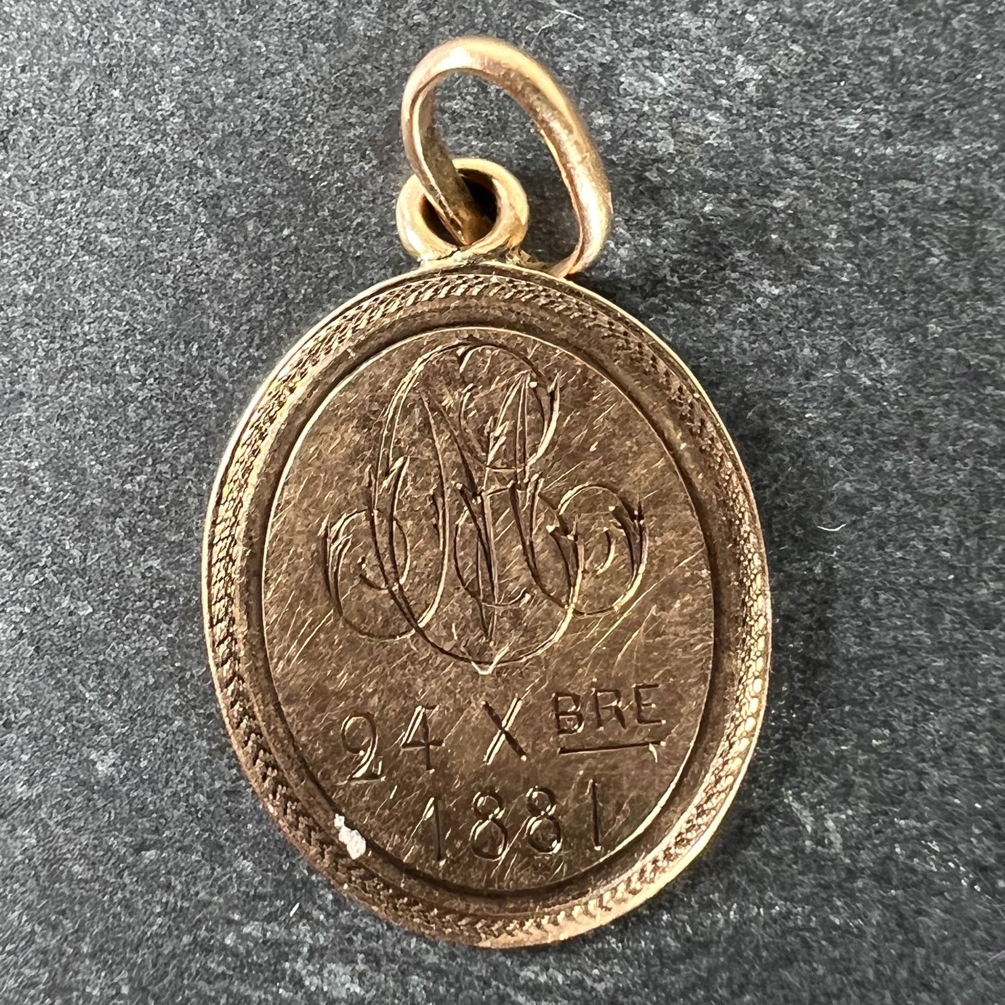 An antique French 18 karat (18K) rose gold charm pendant designed as a medal depicting the Virgin Mary. The reverse engraved with the monogram 'MC/CM' and the date 24 Xbre (October) 1881. Stamped with a French mark for 18 karat gold.