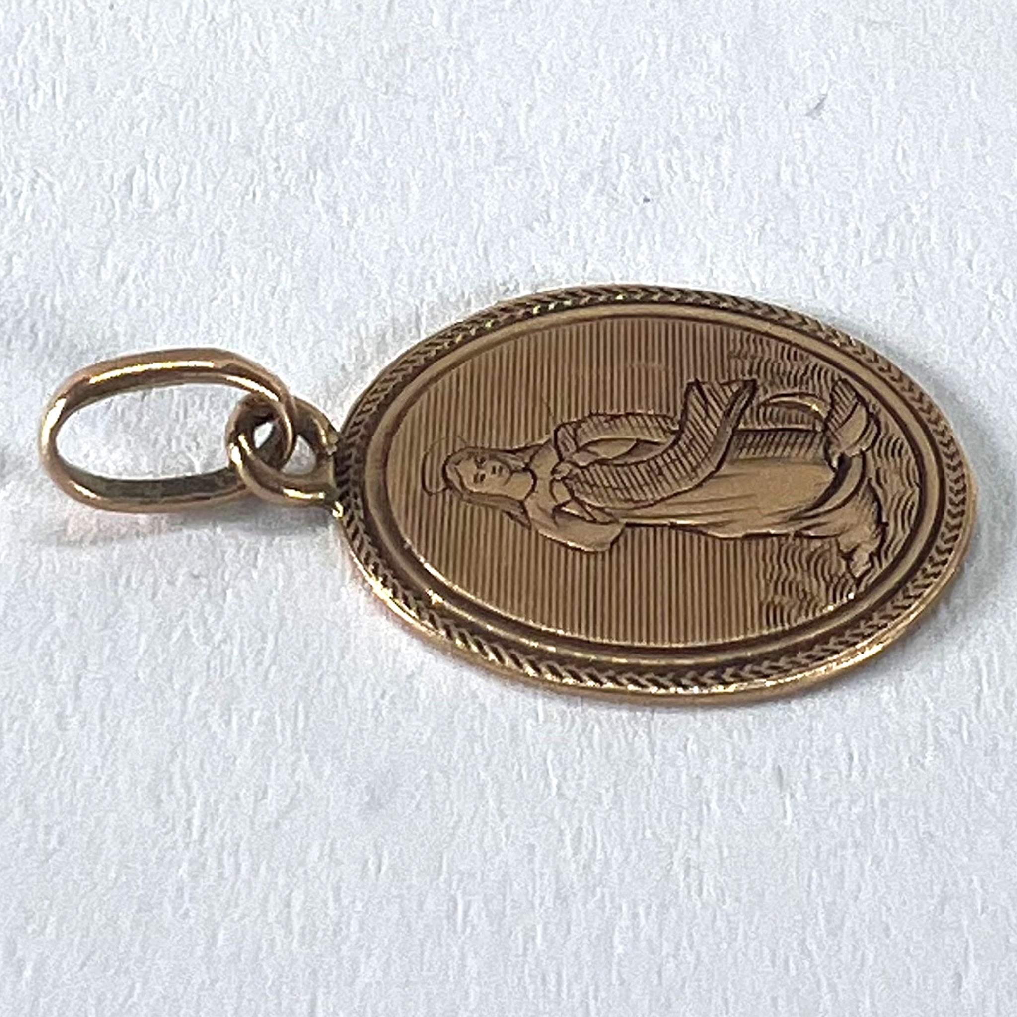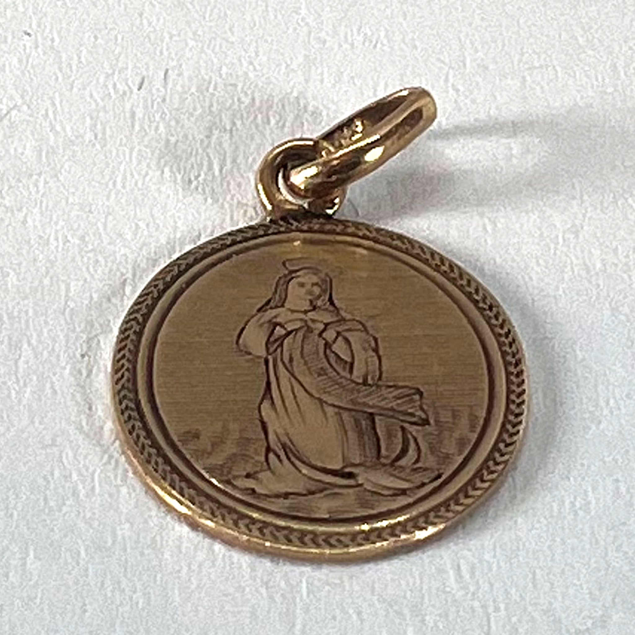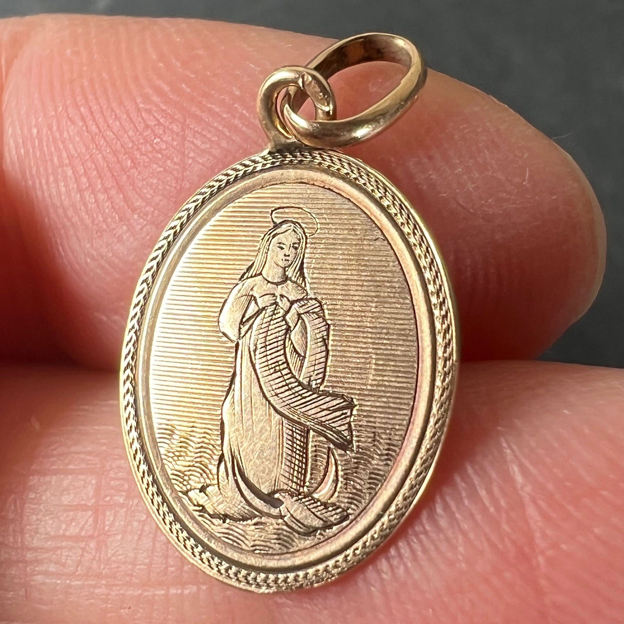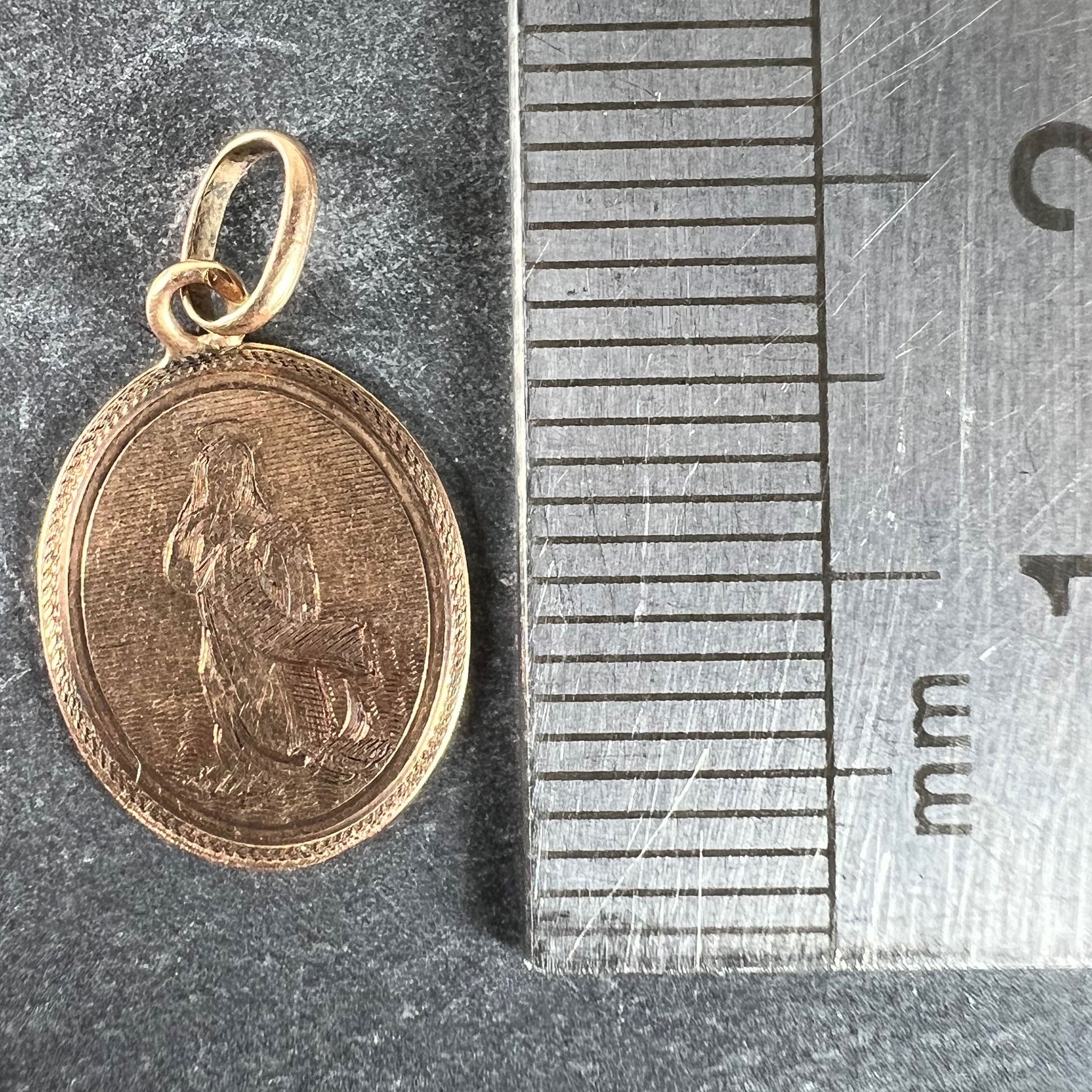 An antique French 18 karat (18K) rose gold charm pendant designed as a medal depicting the Virgin Mary. The reverse engraved with the monogram 'MC/CM' and the date 24 Xbre (October) 1881. Stamped with a French mark for 18 karat gold.