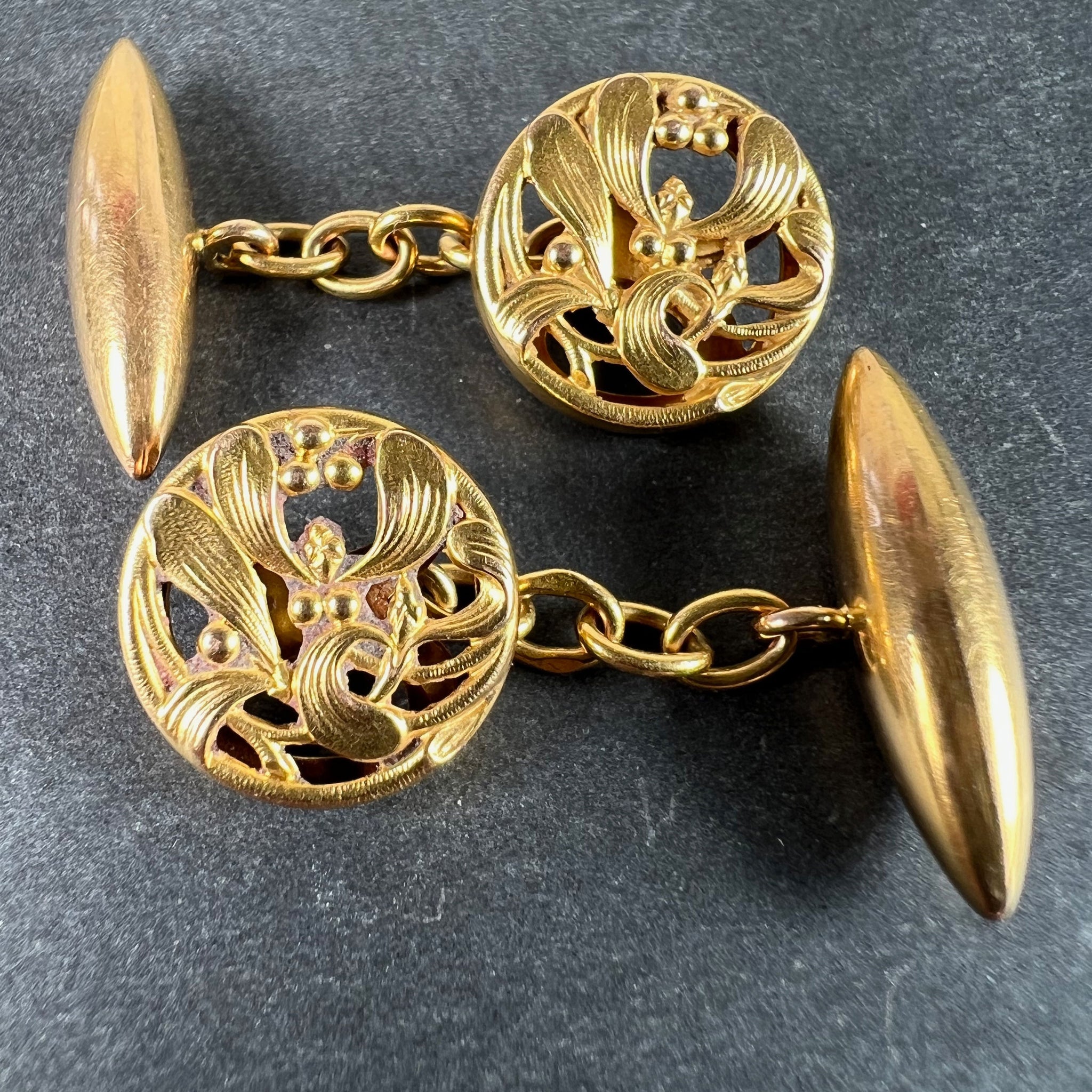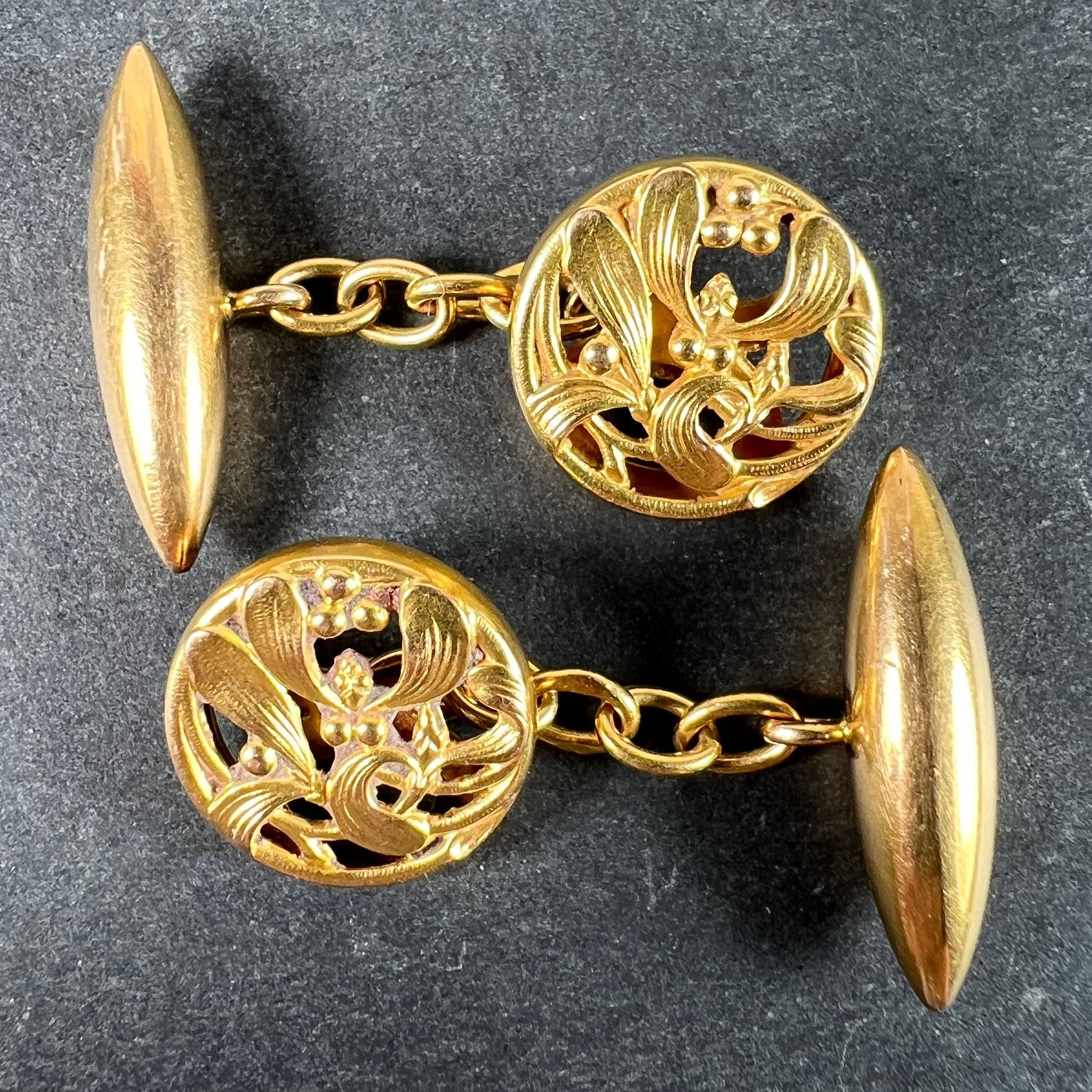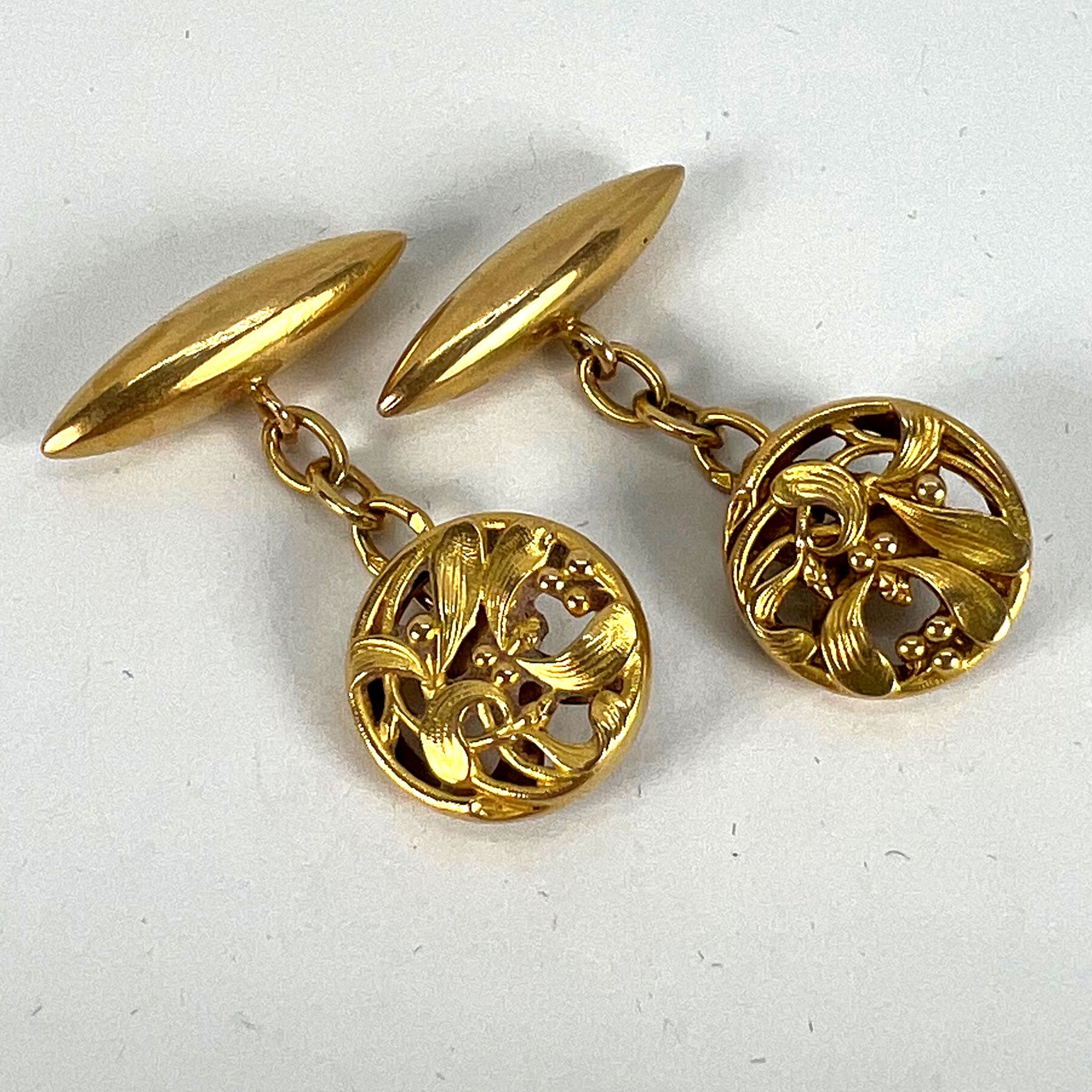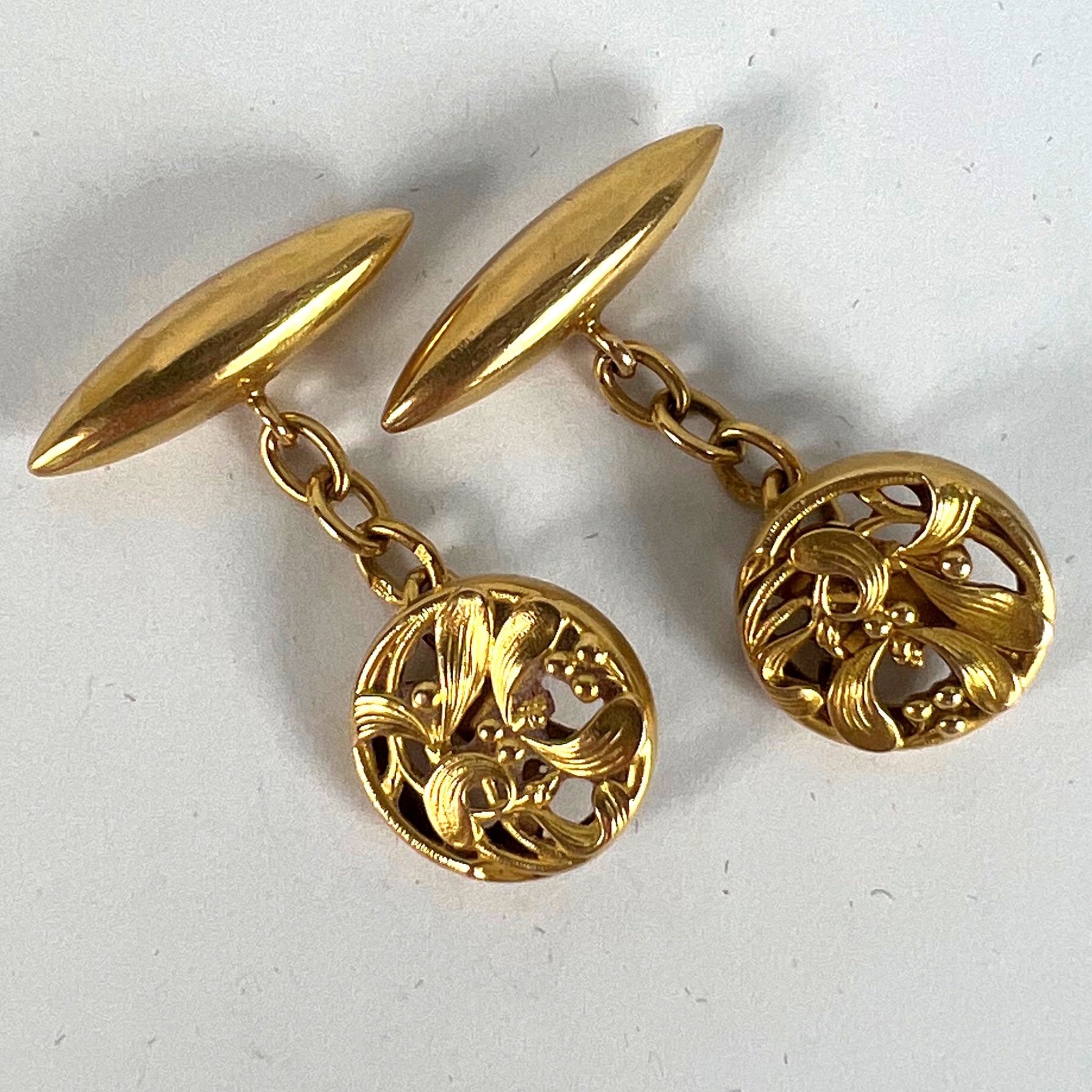 A pair of French Art Nouveau 18 karat (18K) yellow gold cufflinks designed with a pattern of mistletoe leaves. Stamped with the eagle’s head for 18 karat gold and French manufacture with a partial maker's mark to one of the links.