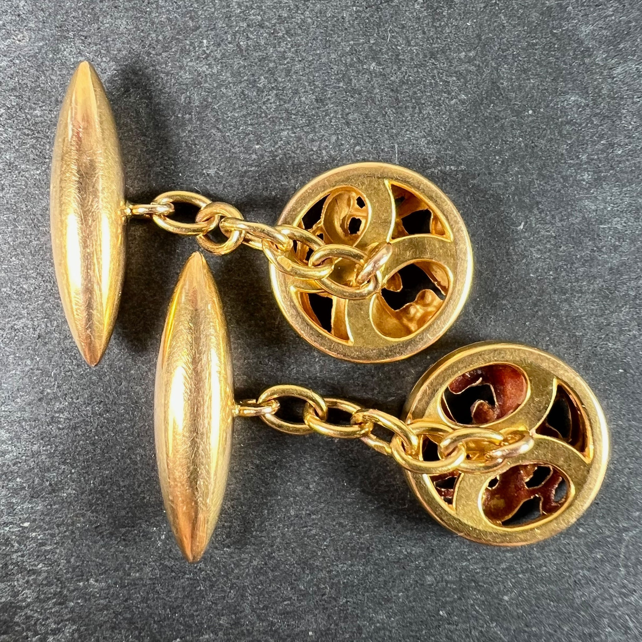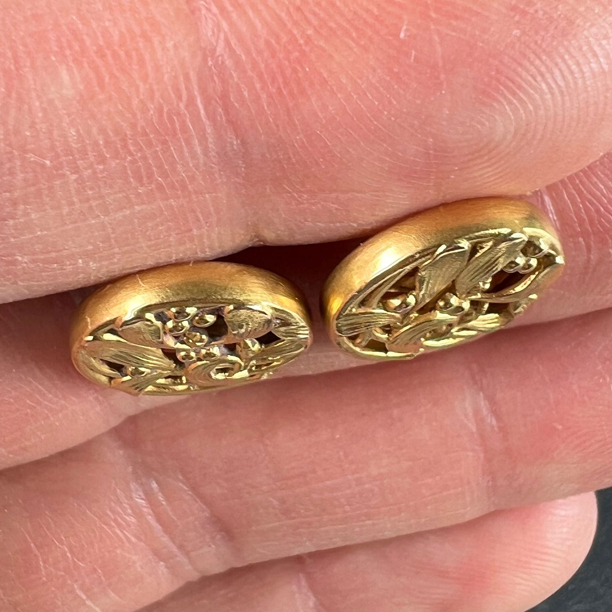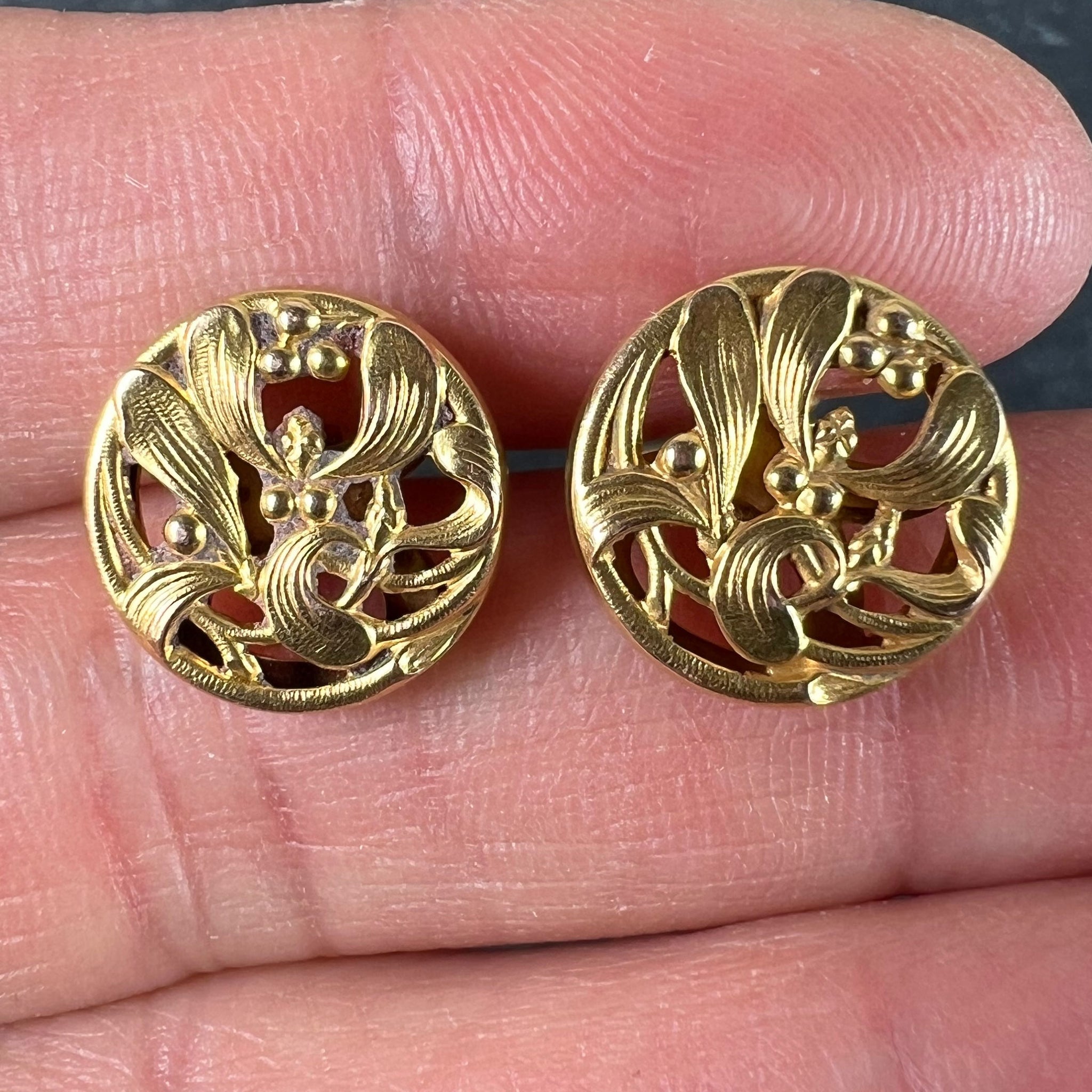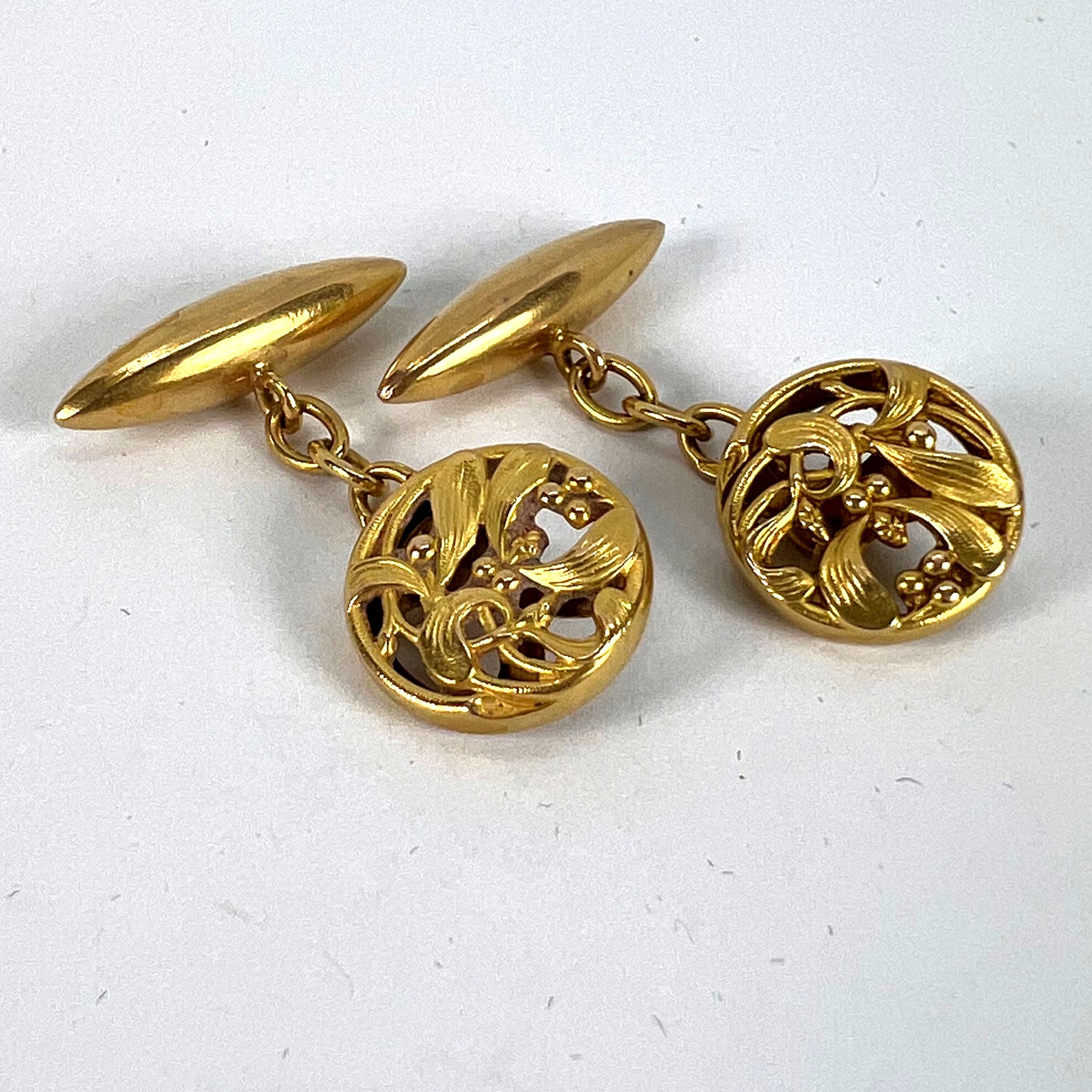 A pair of French Art Nouveau 18 karat (18K) yellow gold cufflinks designed with a pattern of mistletoe leaves. Stamped with the eagle’s head for 18 karat gold and French manufacture with a partial maker's mark to one of the links.