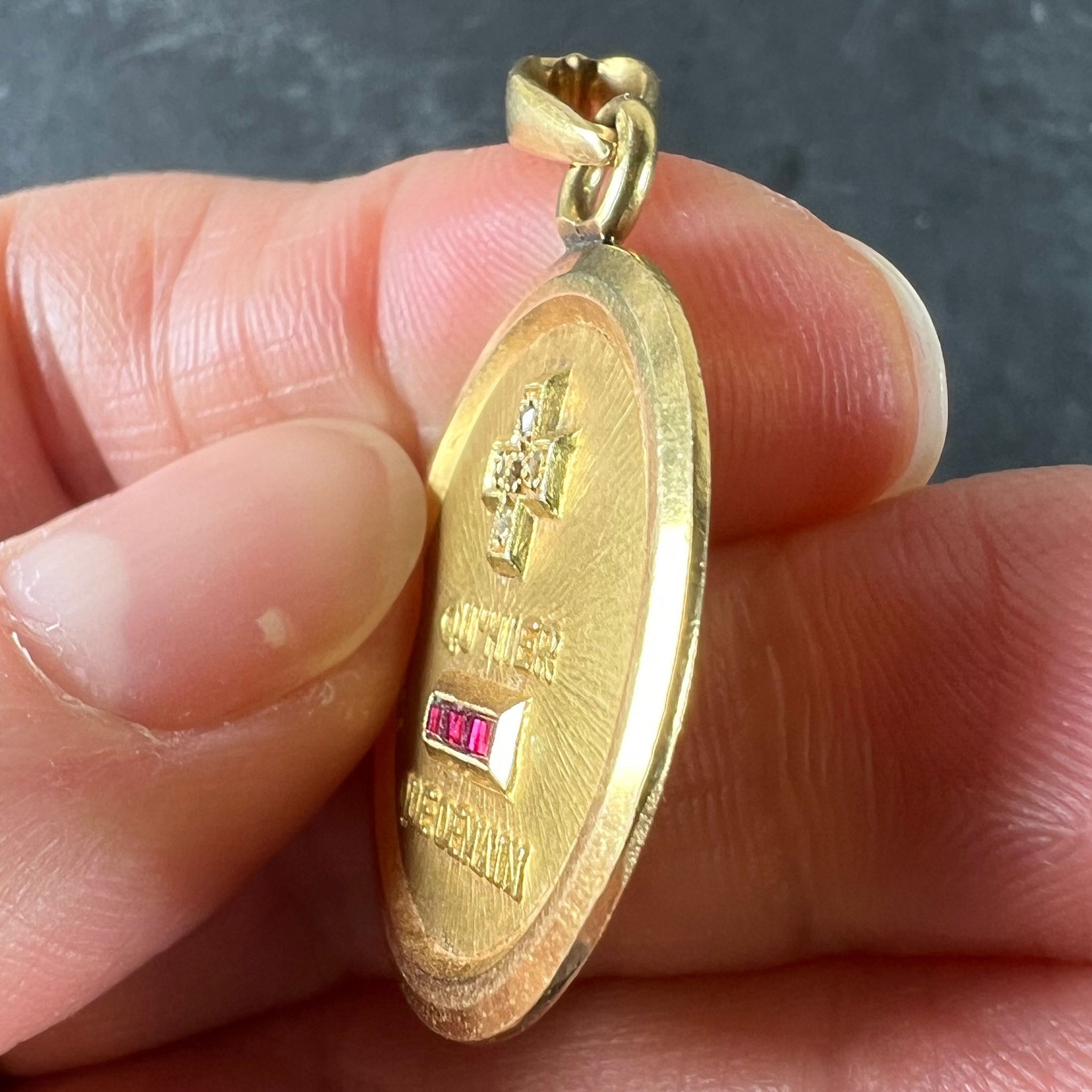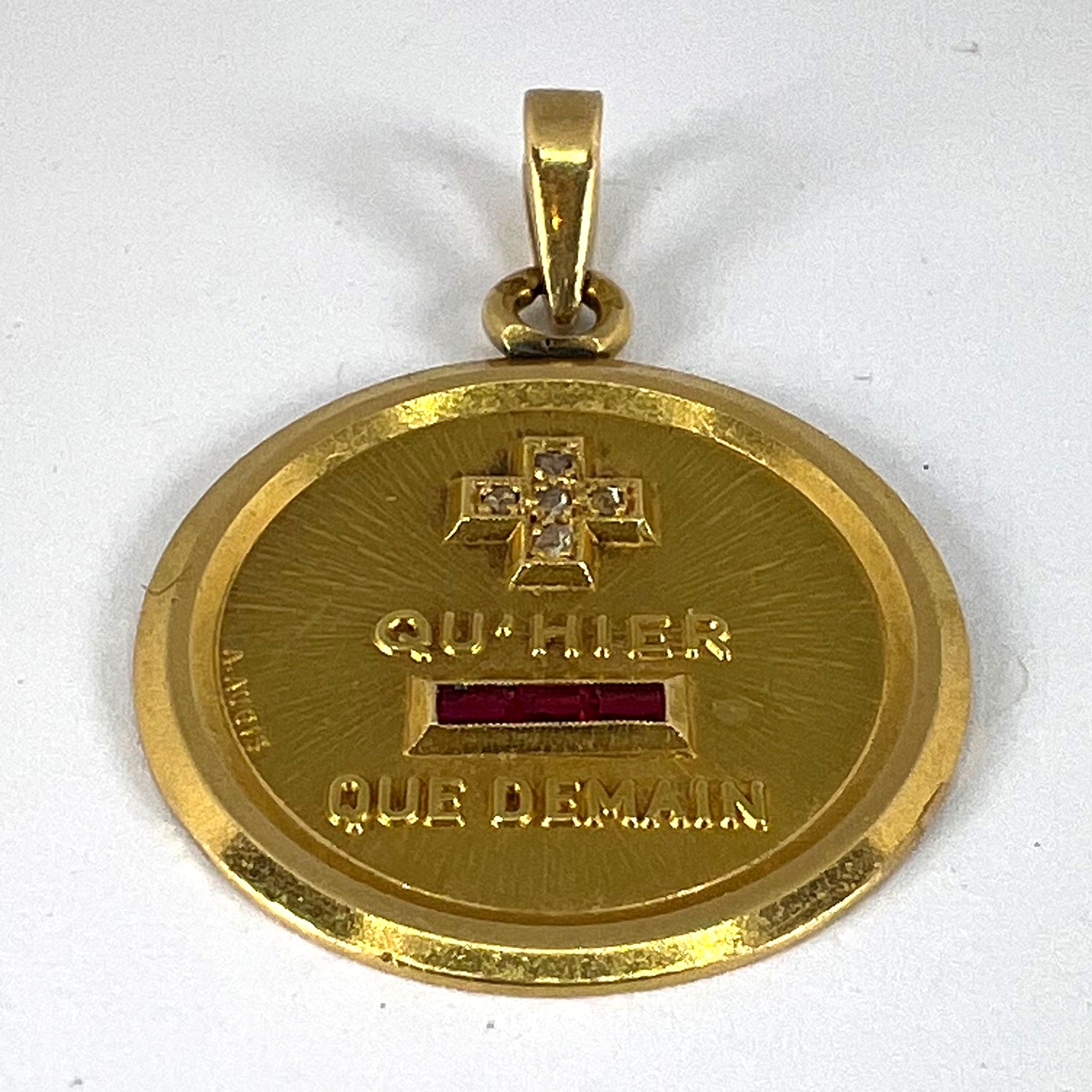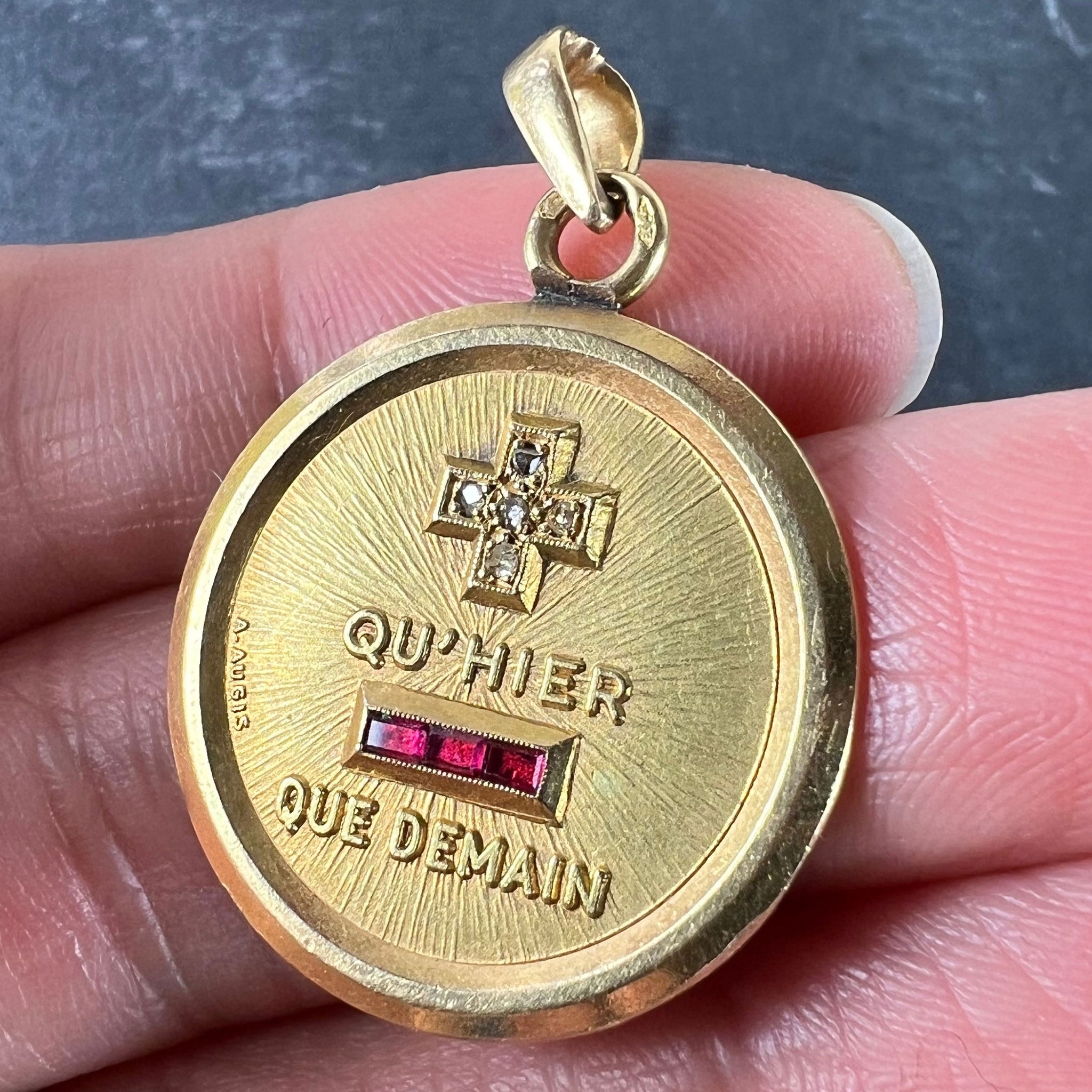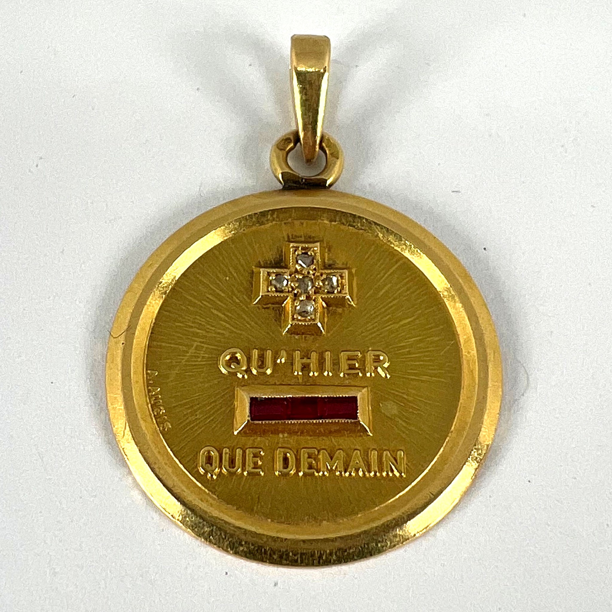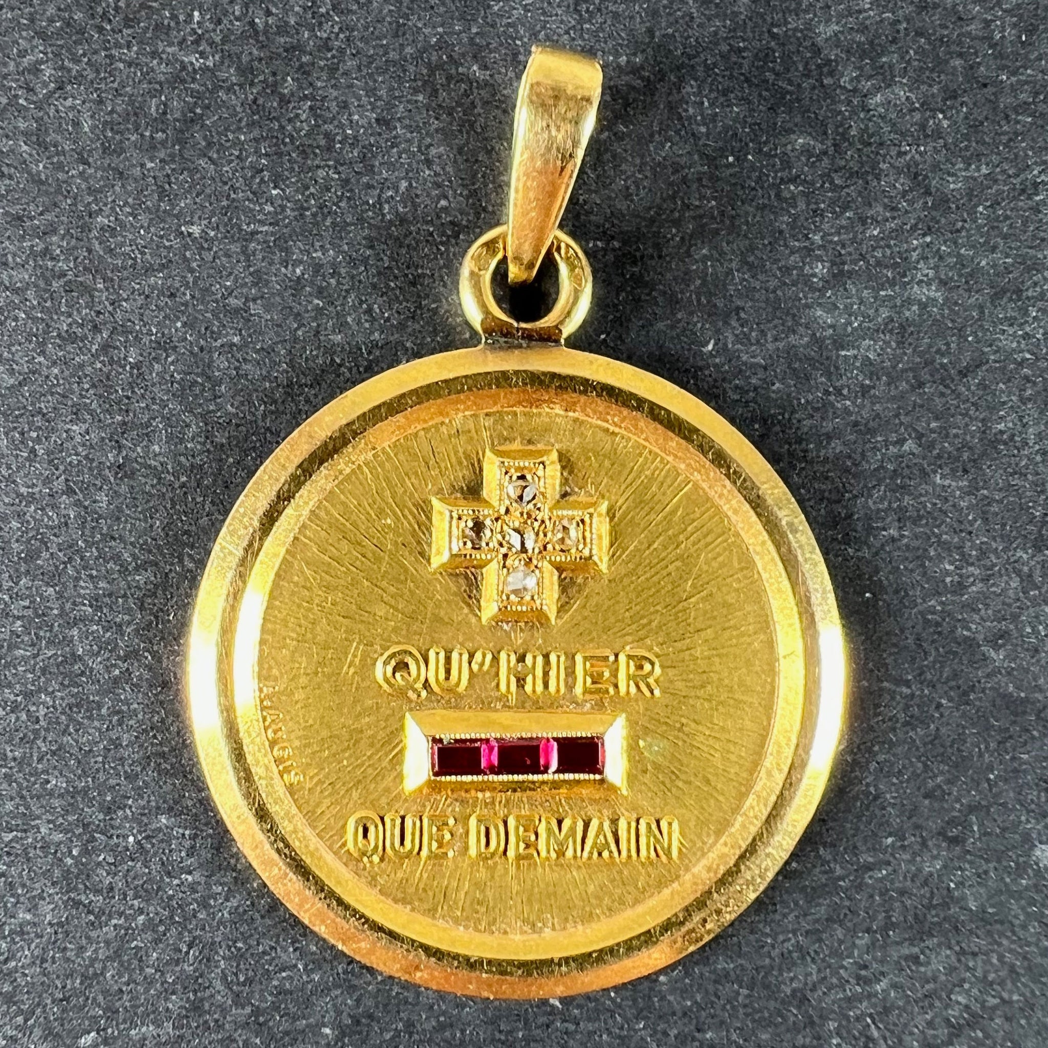 A French 18 karat (18K) yellow gold, diamond and ruby love charm pendant with a rebus spelling out "Plus qu'hier, moins que demain" ("More than yesterday, less than tomorrow") - a line taken from the love poem written by Rosemonde Gerard to her husband (the author of Cyrano) in 1889.
