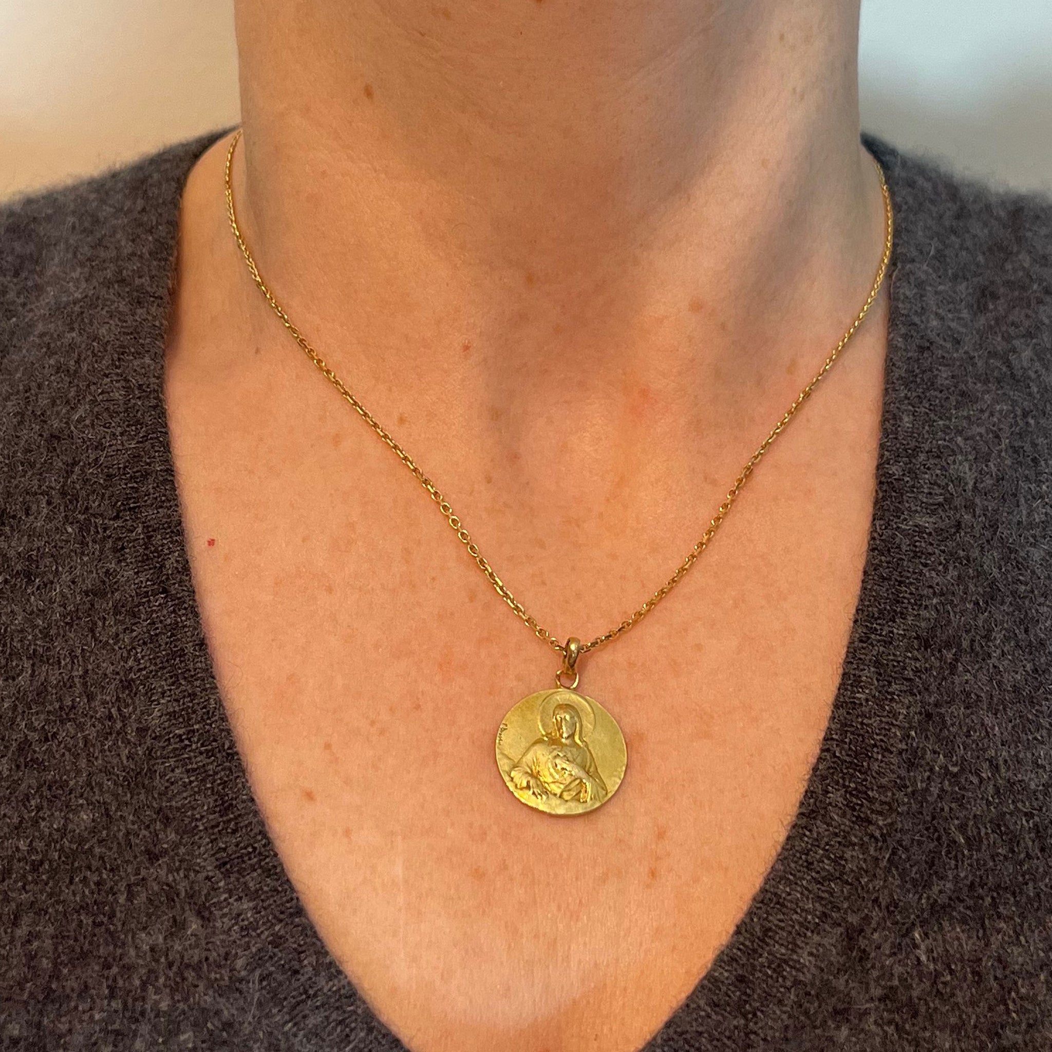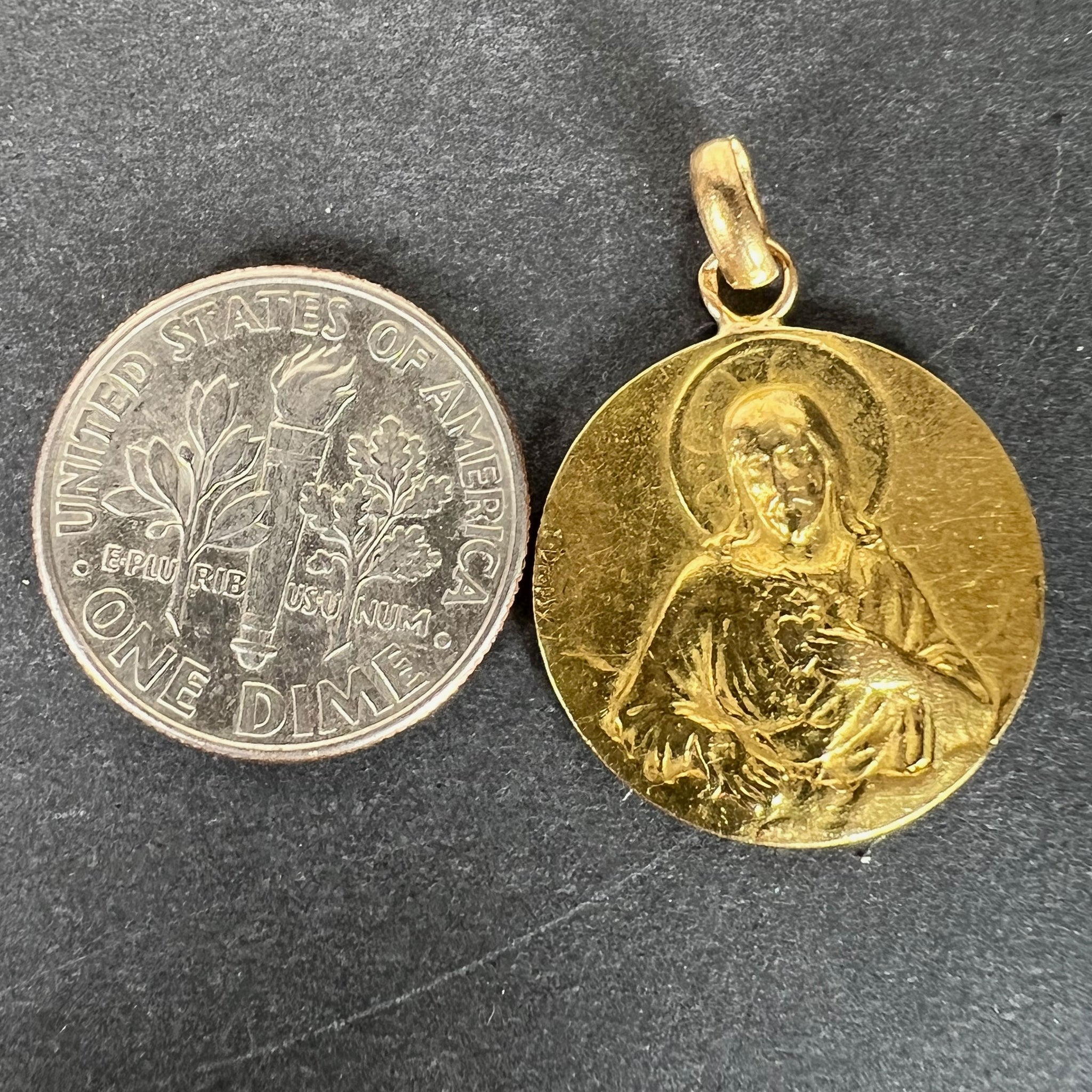 An antique French 18 karat (18K) yellow gold charm pendant designed as a medal depicting the Virgin Mary as the Madonna and Child holding a pair of devotional scapulars, with the phrase Virgo Carmeli surrounding them. The other side depicts Jesus Christ with the Sacred Heart, signed Dropsy to both sides. Stamped with the eagle's head mark for 18 karat gold and French manufacture.