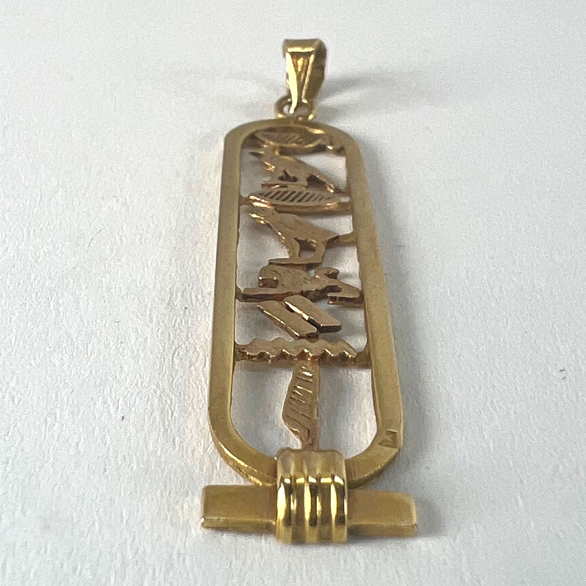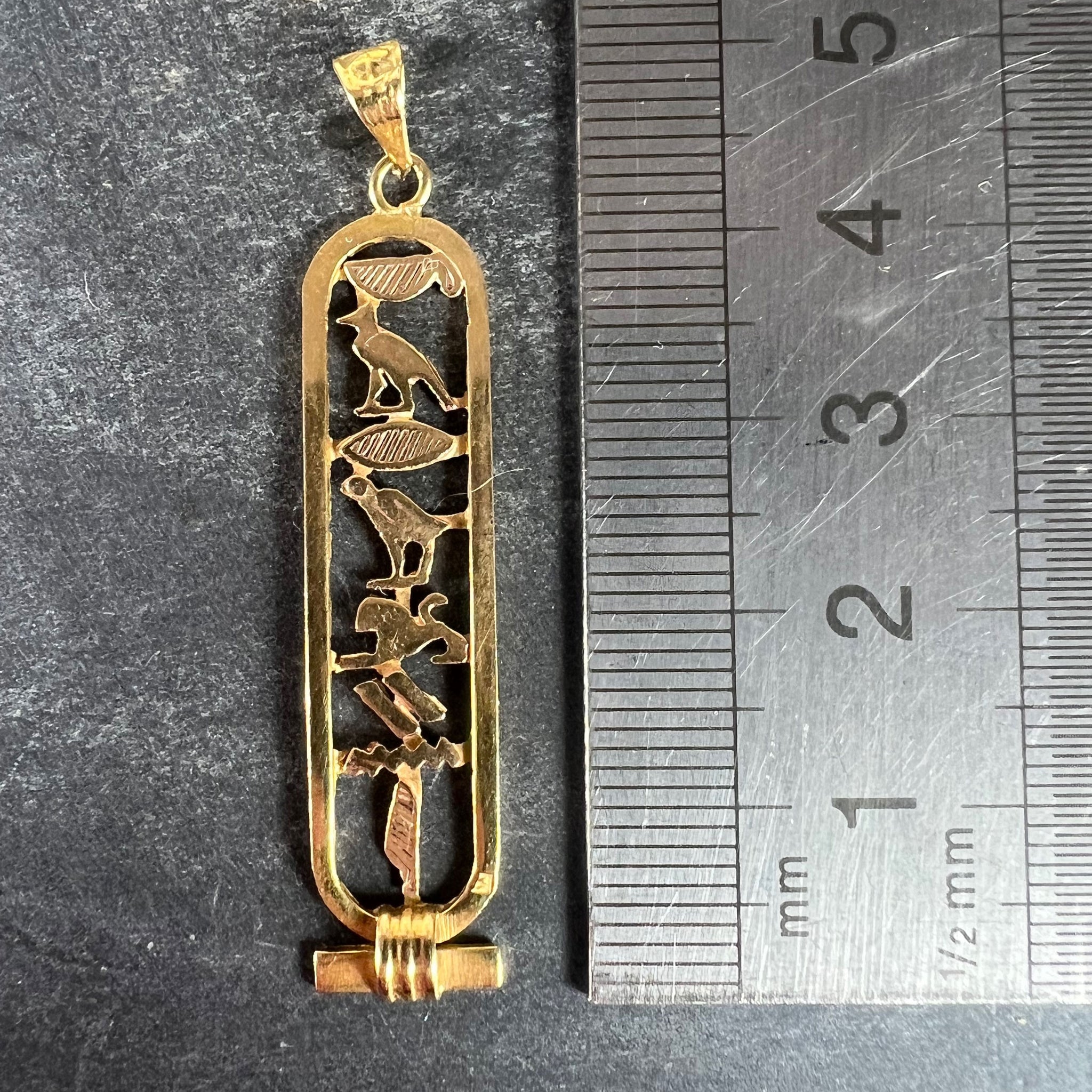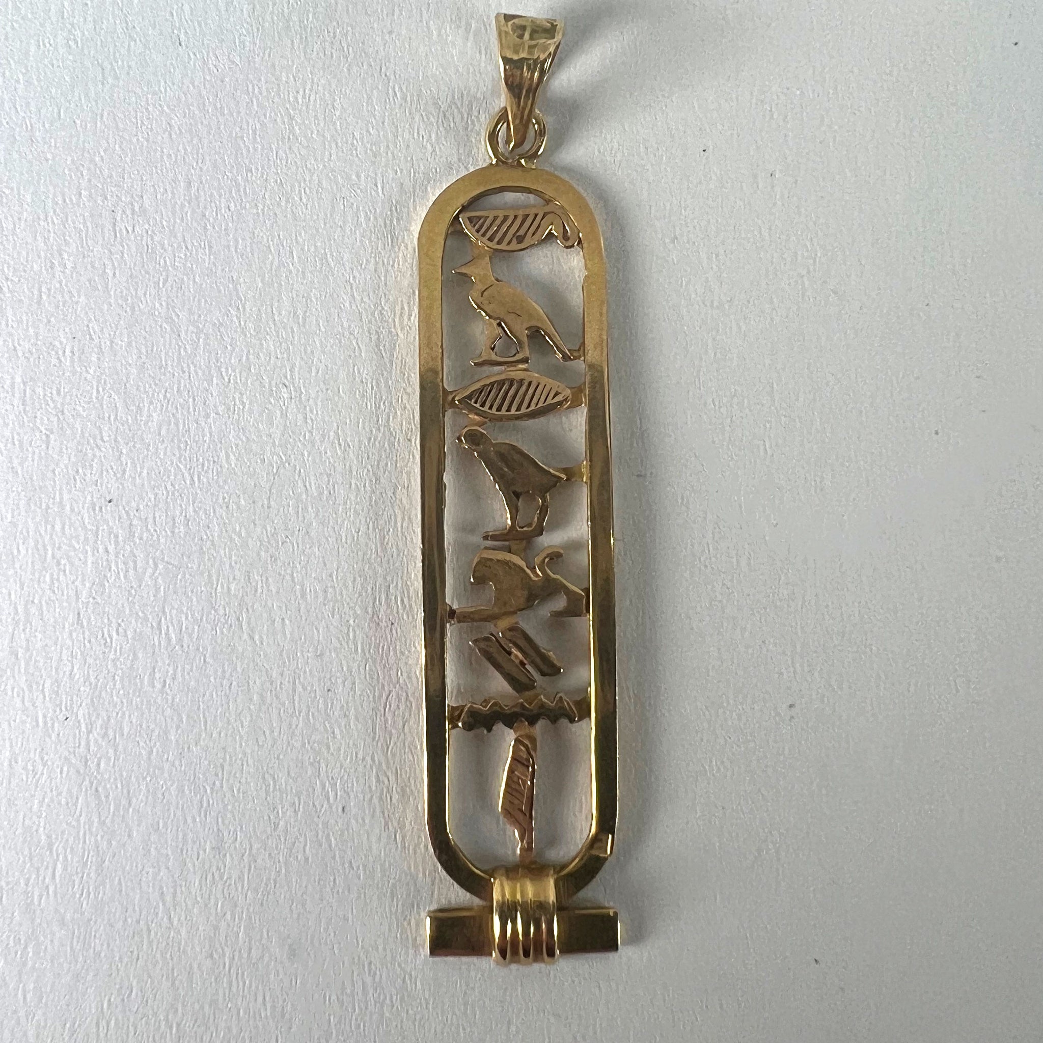 An 18 karat (18K) yellow gold charm pendant designed as an elongated rectangular tablet with Egyptian hieroglyphics. Stamped with the Egyptian mark for 18 karat gold.