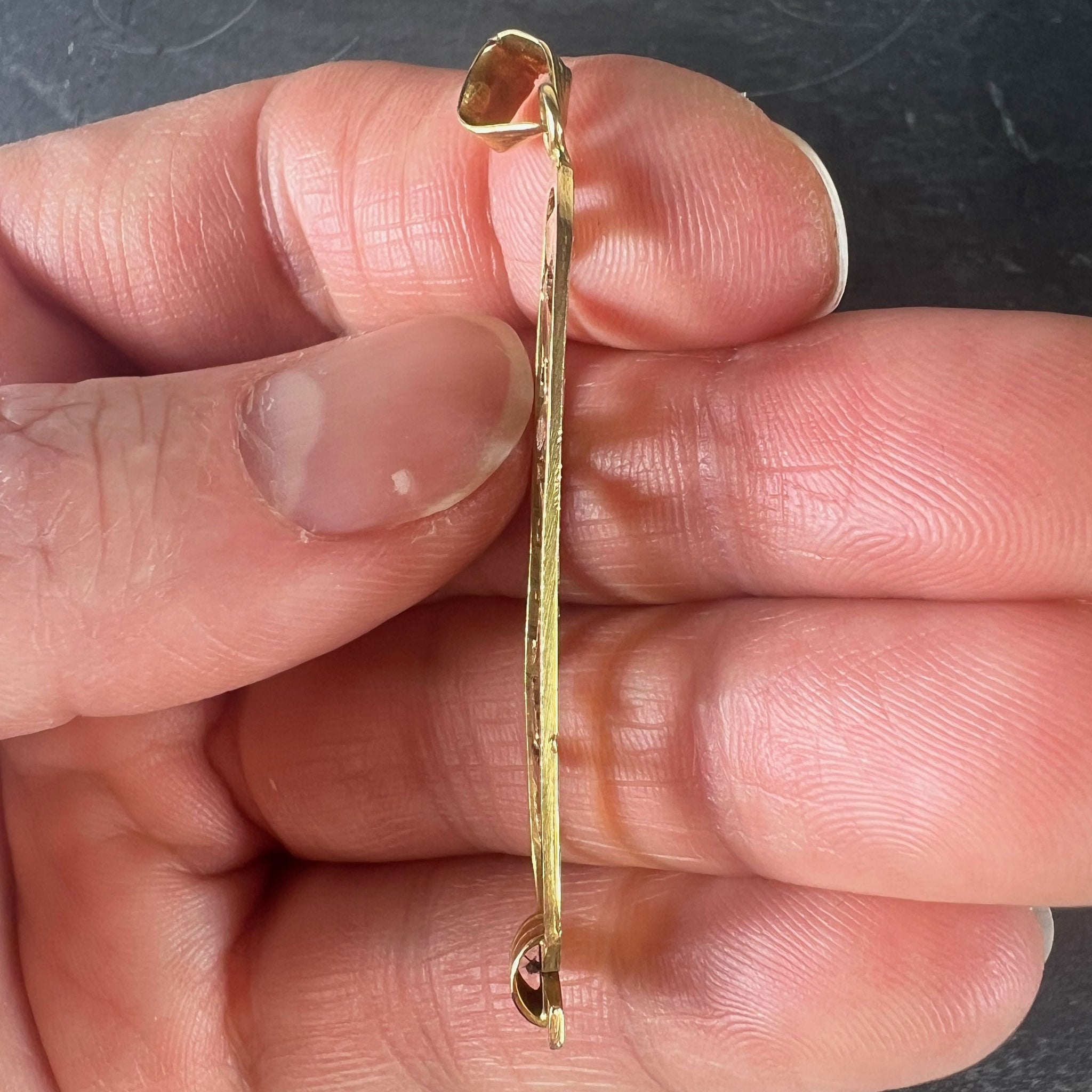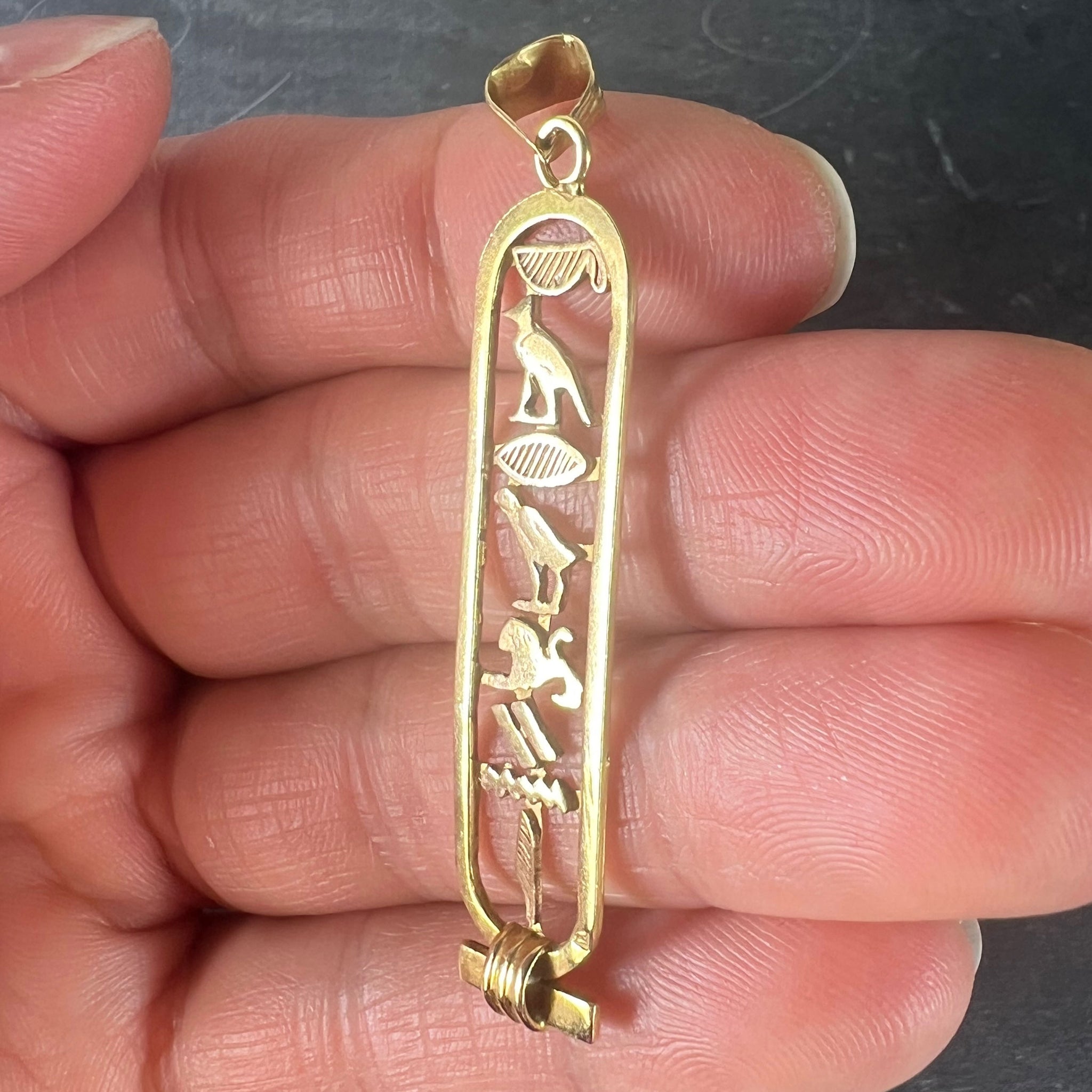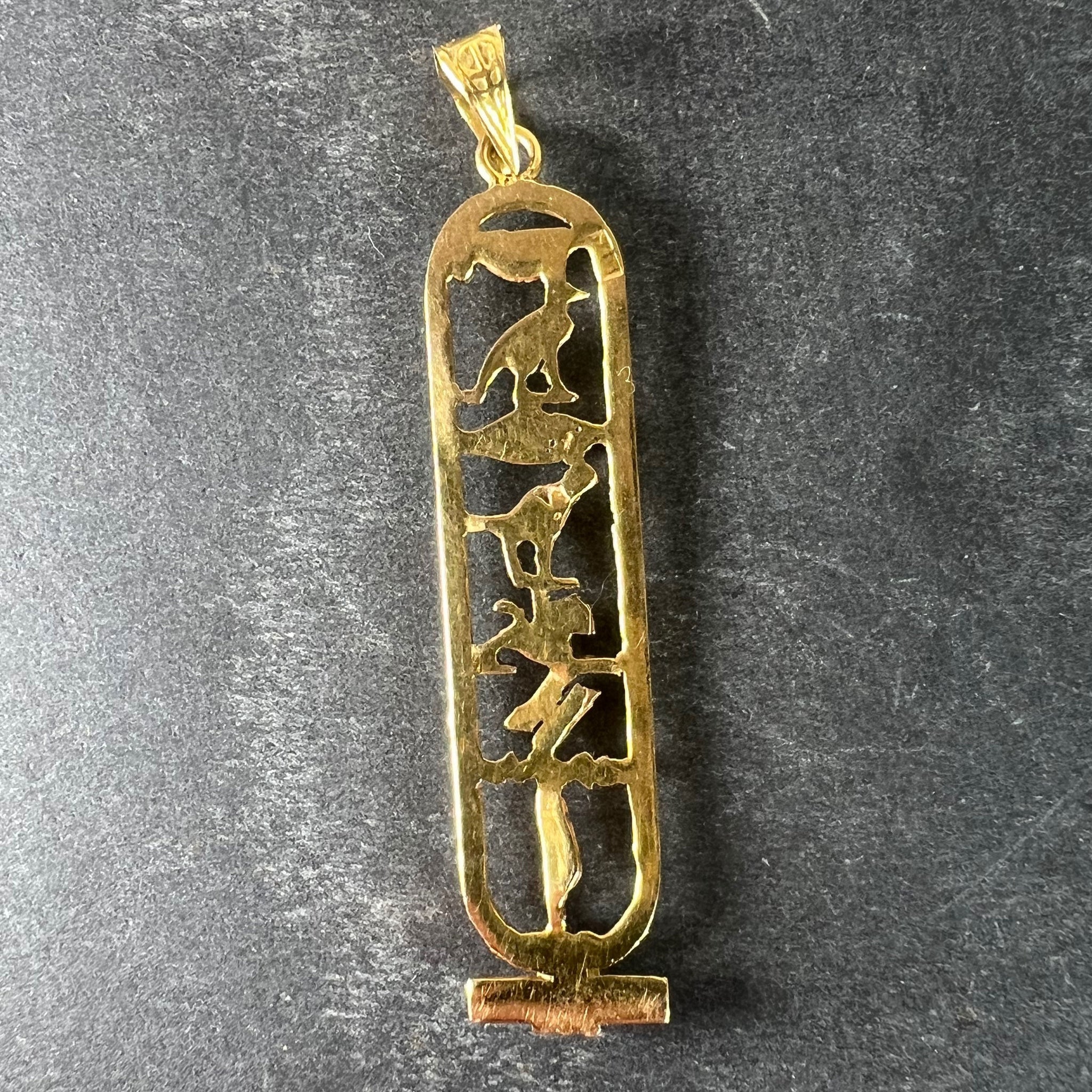 An 18 karat (18K) yellow gold charm pendant designed as an elongated rectangular tablet with Egyptian hieroglyphics. Stamped with the Egyptian mark for 18 karat gold.