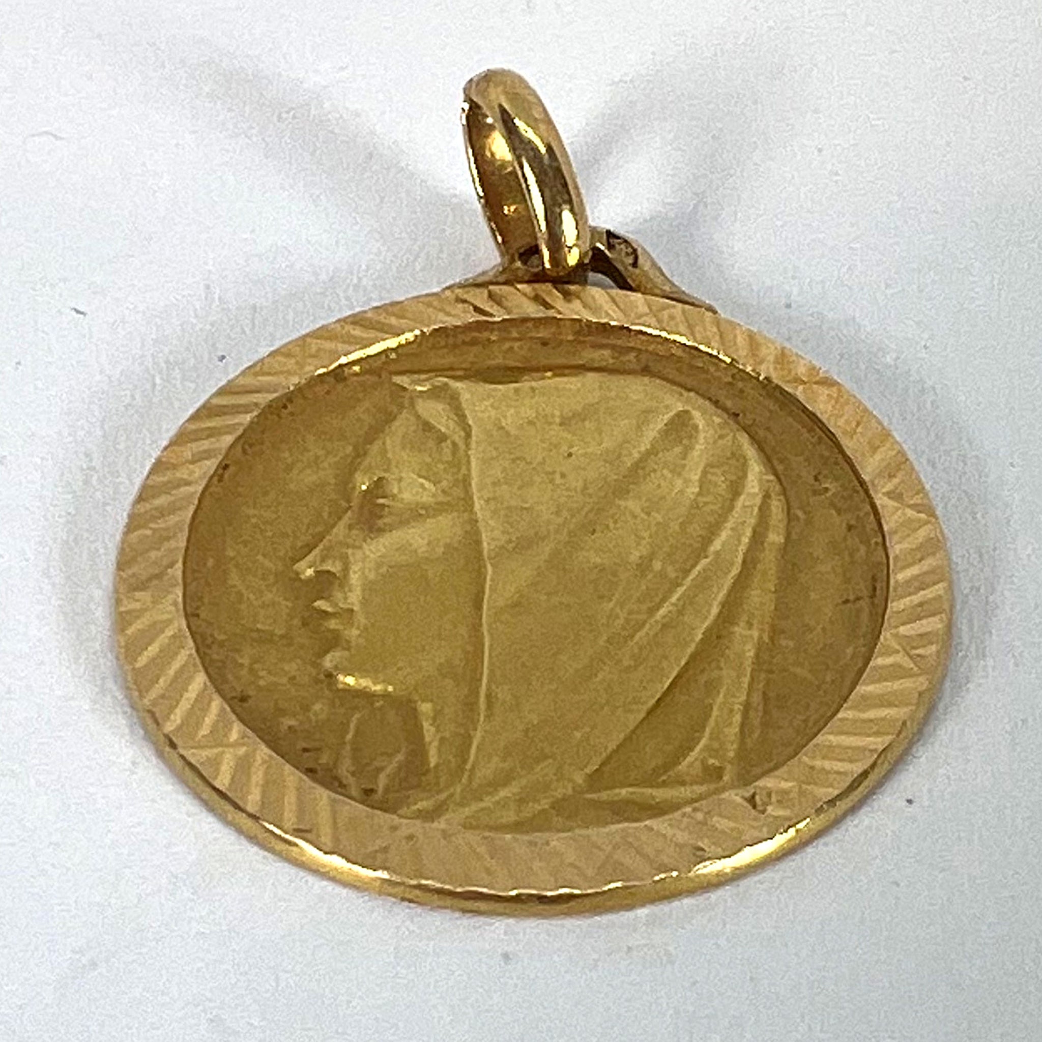 A vintage French 18 karat (18K) yellow gold charm pendant designed as a medal depicting the Virgin Mary. Engraved to the reverse ‘Martine 27-3-57’. Stamped with the French eagle’s head for 18 karat gold and an unknown maker’s mark.
