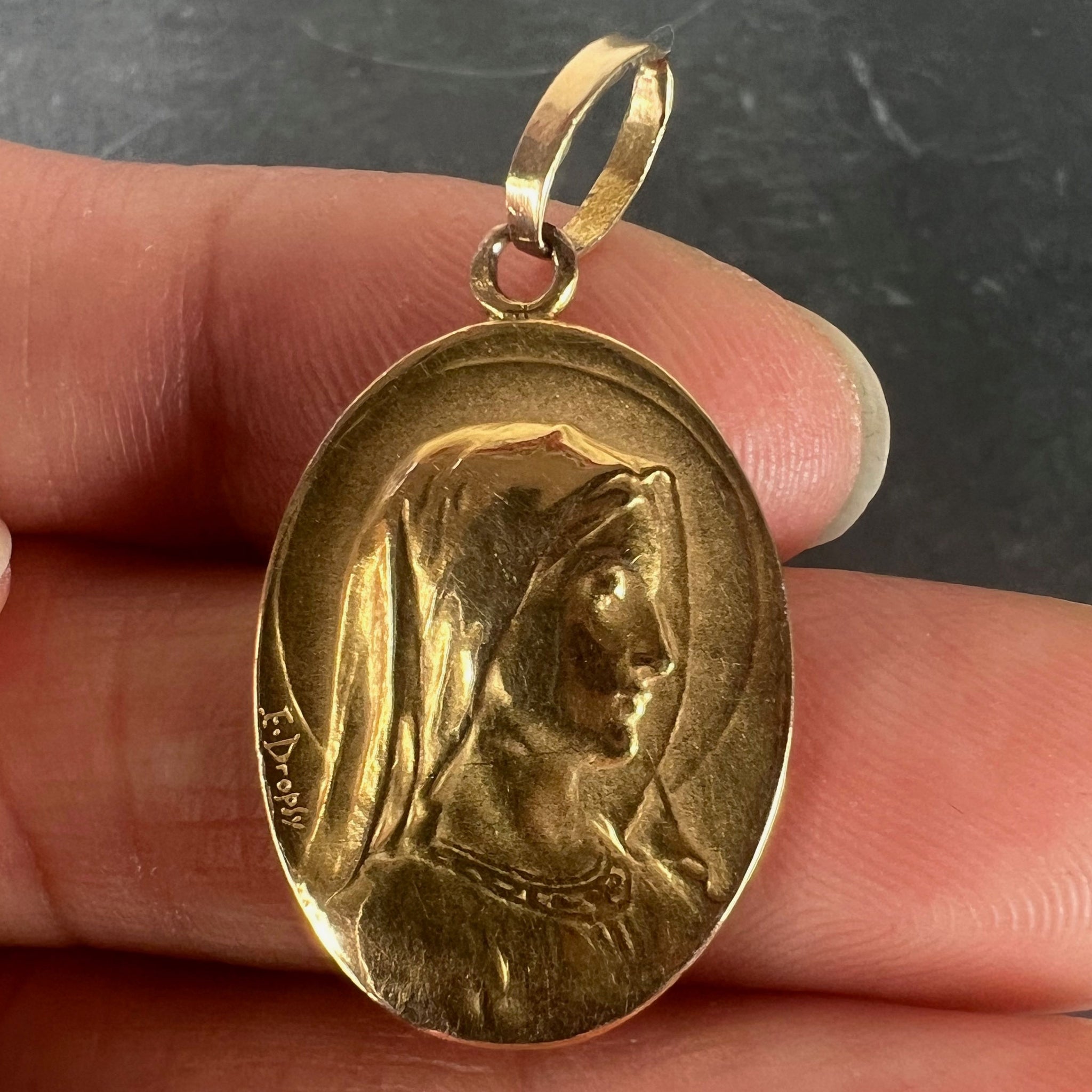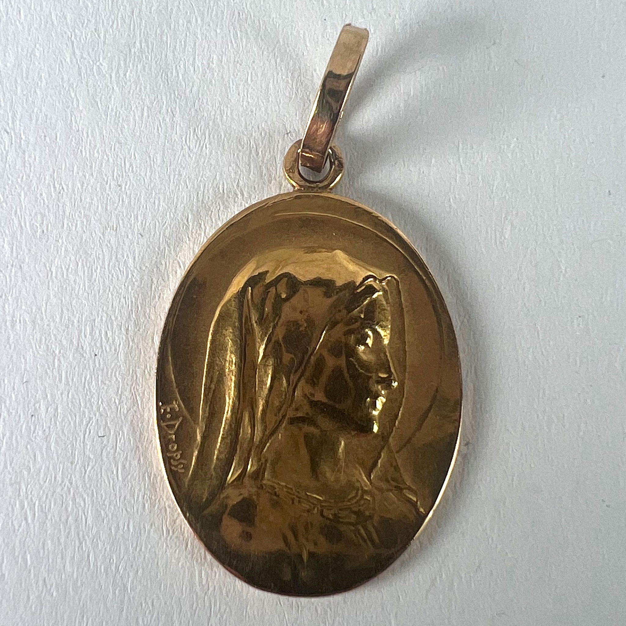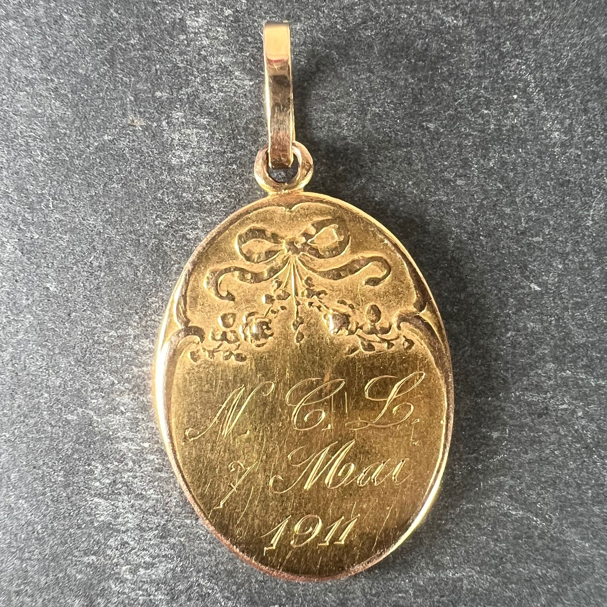 A French 18 karat (18K) yellow gold religious pendant designed as an oval medal depicting the Virgin Mary within a halo. Signed E. Dropsy for Emile Dropsy. The reverse with an arched scrolling top surmounted by a ribbon tied in a bow suspending a pair of roses, and engraved 'N. C.L., 7 Mai 1911'. Stamped with the eagle’s head for French manufacture and 18 karat gold with an illegible maker's mark.