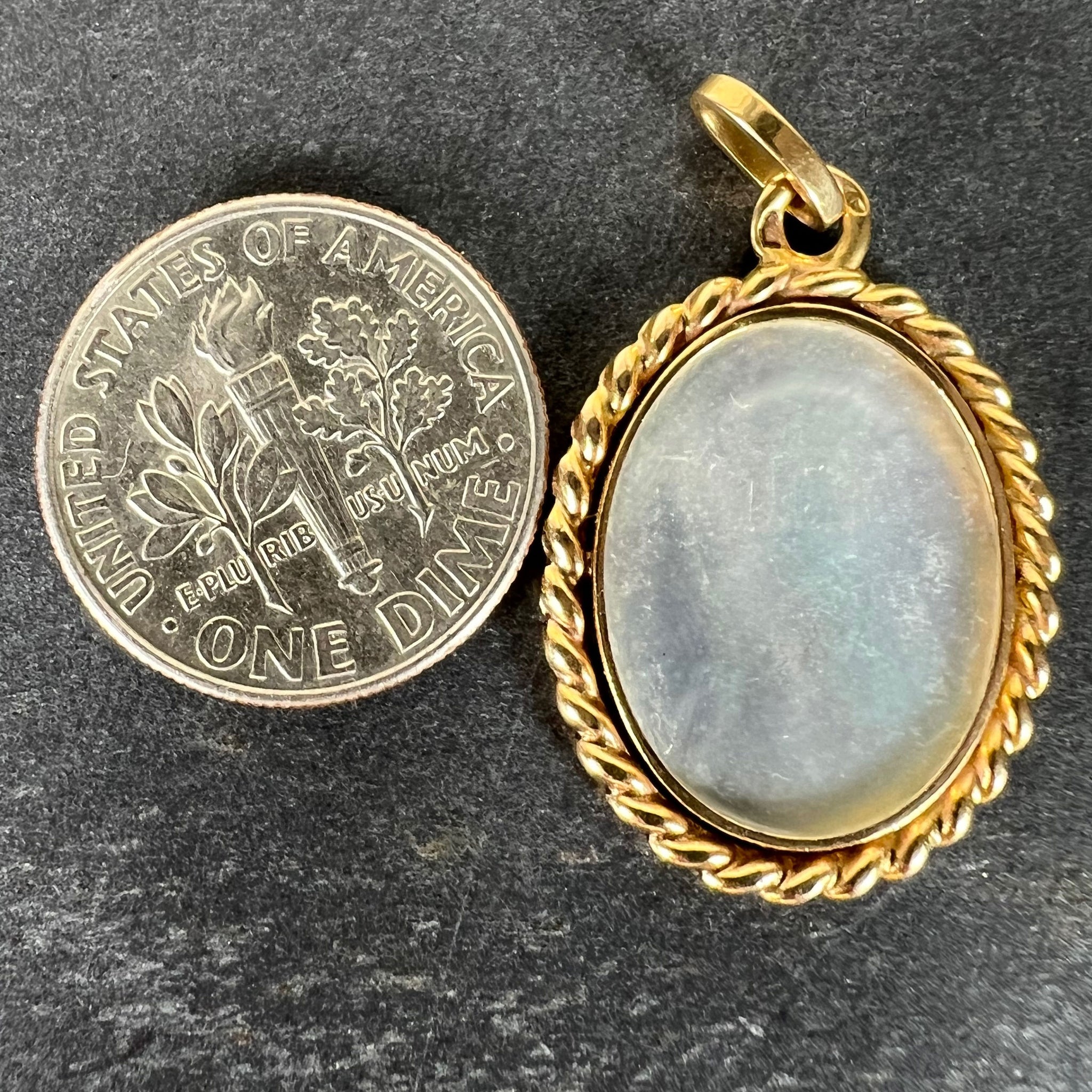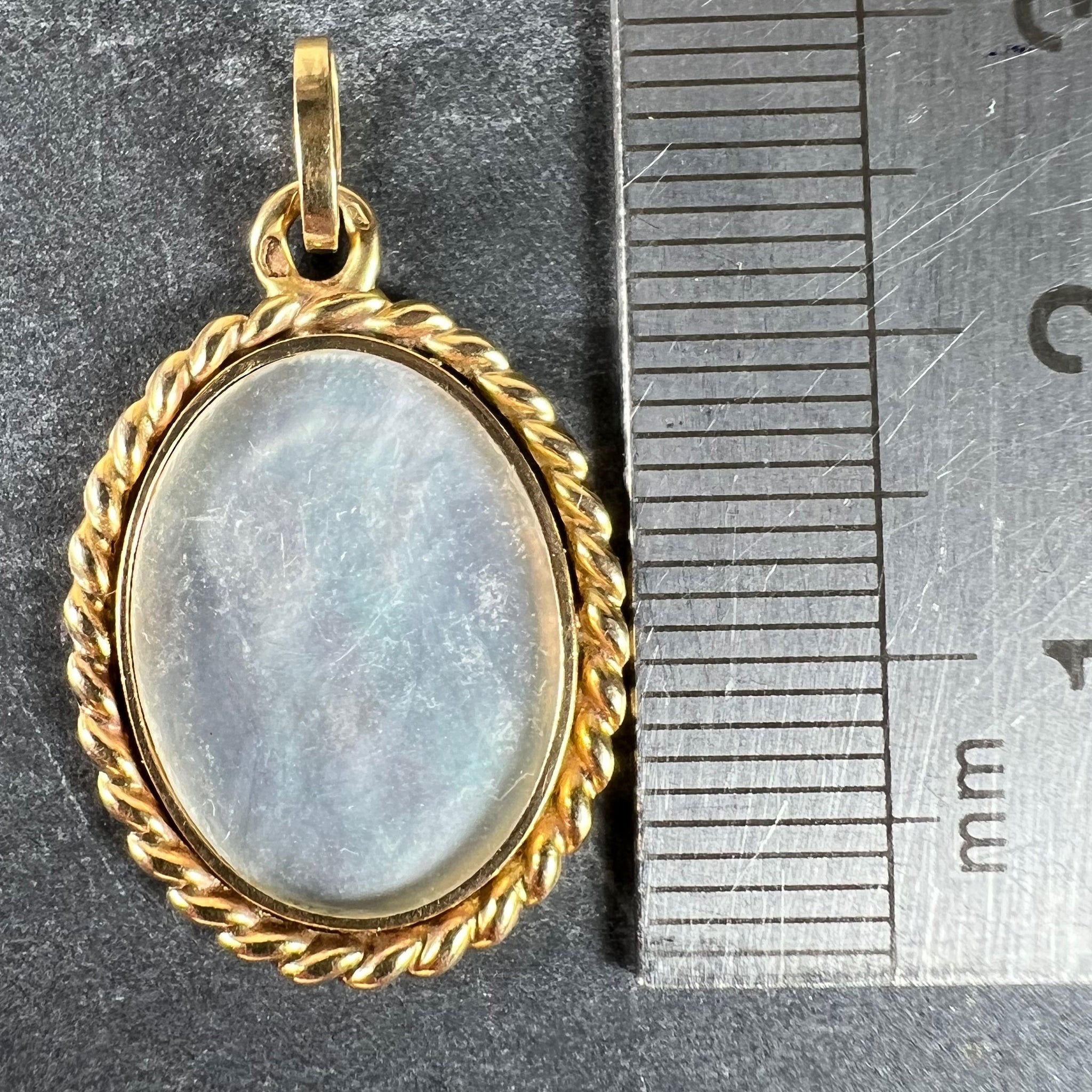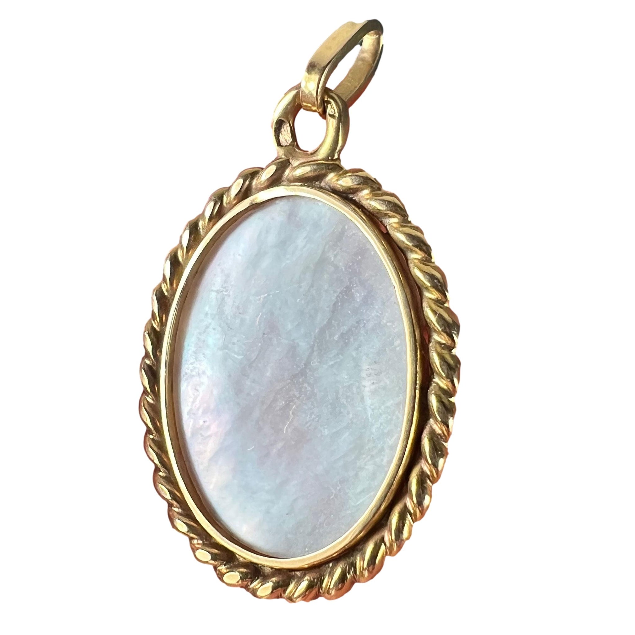 A French 18 karat (18K) yellow gold charm pendant set with an oval mother-of-pearl tablet within a twisted gold wire frame. Stamped with the eagle mark for 18 karat gold and French manufacture along with an unknown maker's mark.