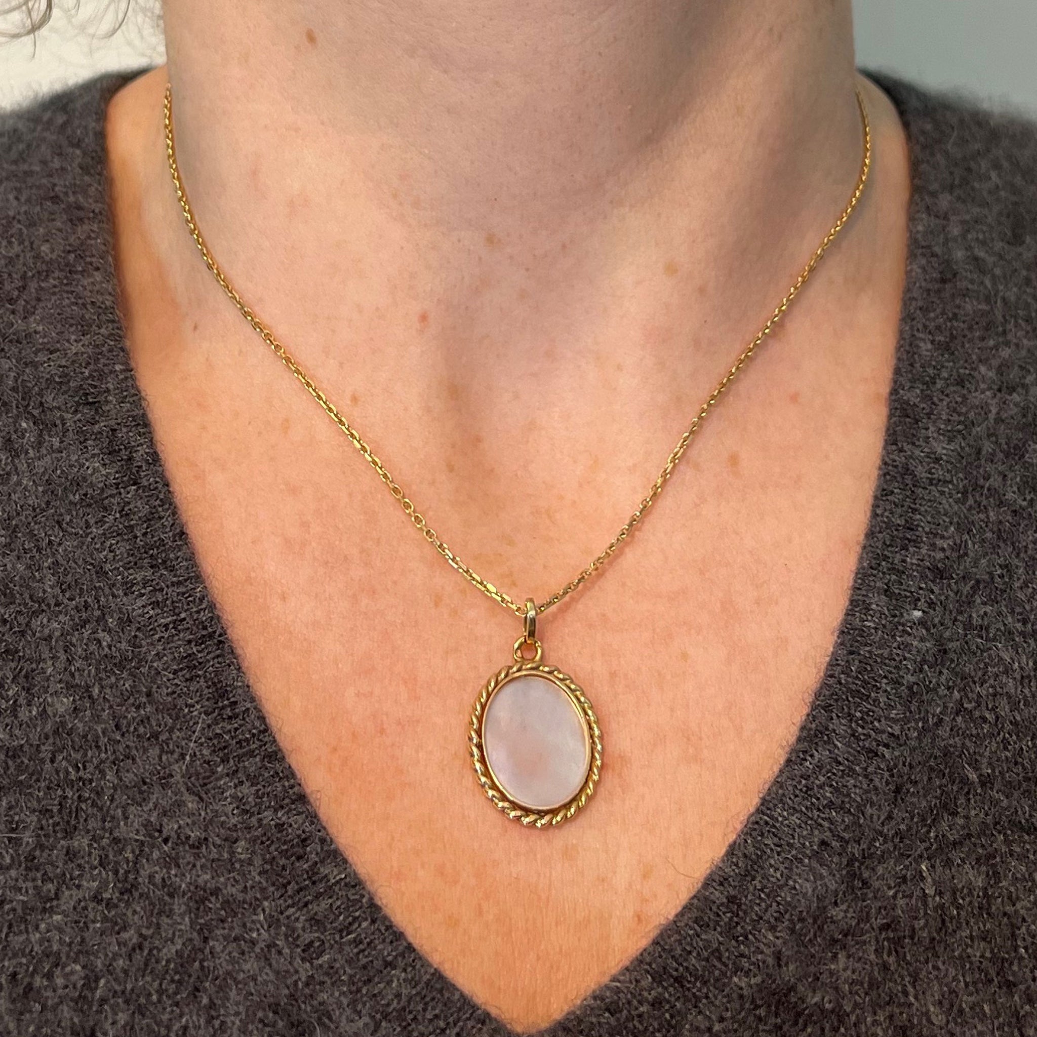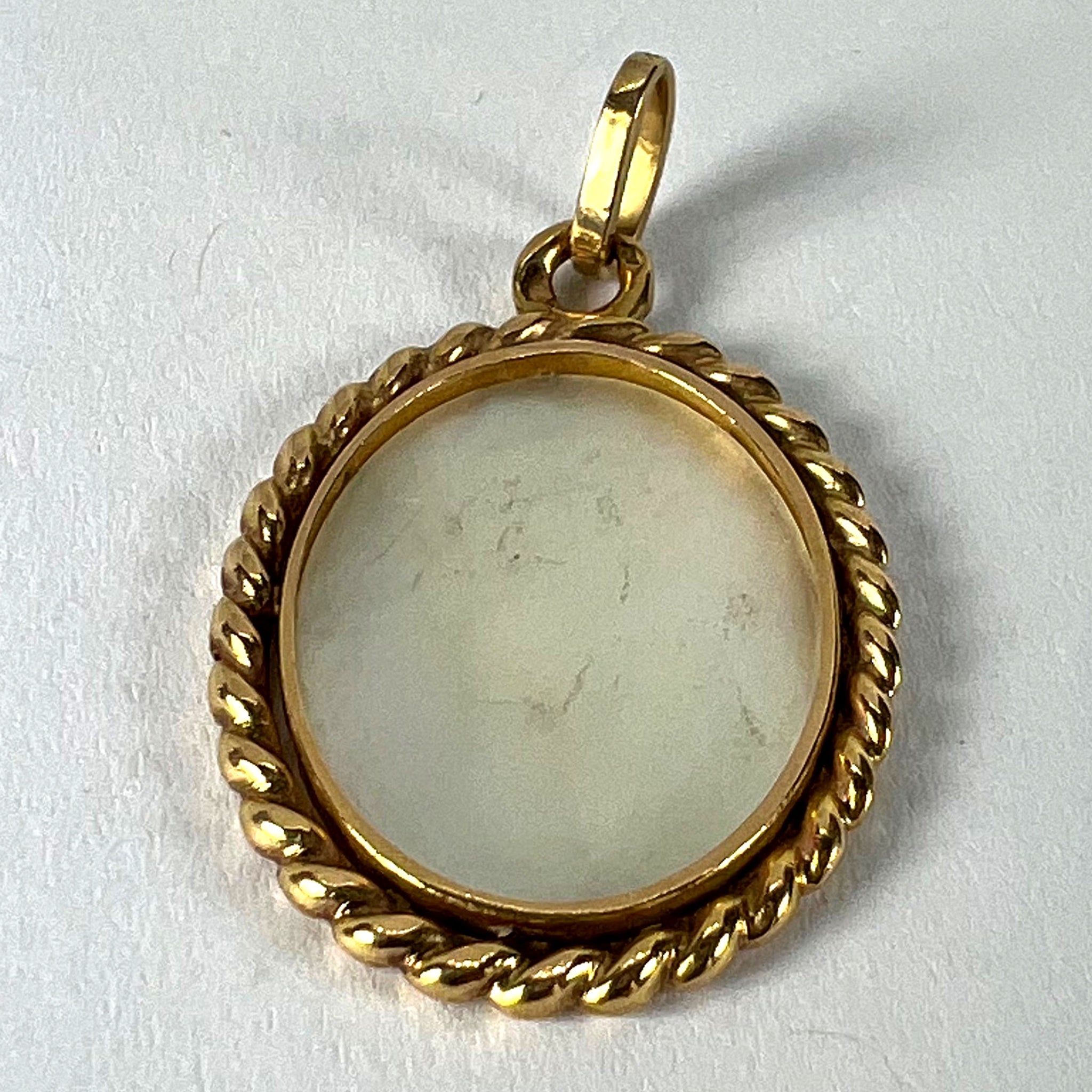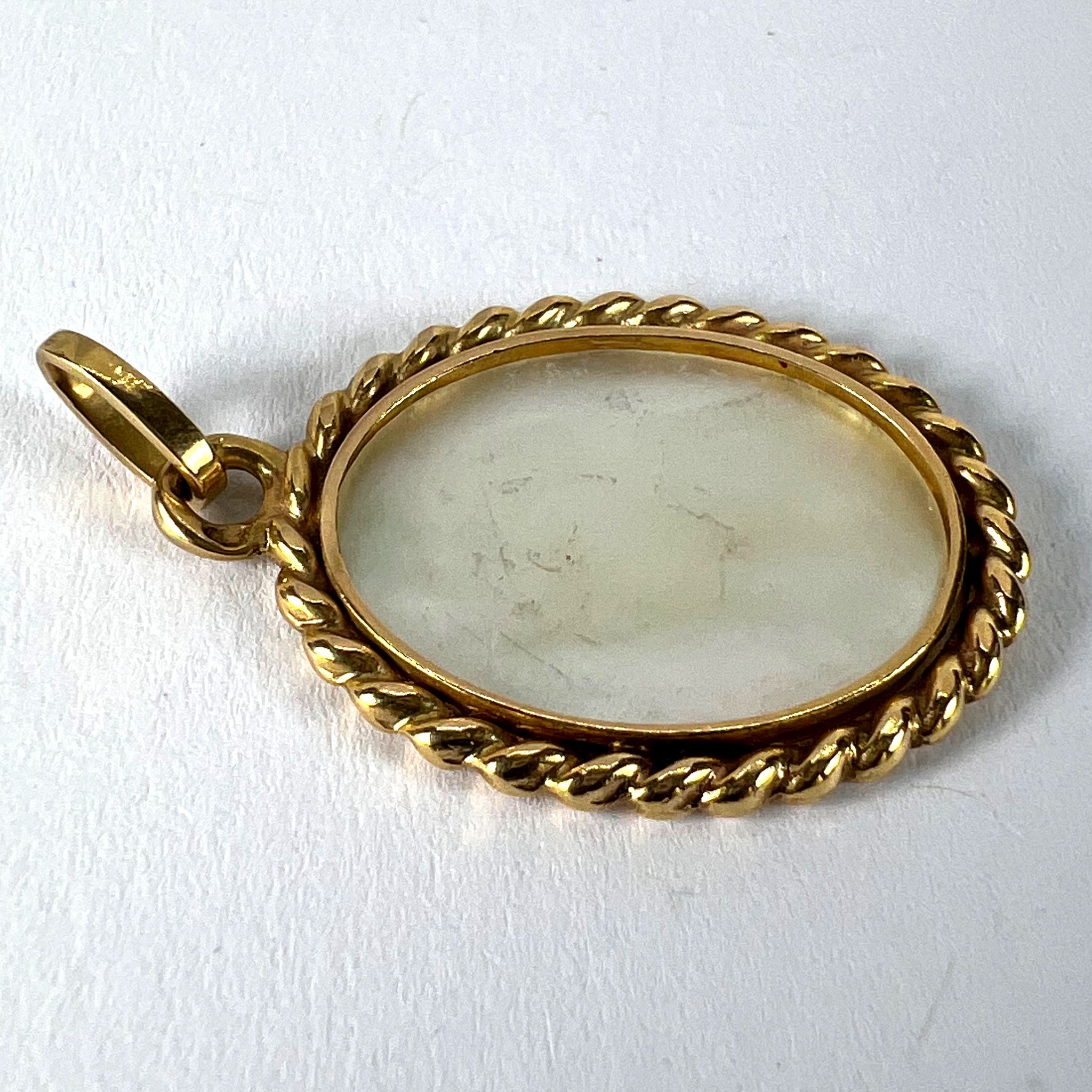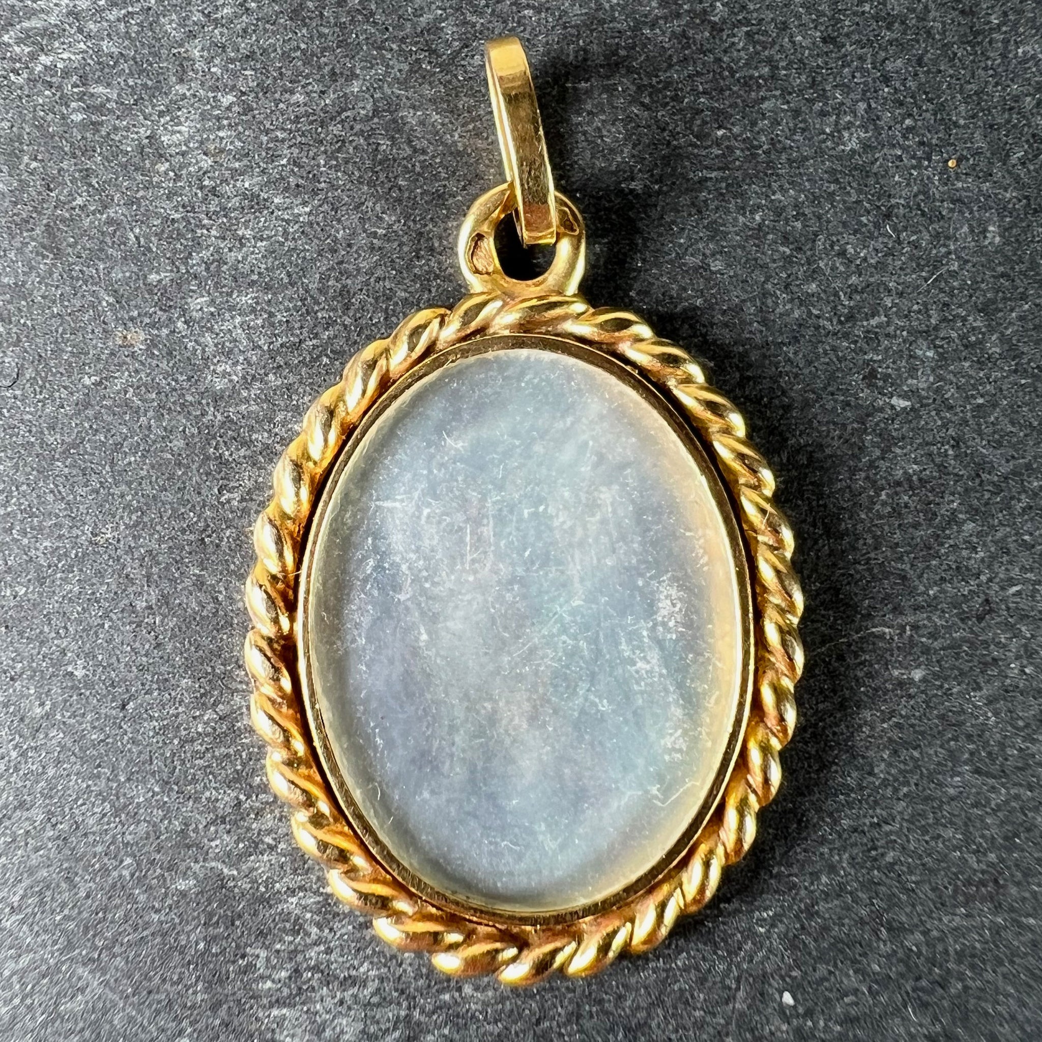 A French 18 karat (18K) yellow gold charm pendant set with an oval mother-of-pearl tablet within a twisted gold wire frame. Stamped with the eagle mark for 18 karat gold and French manufacture along with an unknown maker's mark.