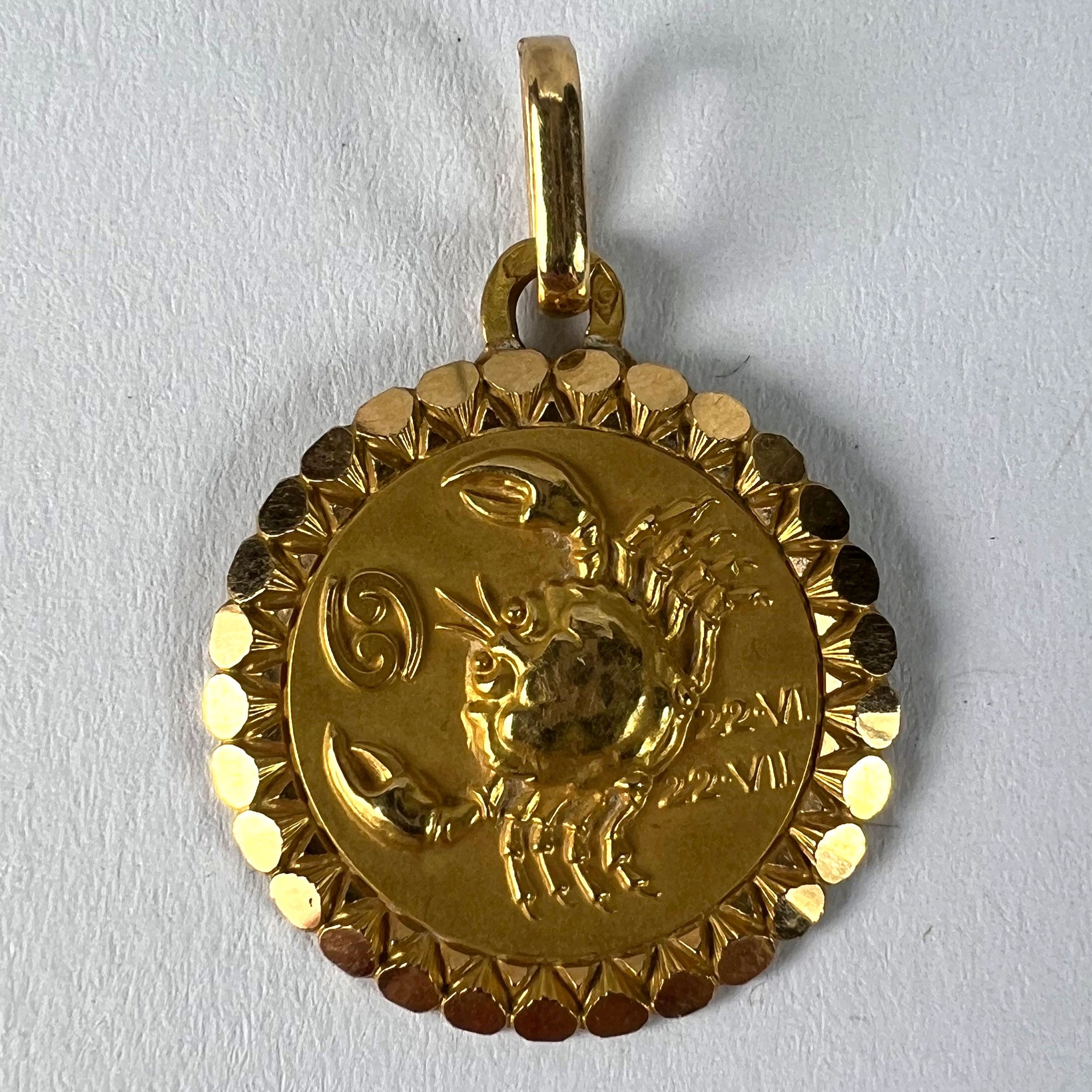 An 18 karat (18K) yellow gold charm pendant designed as the Zodiac sign of Cancer, depicting a crab with the dates 22 VI (June) and 22 VII (July). Stamped with the eagle mark for 18 karat gold and French manufacture with maker's mark for Perroud.