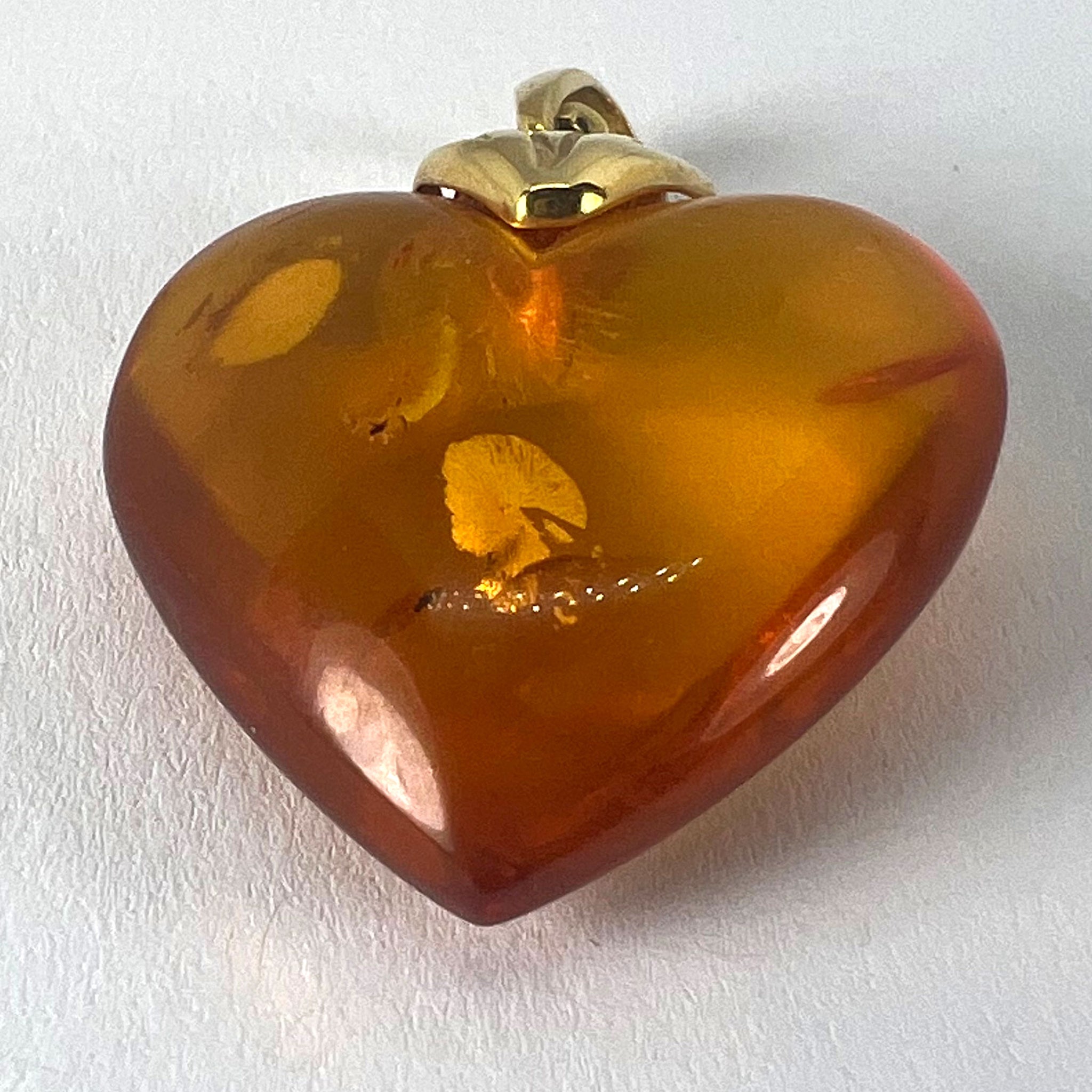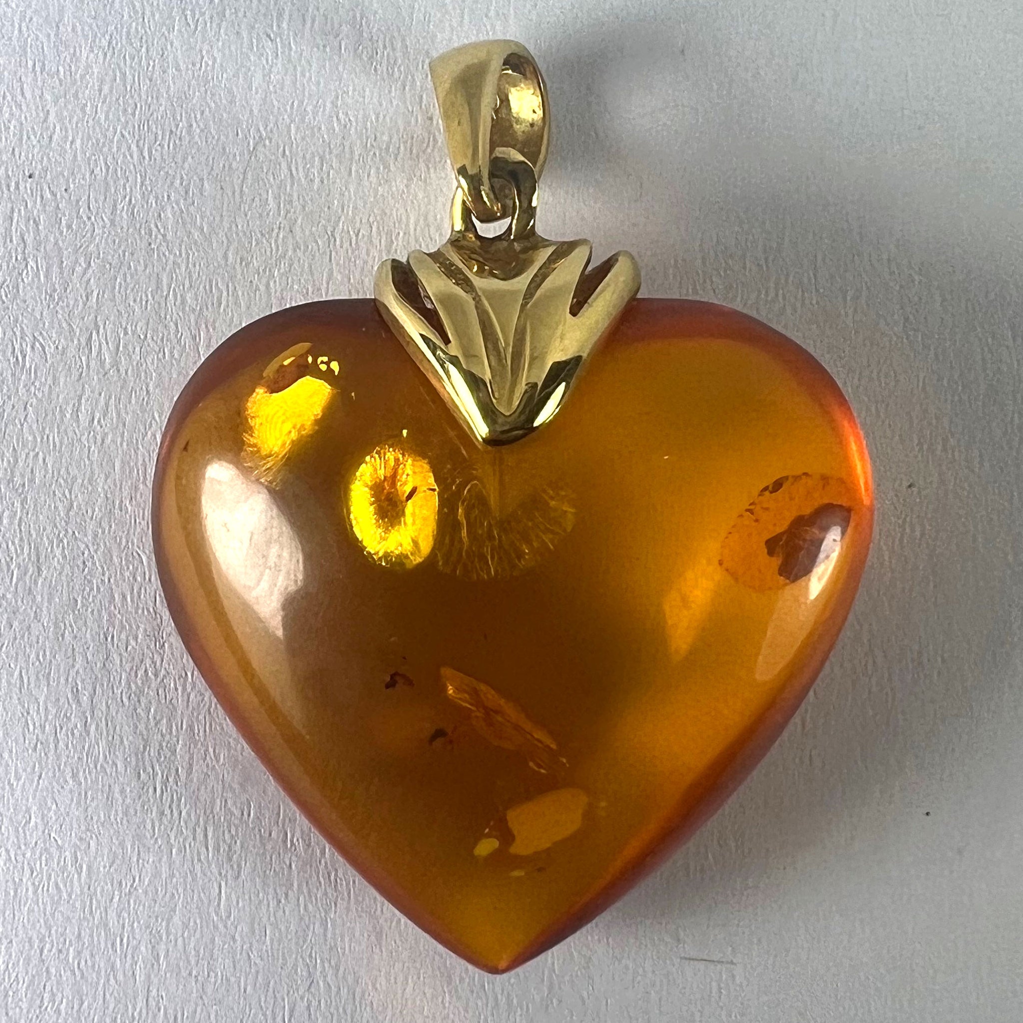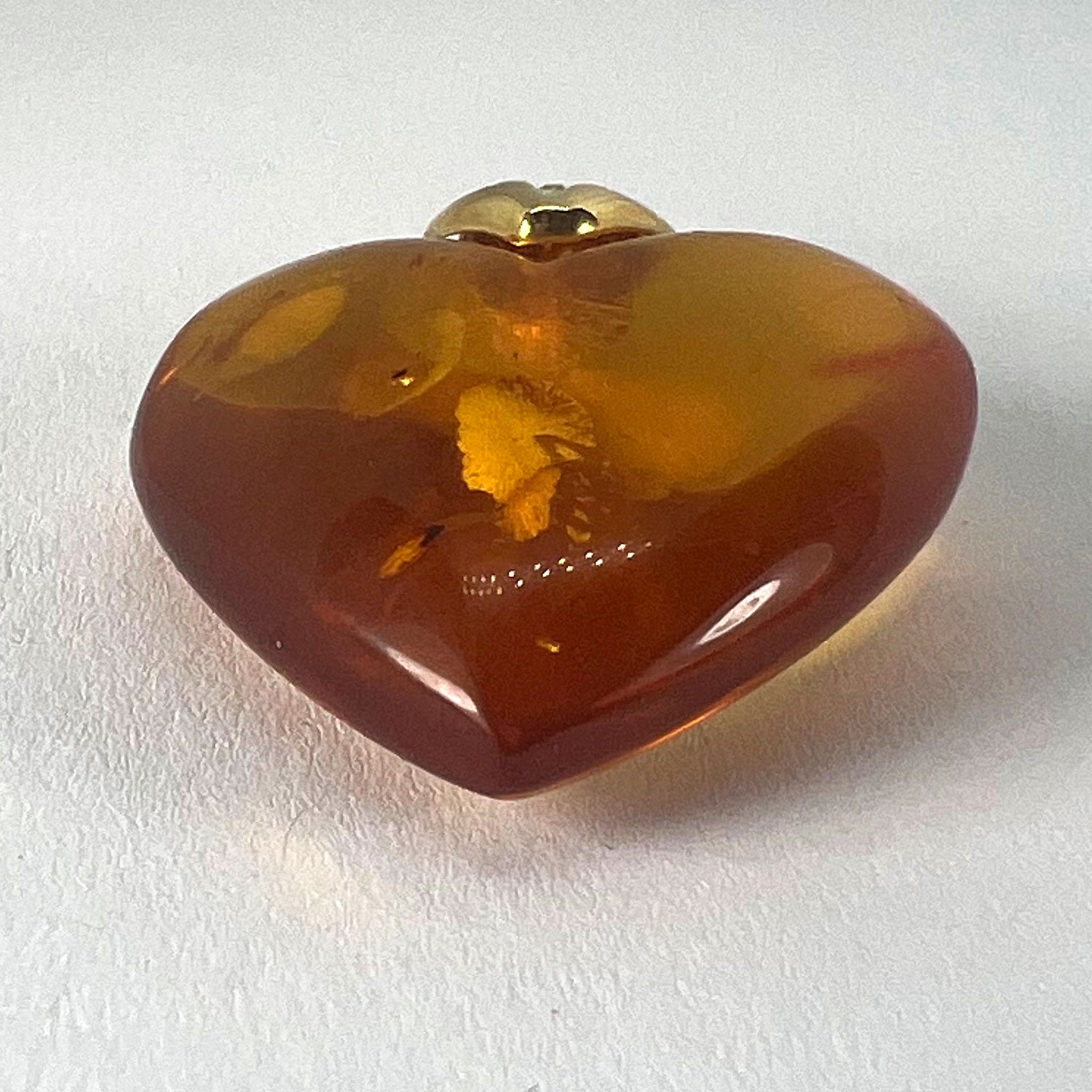 A large vintage French 18 karat (18K) yellow gold and clarified amber pendant designed as a puffy heart with sun spangle inclusions. Partially stamped with the eagle's head mark for French manufacture and 18 karat gold.