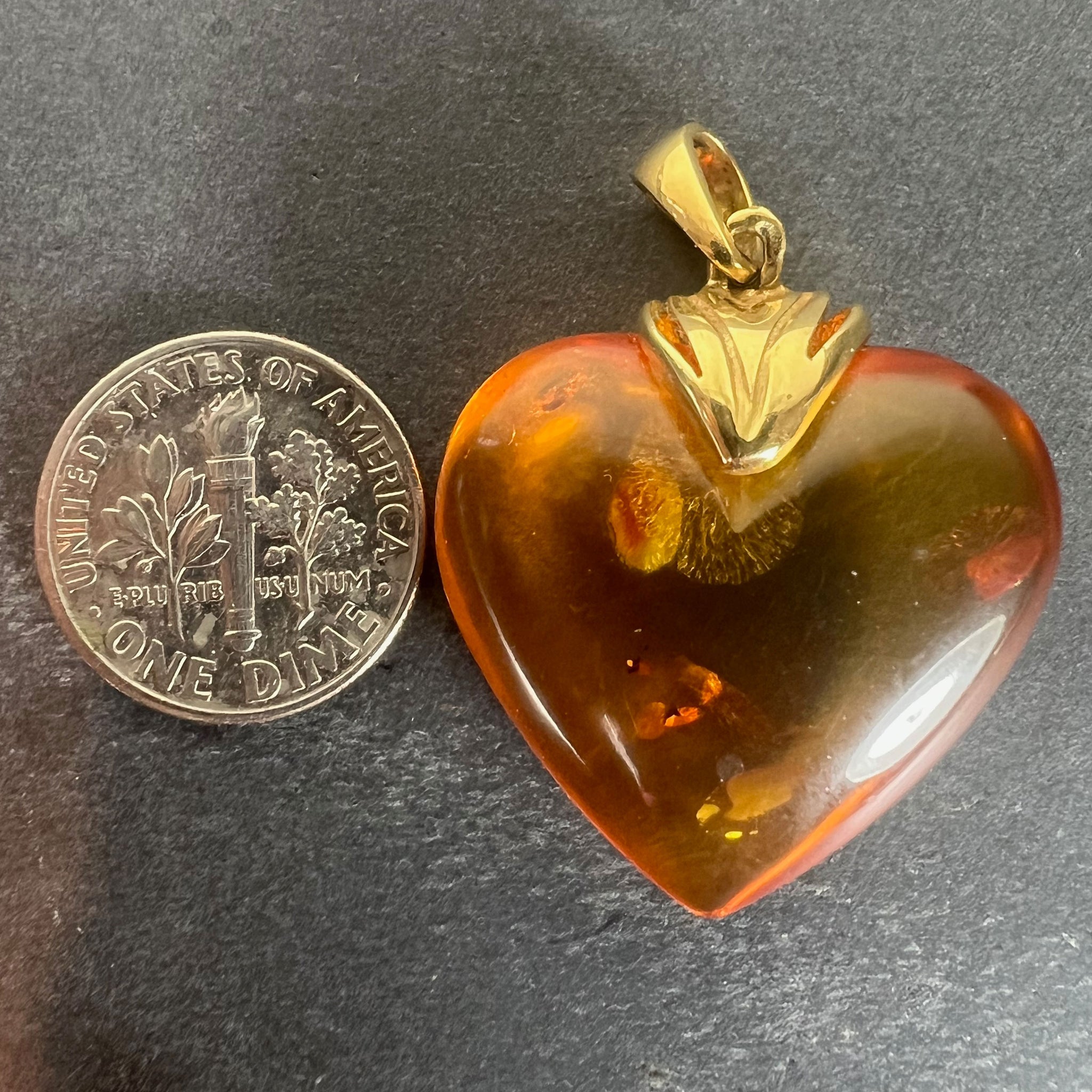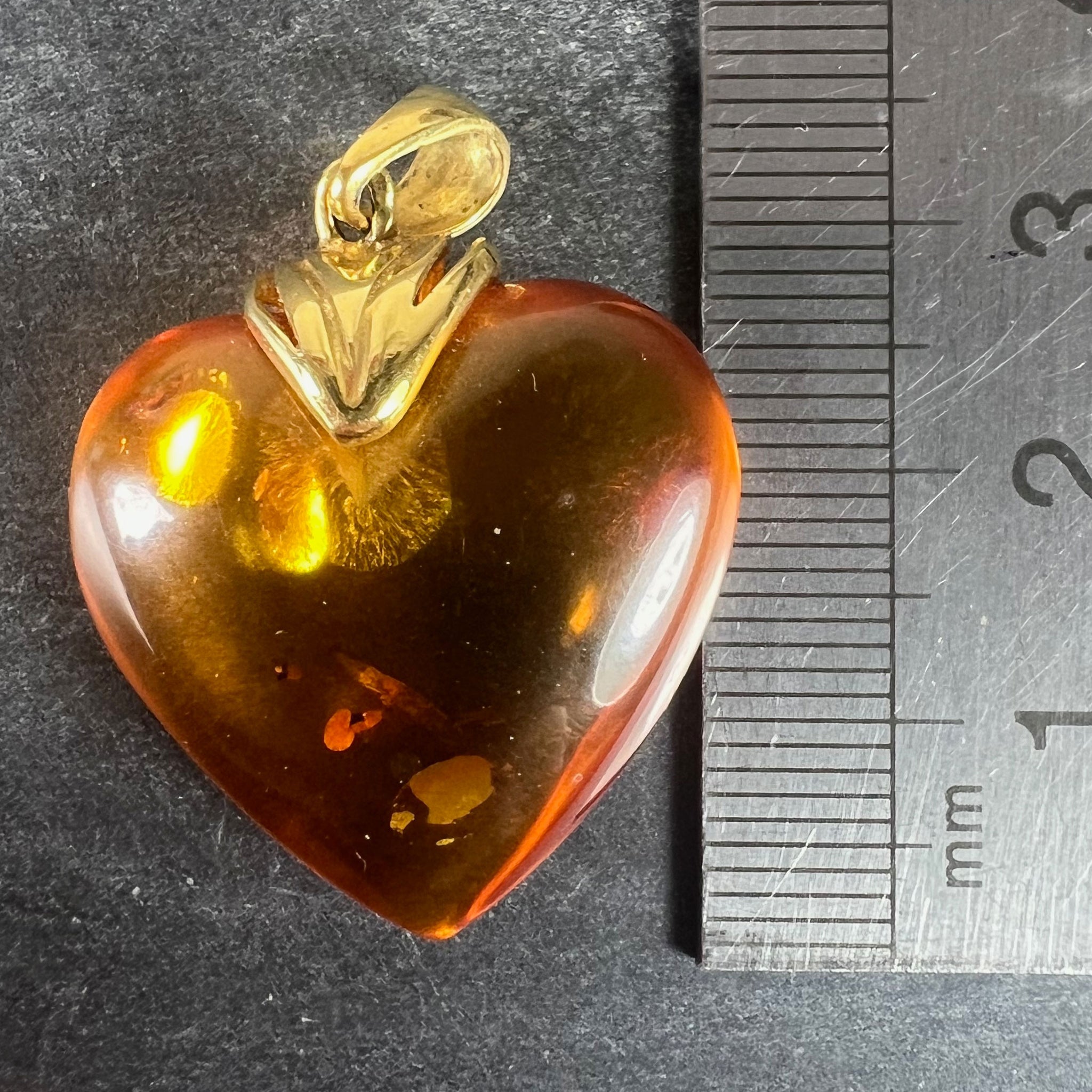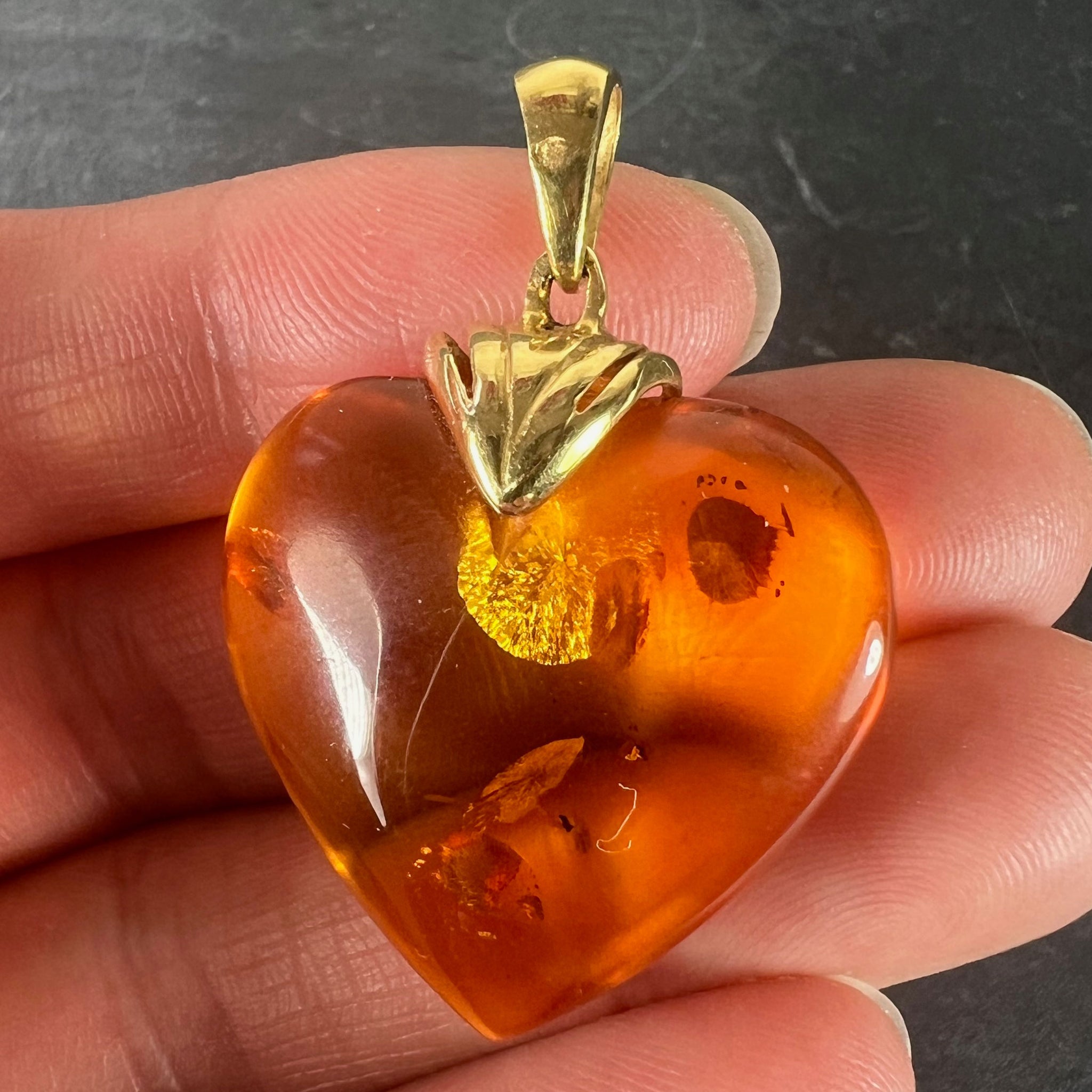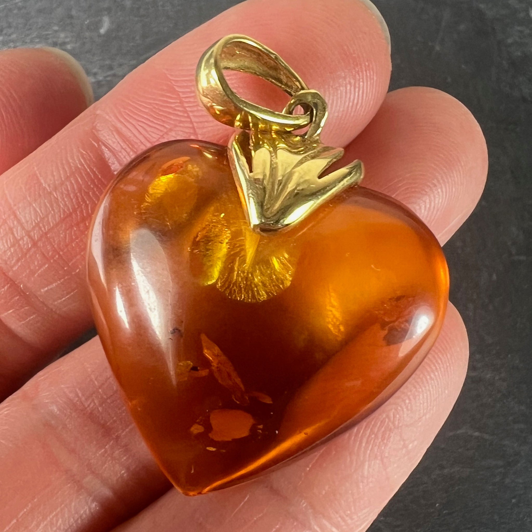 A large vintage French 18 karat (18K) yellow gold and clarified amber pendant designed as a puffy heart with sun spangle inclusions. Partially stamped with the eagle's head mark for French manufacture and 18 karat gold.