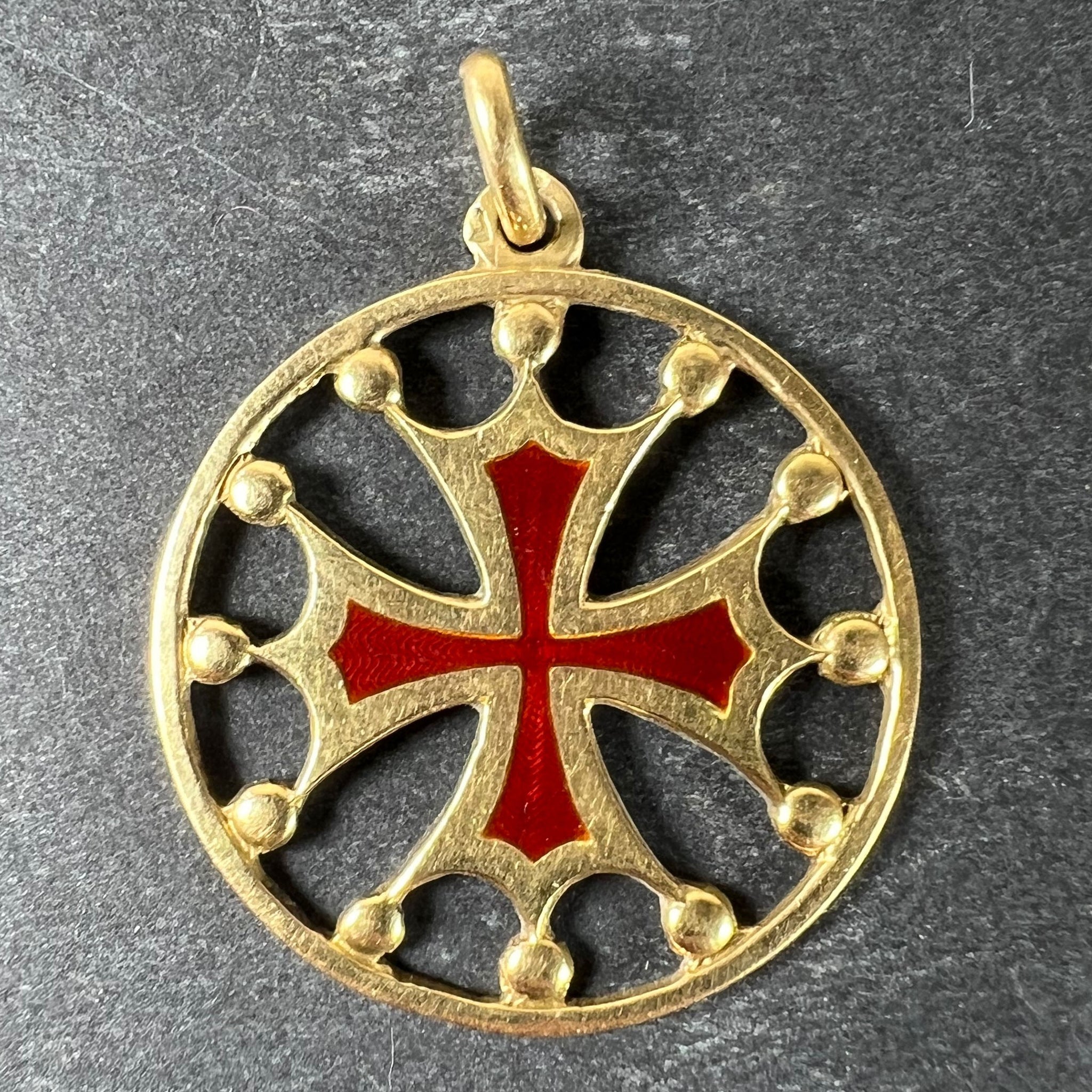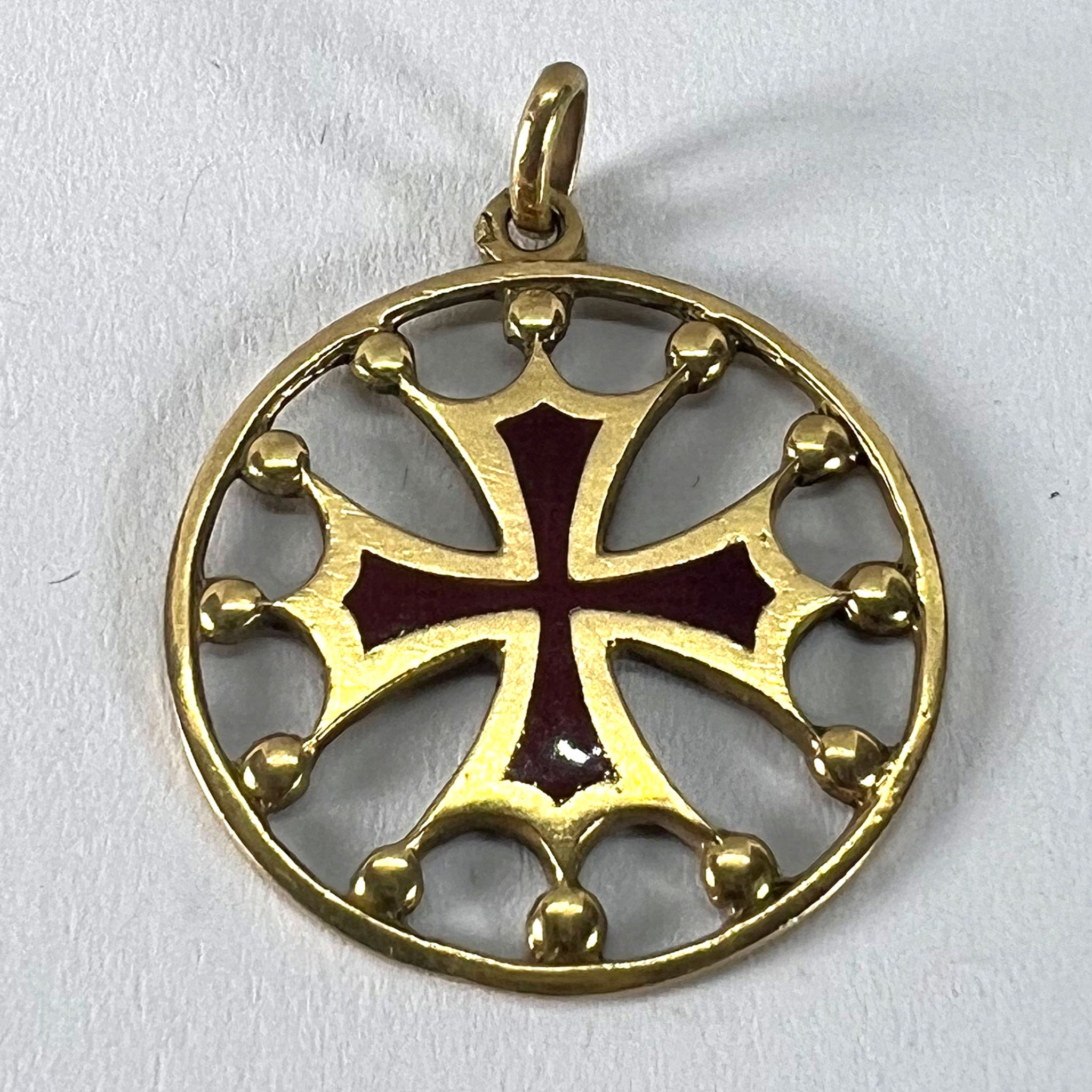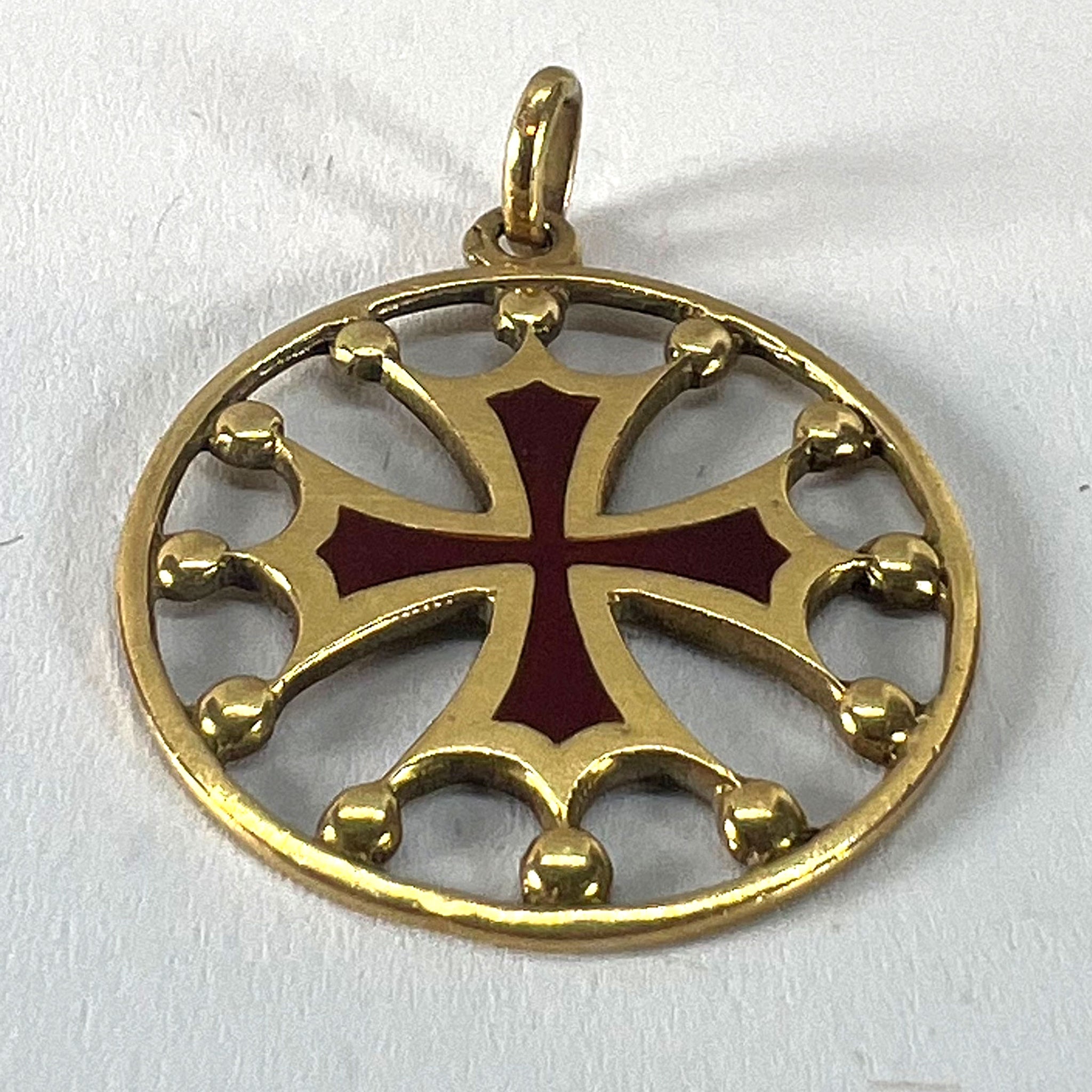 A vintage French 18 karat (18K) yellow gold pendant designed as a maltese cross in circular frame with red enamel detail and gold balls connecting it to the circular frame. Stamped with the horse's head mark for 18 karat gold and French manufacture along with an unknown maker's mark.