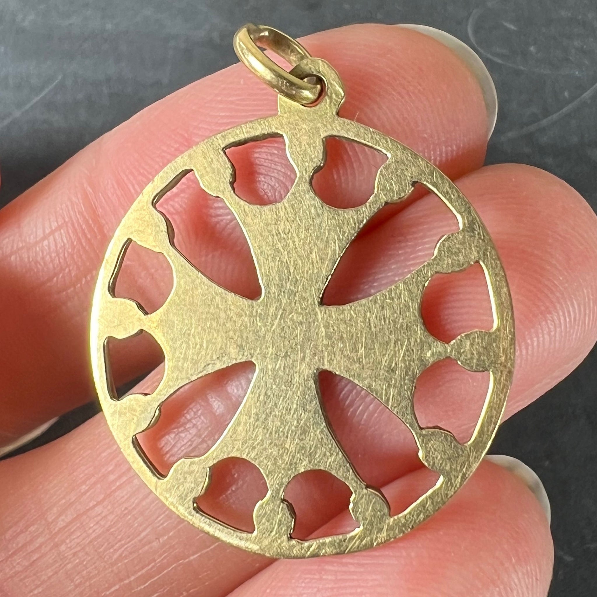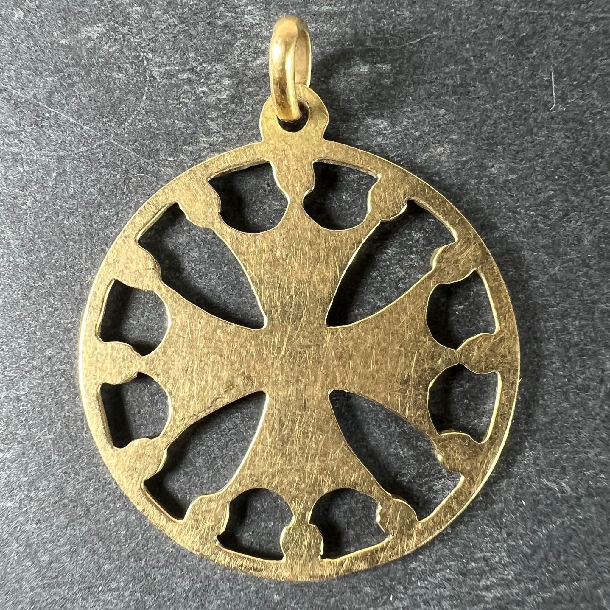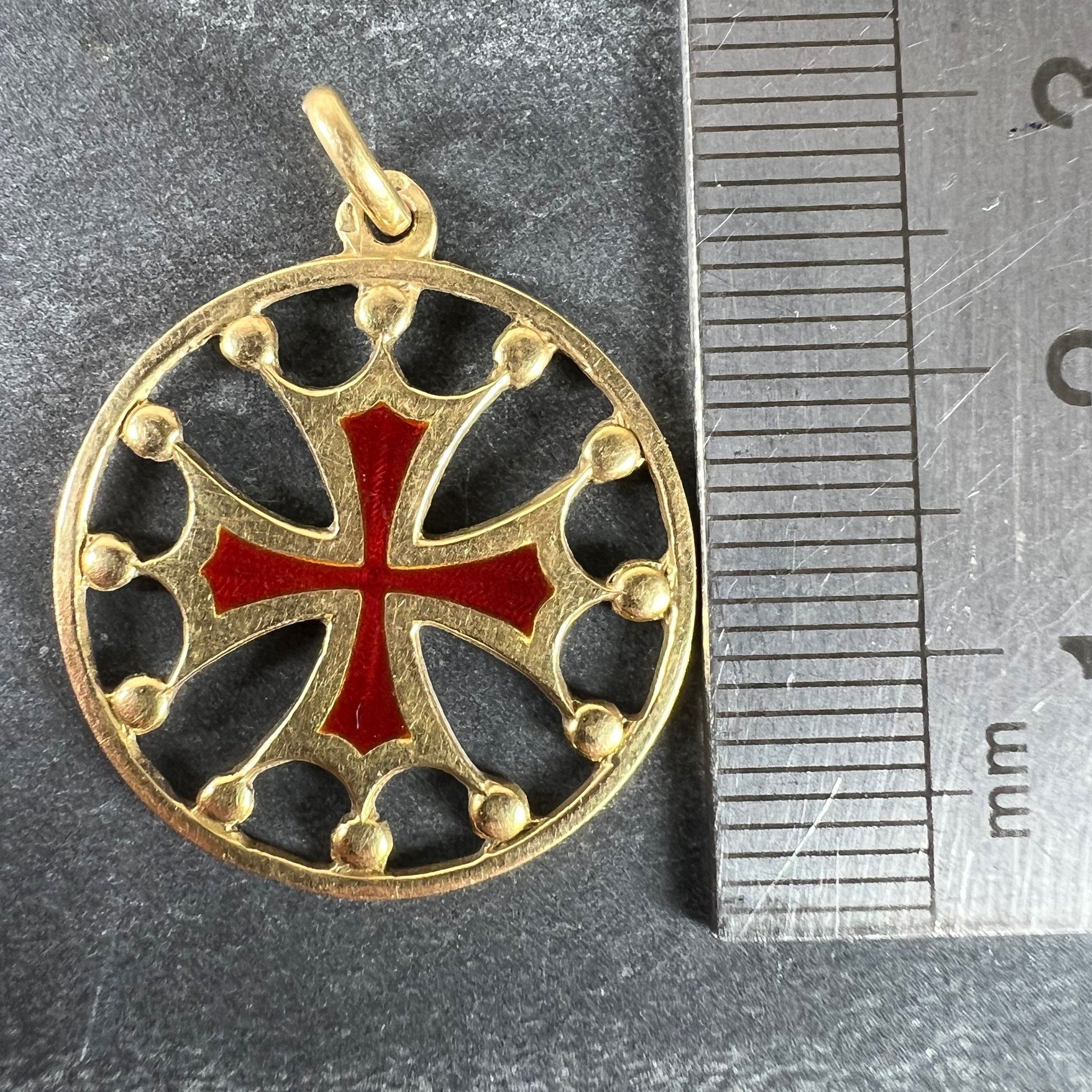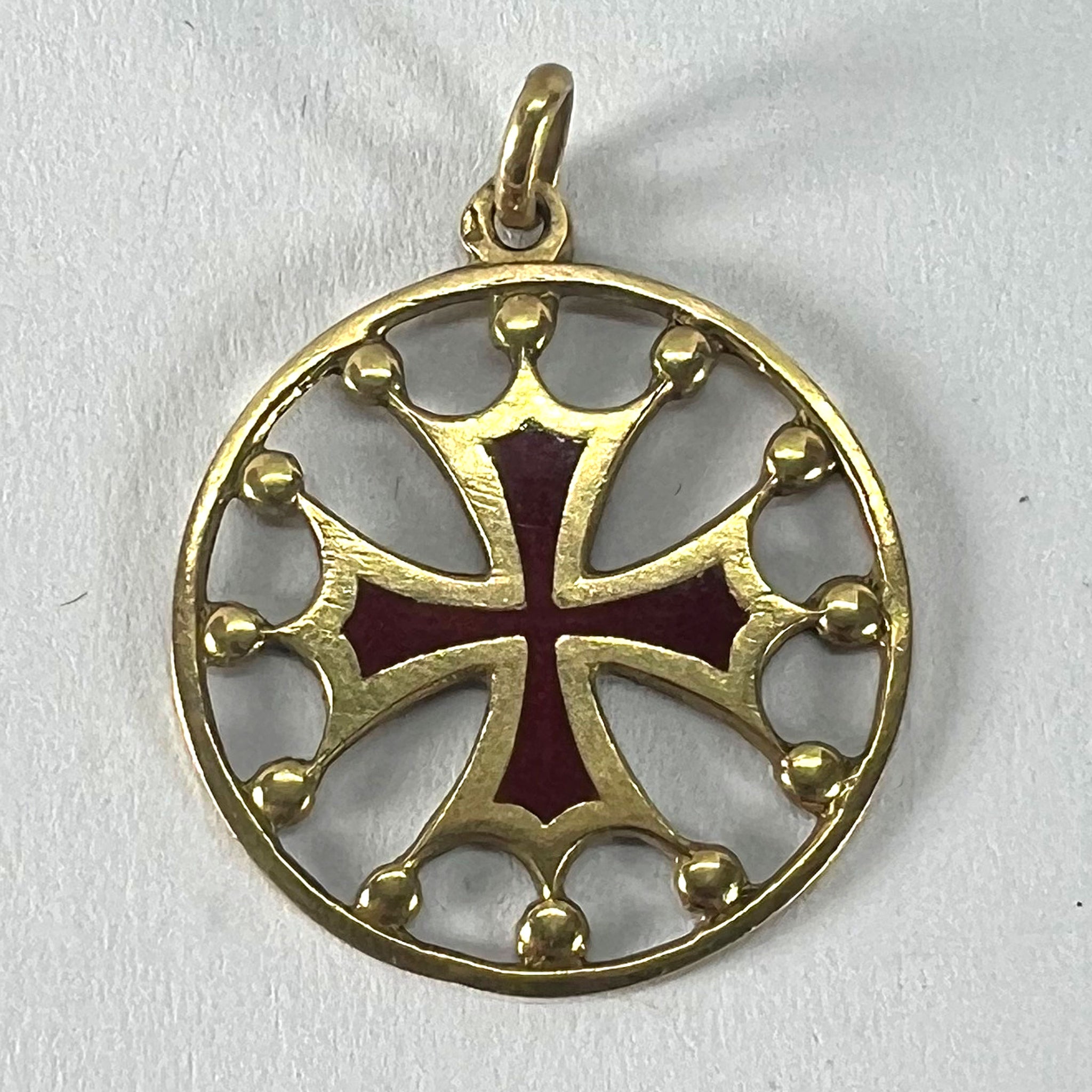 A vintage French 18 karat (18K) yellow gold pendant designed as a maltese cross in circular frame with red enamel detail and gold balls connecting it to the circular frame. Stamped with the horse's head mark for 18 karat gold and French manufacture along with an unknown maker's mark.