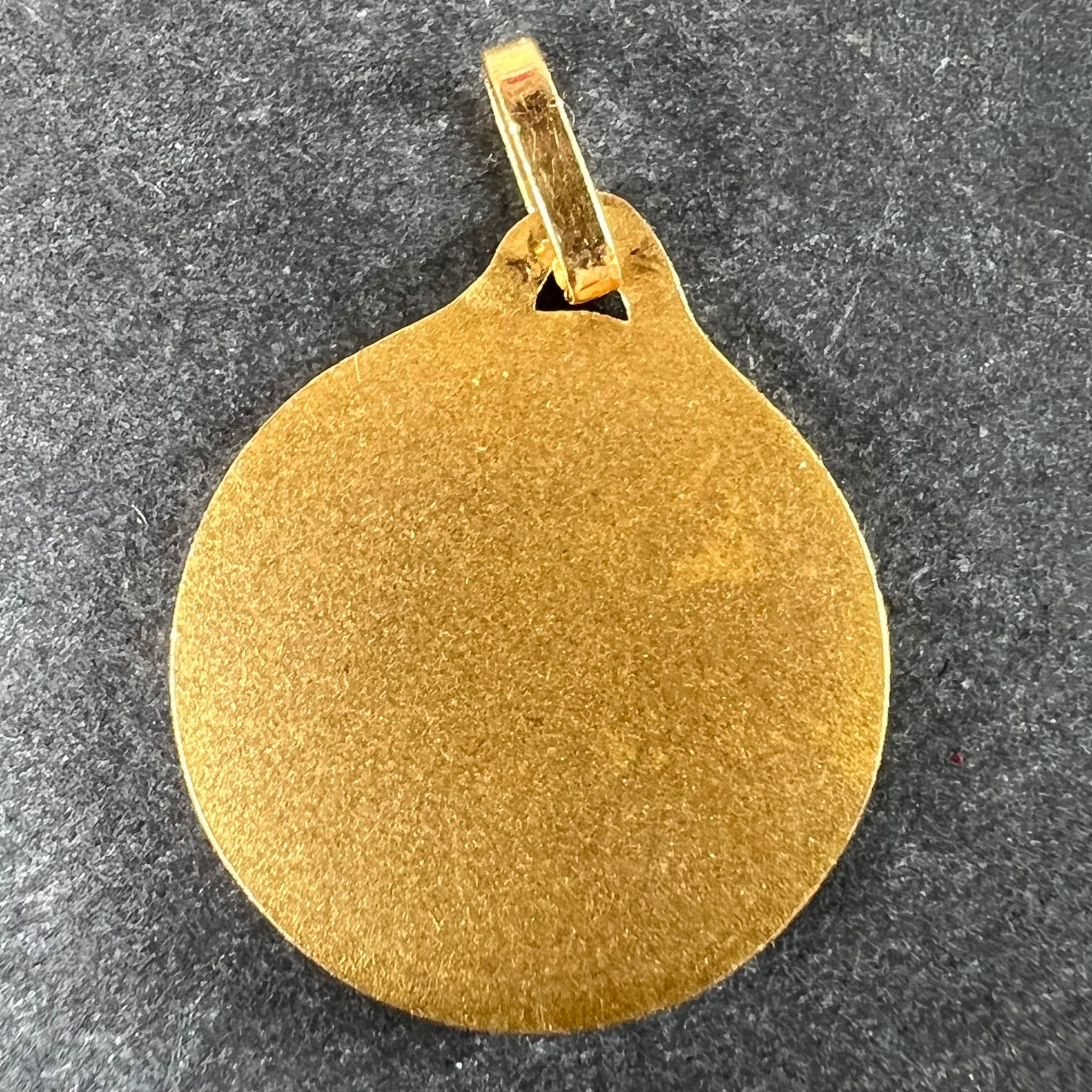 A French 18 karat (18K) yellow gold charm pendant depicting St Christopher as he carries the infant Christ across a river set in a faceted gold frame. Stamped with the eagle’s head for French manufacture and 18 carat gold, and an unknown maker’s mark.