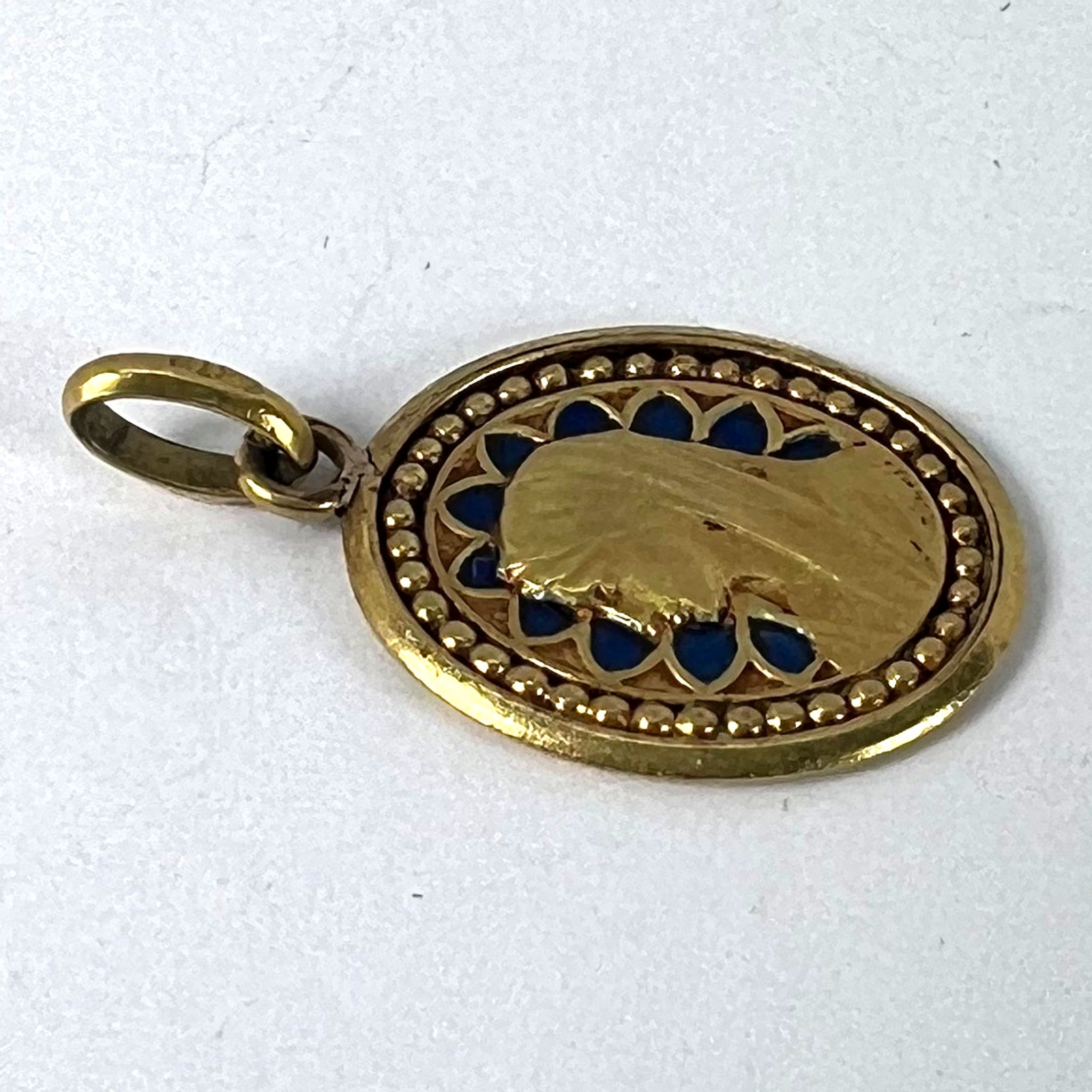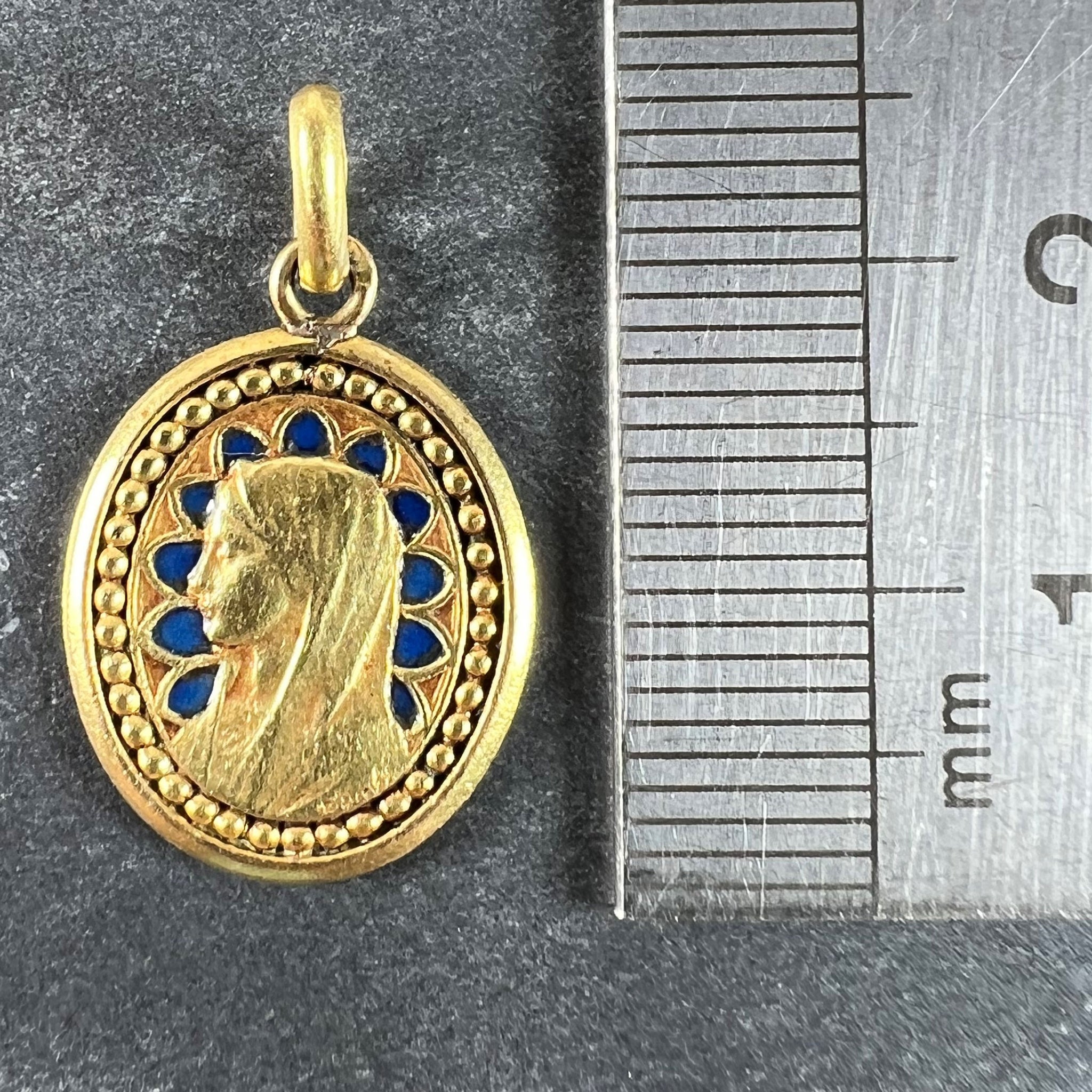 An antique French 18 karat (18K) yellow gold charm pendant designed as an oval medal depicting the Virgin Mary with blue enamel details. Signed E Dropsy, stamped with the eagle’s head for 18 karat gold and French manufacture.