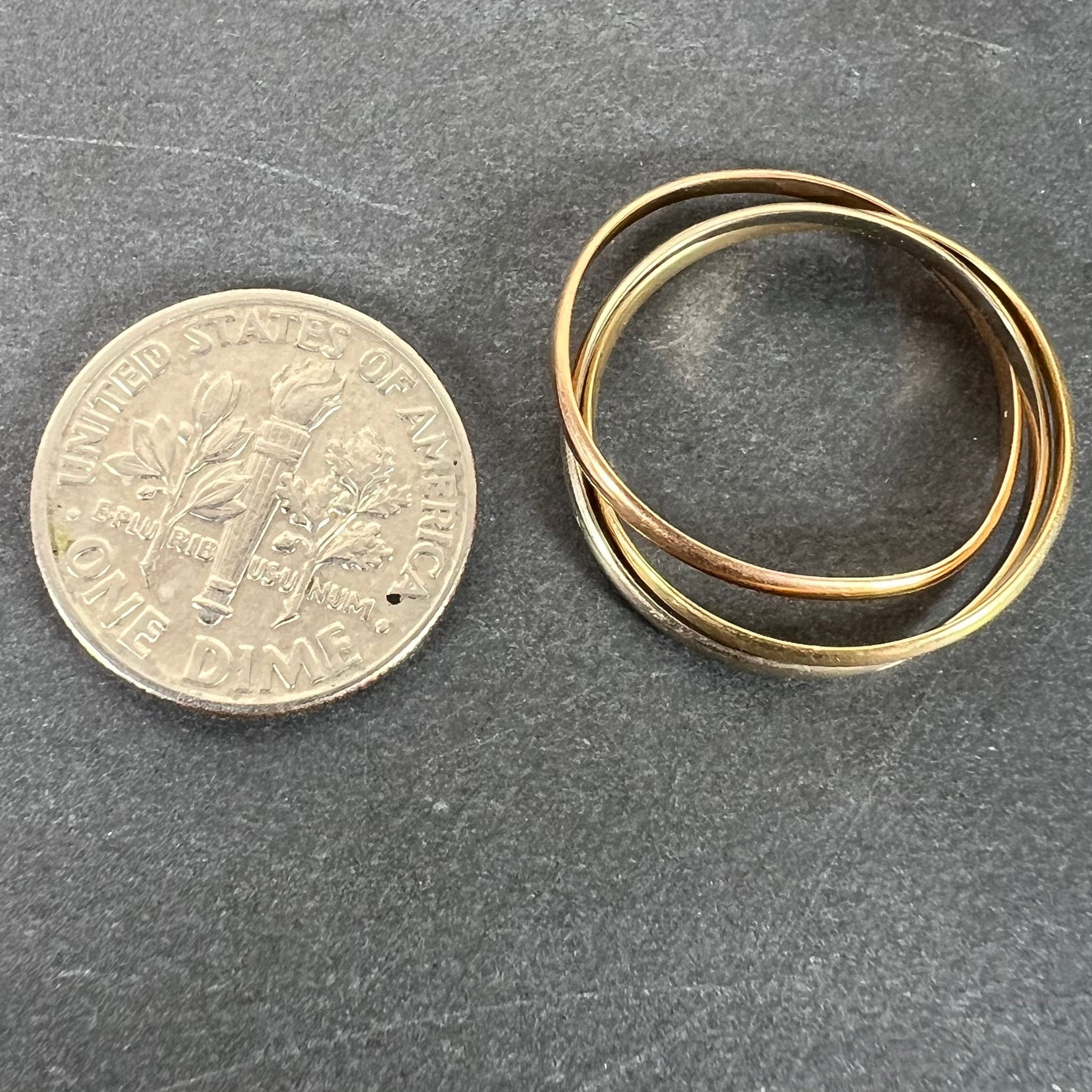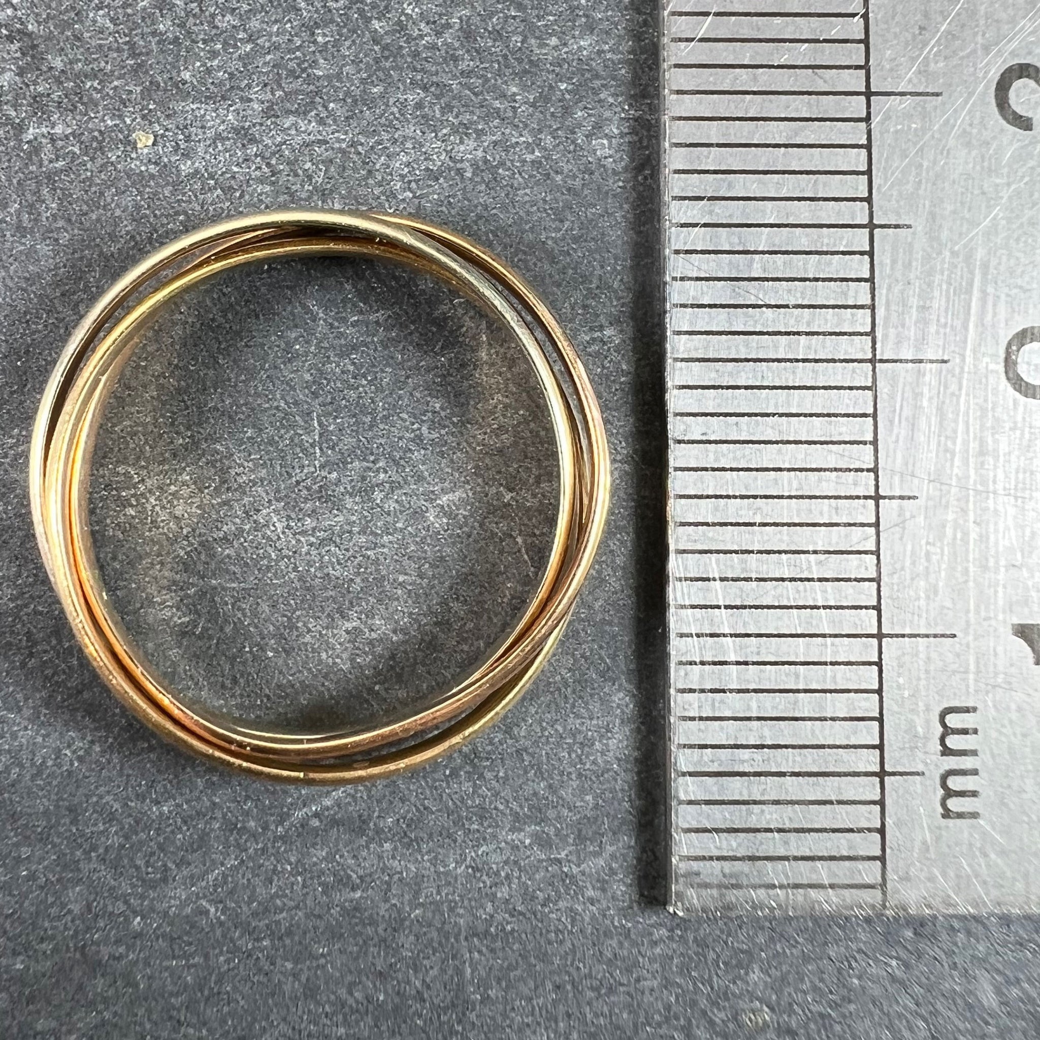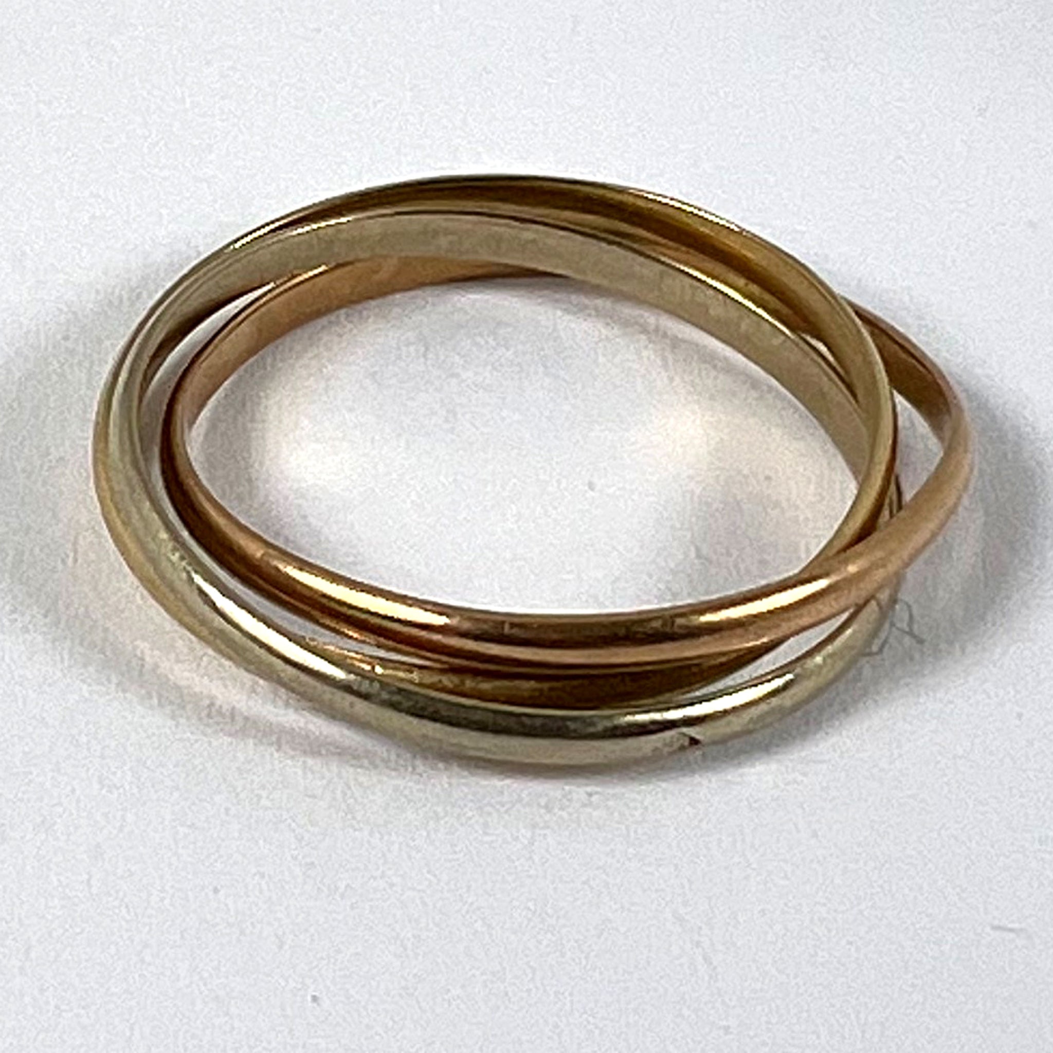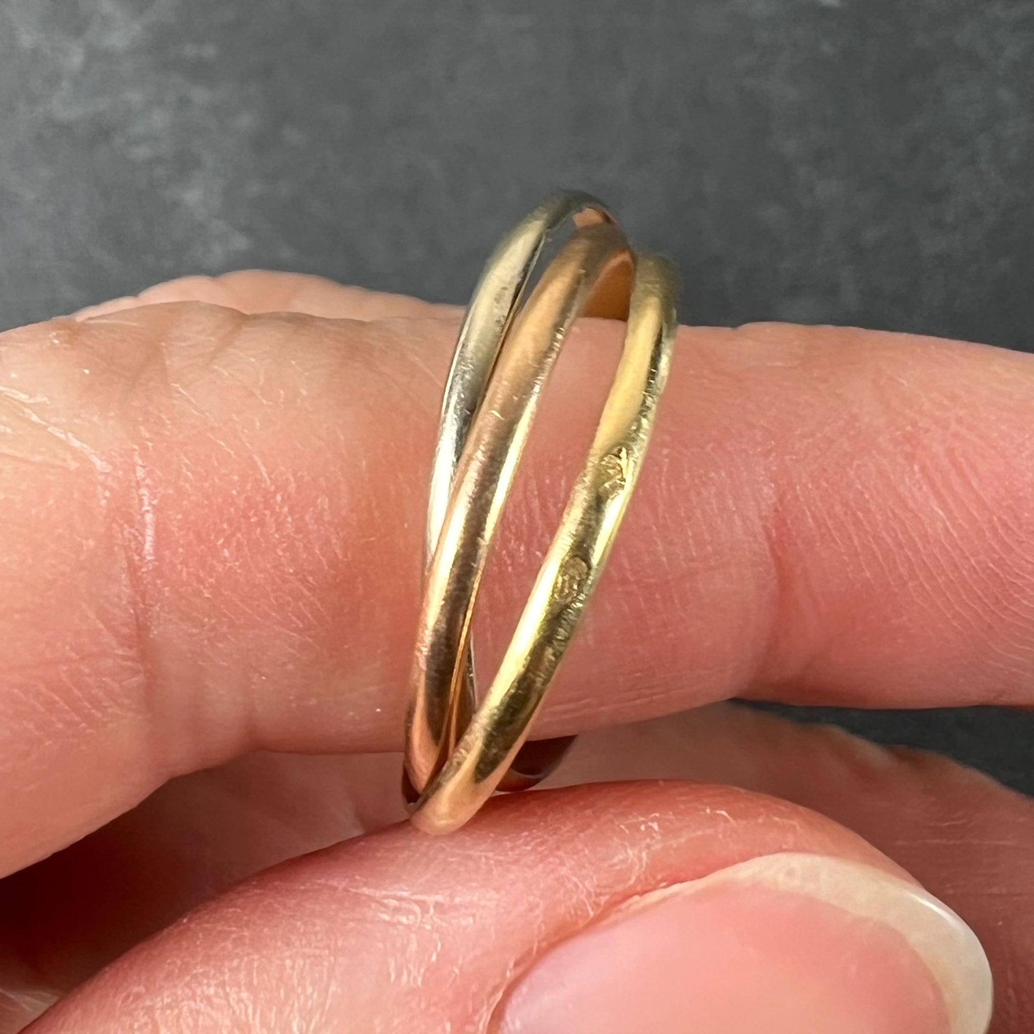 A vintage French 18 karat (18K) gold ring designed as three interlocked bands of white gold, rose gold and yellow gold in the trinity or Russian wedding ring style. Stamped with the eagle mark for 18 karat gold and French manufacture.
